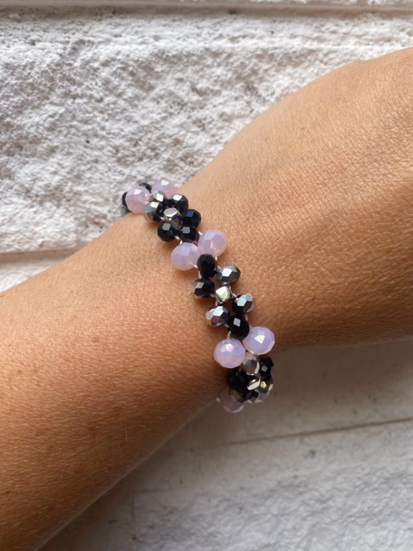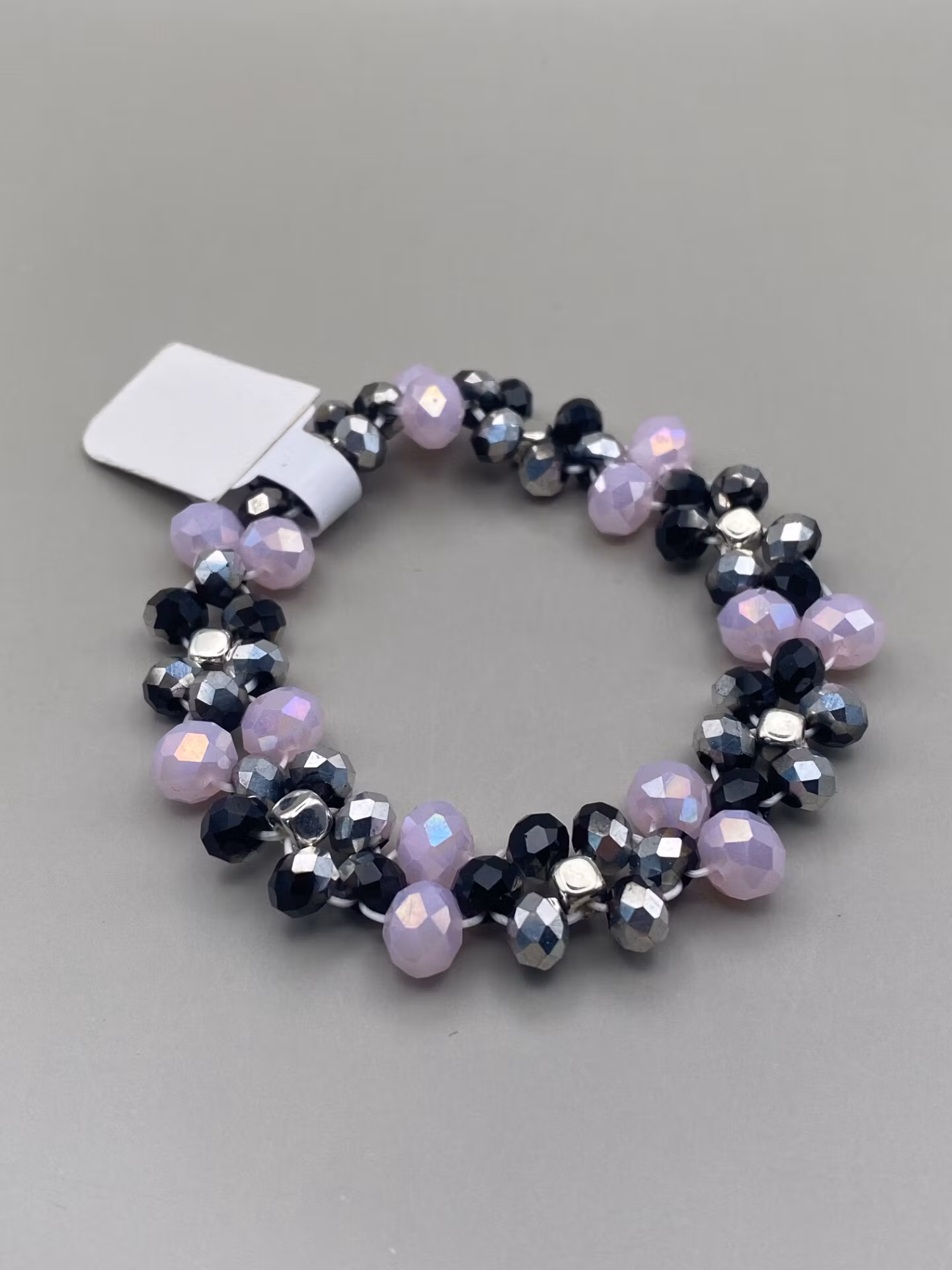 Elegant skimrande armband i ett fint mönster av silver och svartmellerade glaspärlor samt ljusrosa större skimrande glaspärlor, silverfärgade fyrkantiga detalje