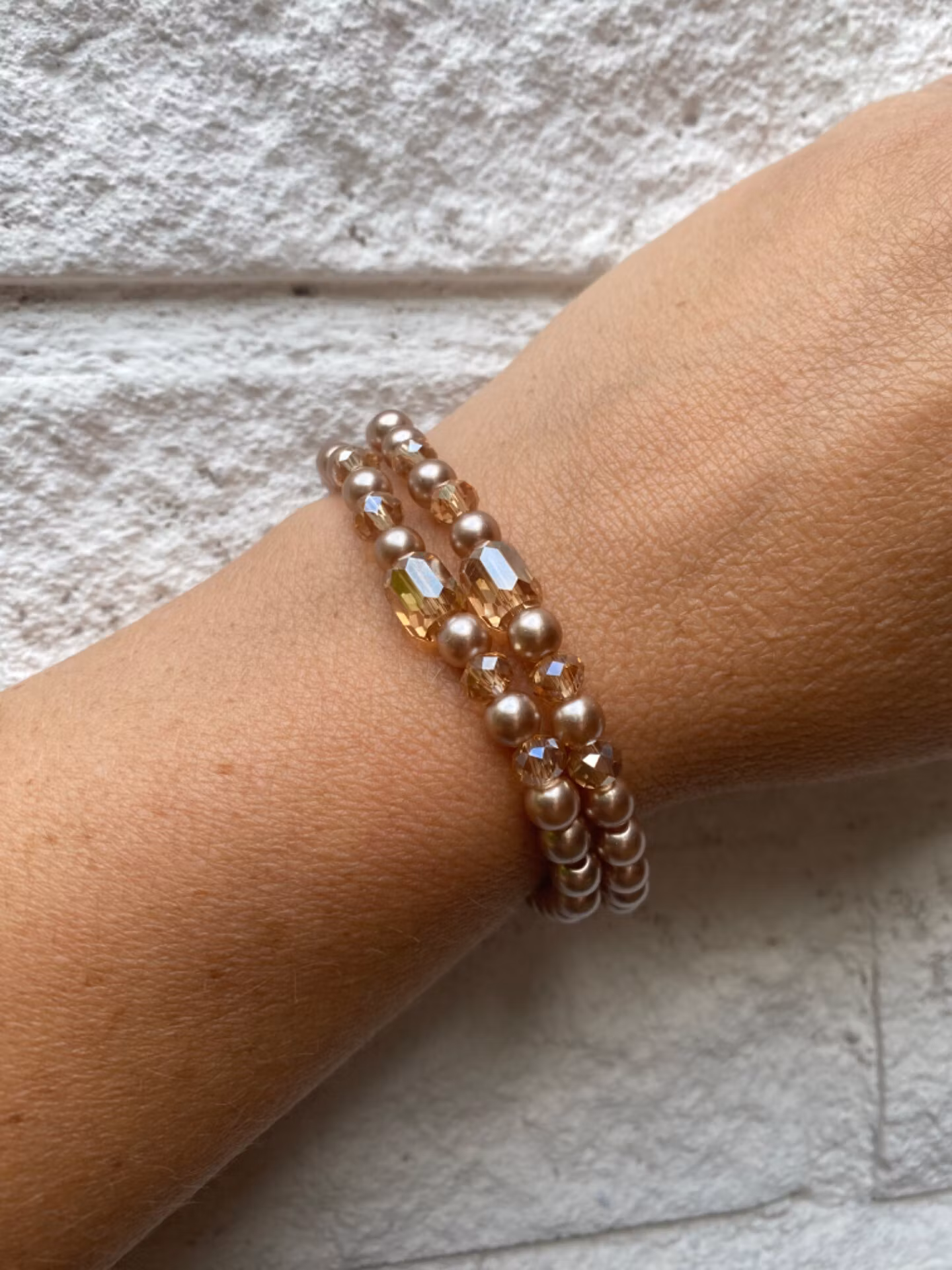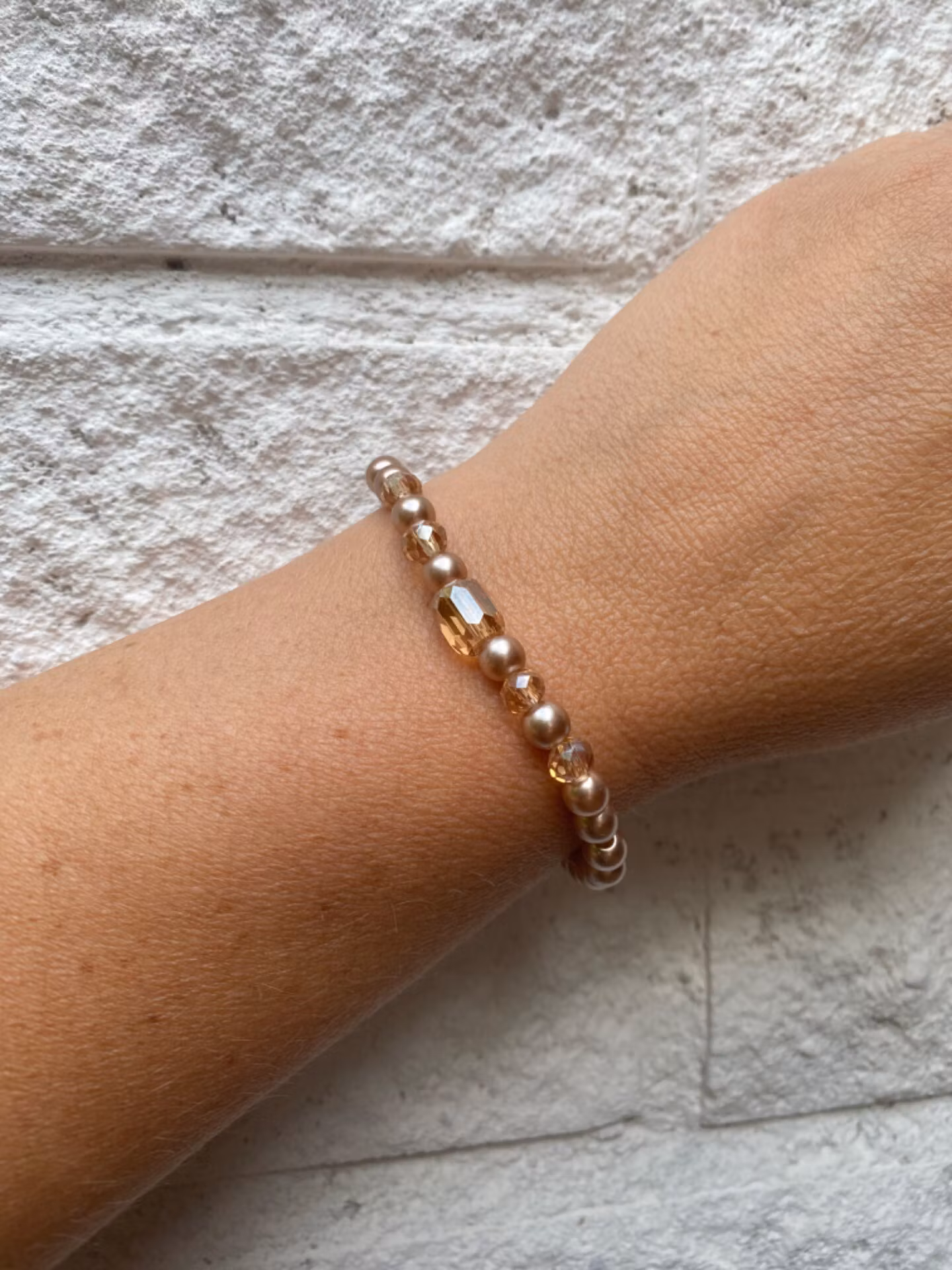 Elegant skimrande armband i beiga toner. Beiga/champagnefärgade pärlor varvat med något mörkare beiga glaspärlor och en något större avlång glaspärla i blickfånget.
