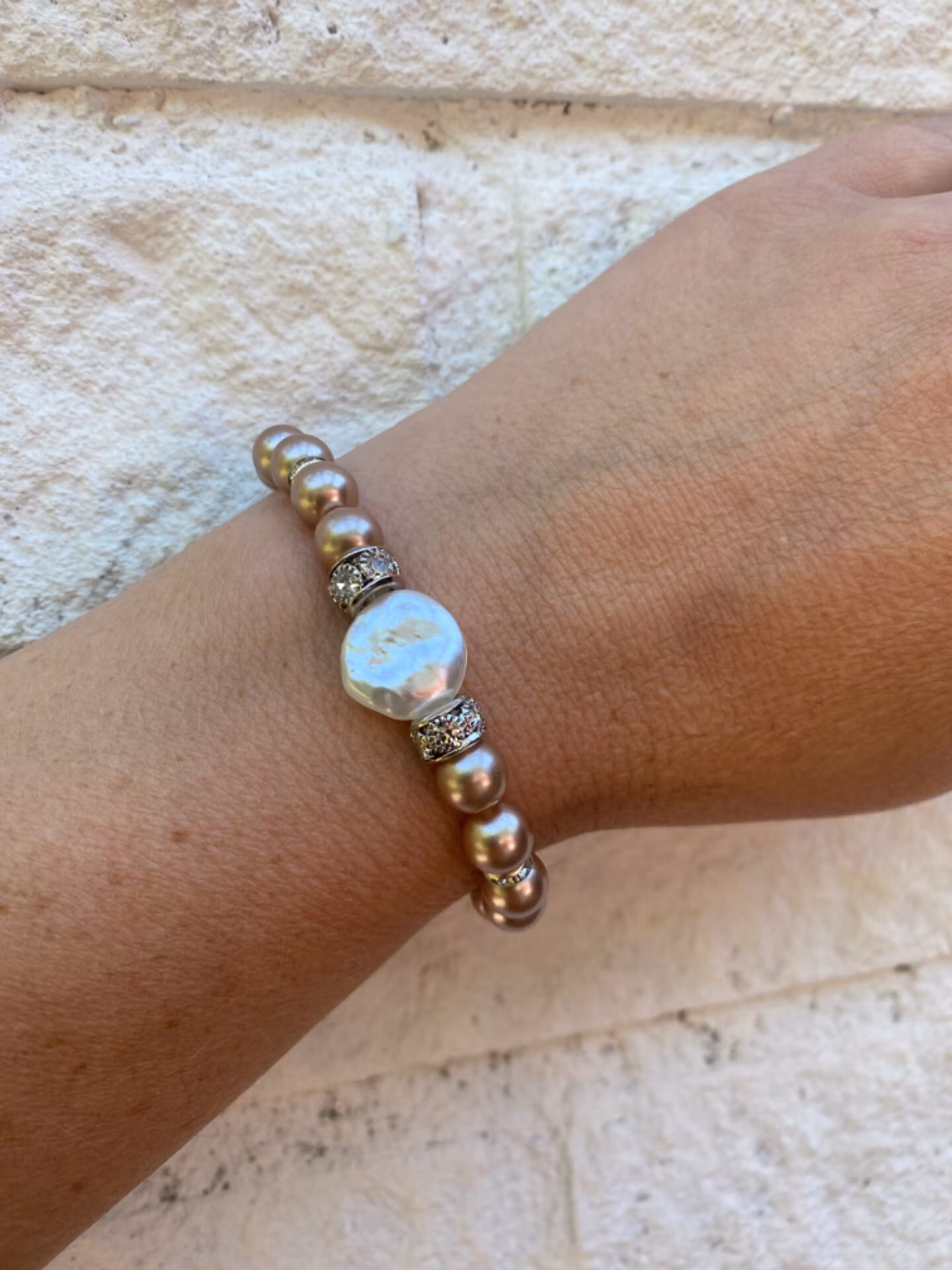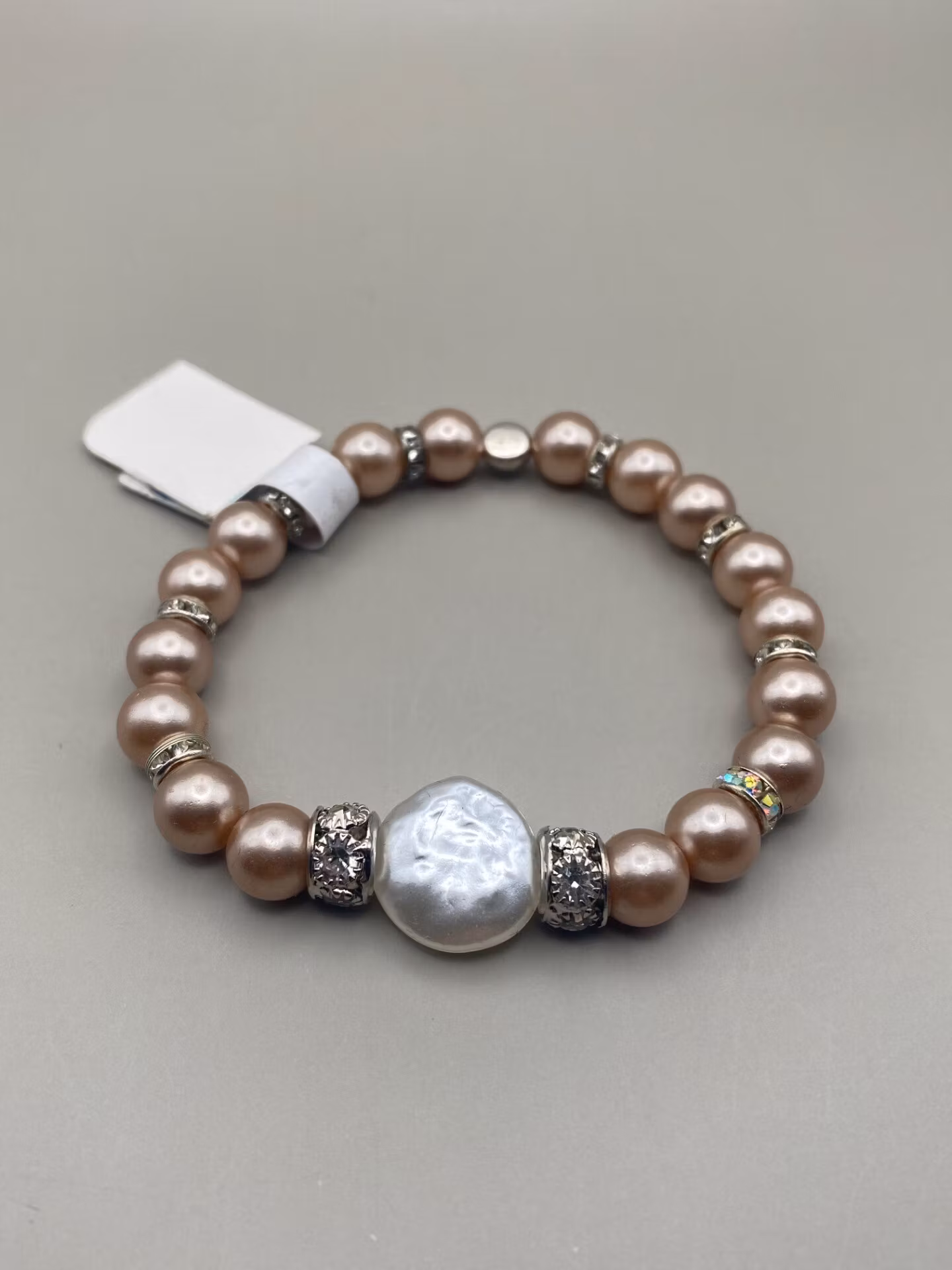 Armband i champagnefärgade pärlor, strassdetaljer och större vit pärla i blickfånget