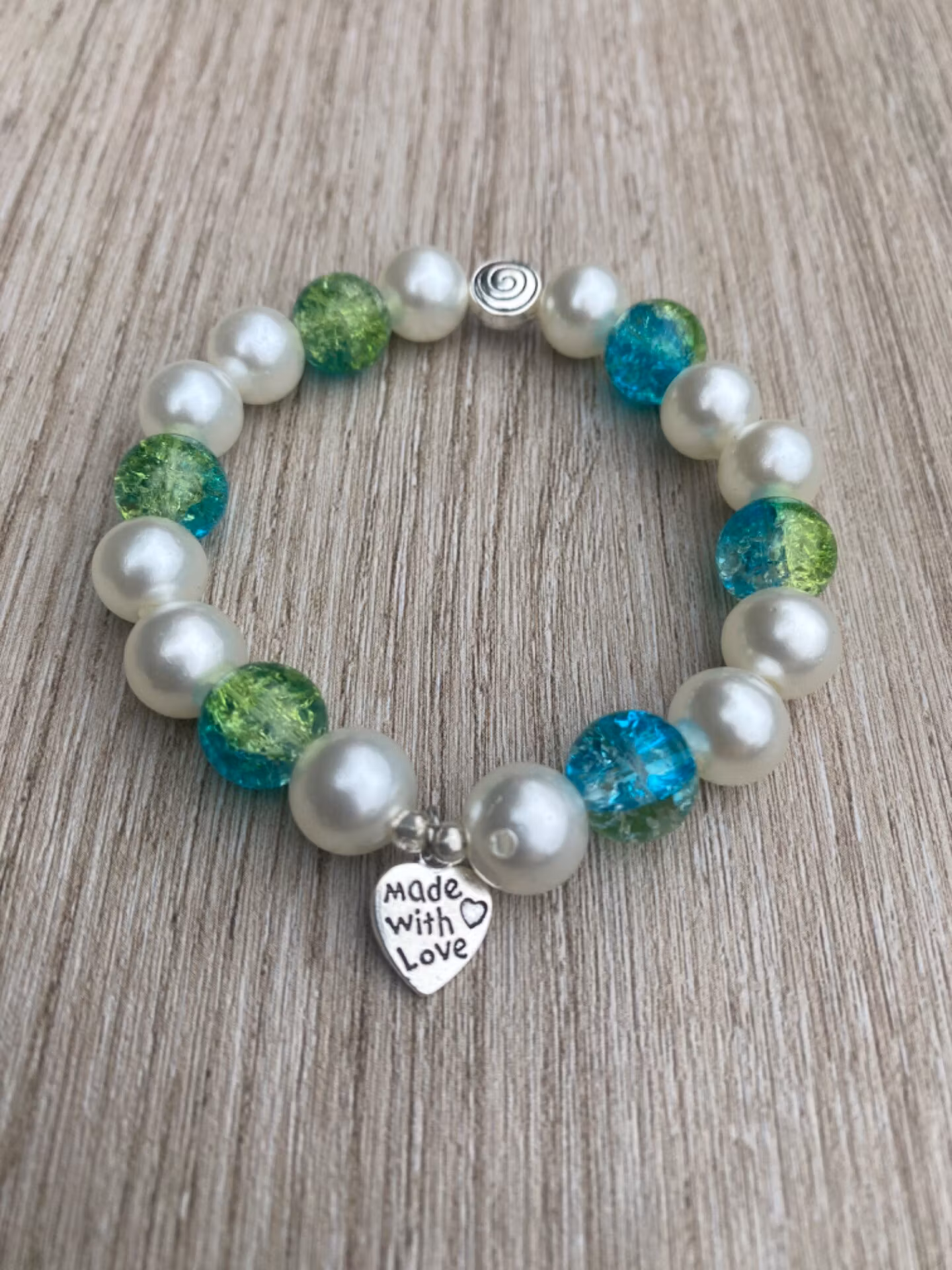 Snyggt armband i stora grön/turkosmellerade glaspärlor varvat med benvita vaxade pärlor, fin berlock.Pärlor 8mmVisas produkten "Tillfälligt slut" efter att du l