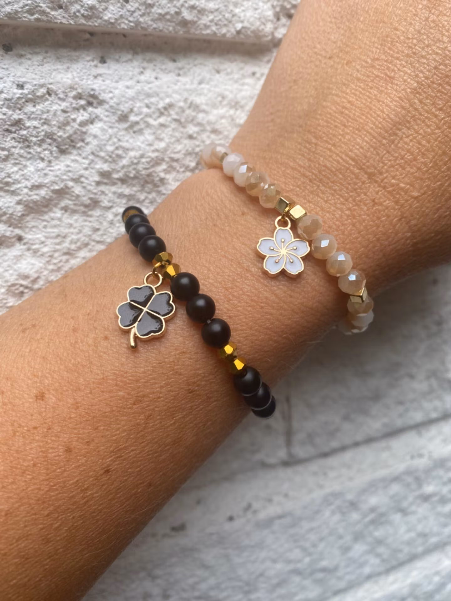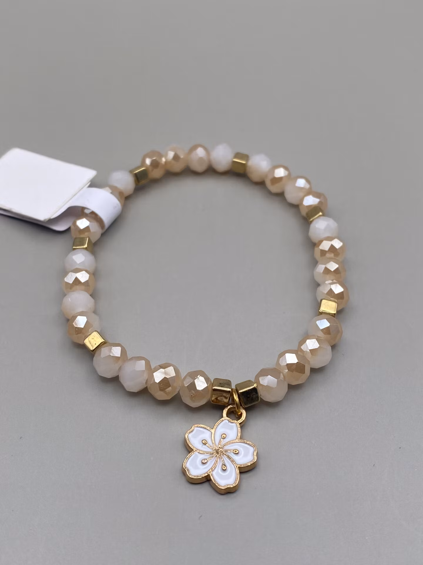Tjusigt armband i beige-aprikosmellerade glaspärlor varvat med guldfärgade fyrkantiga pärlor och fin berlock i form av vit blomma i blickfånget.