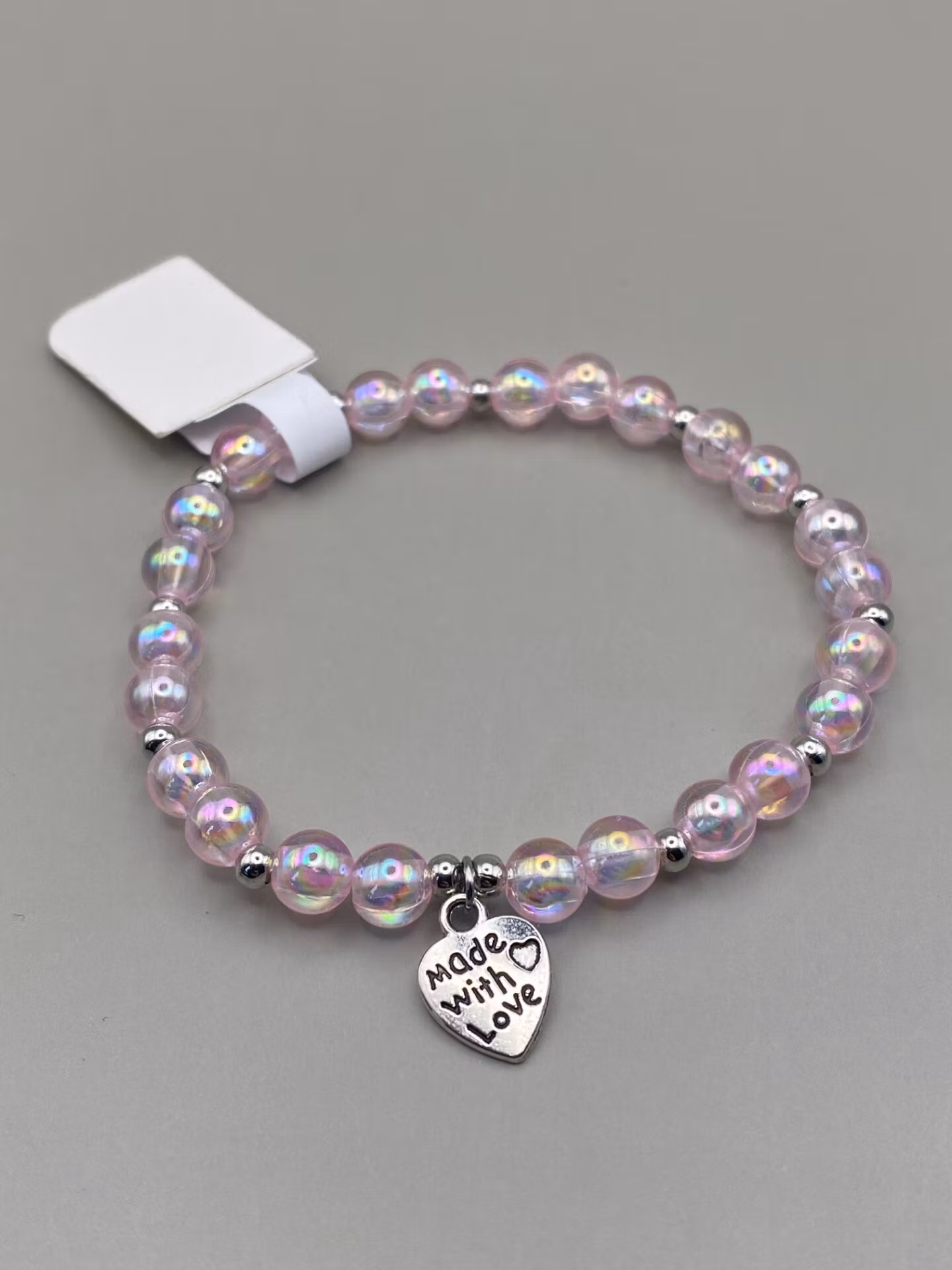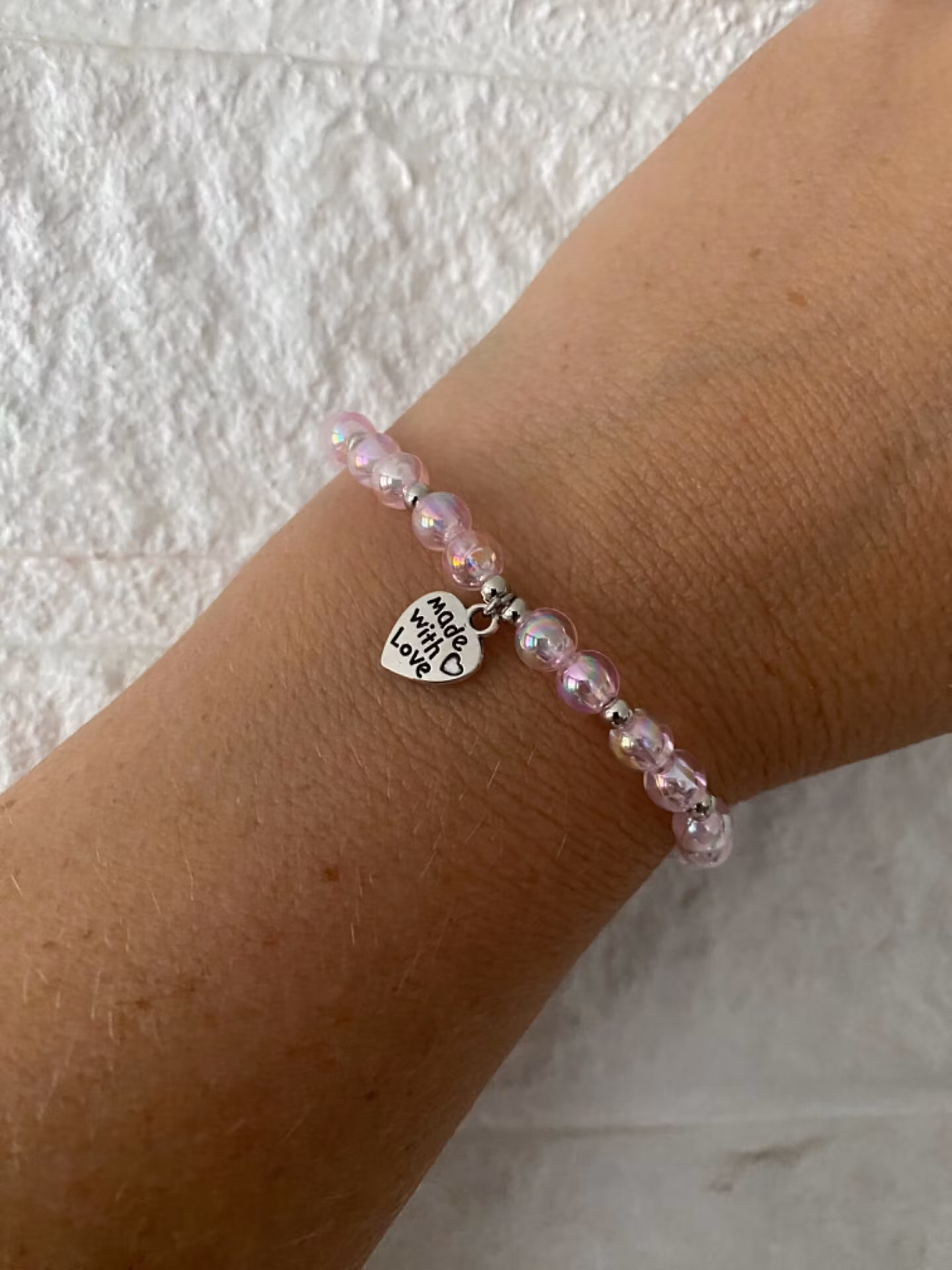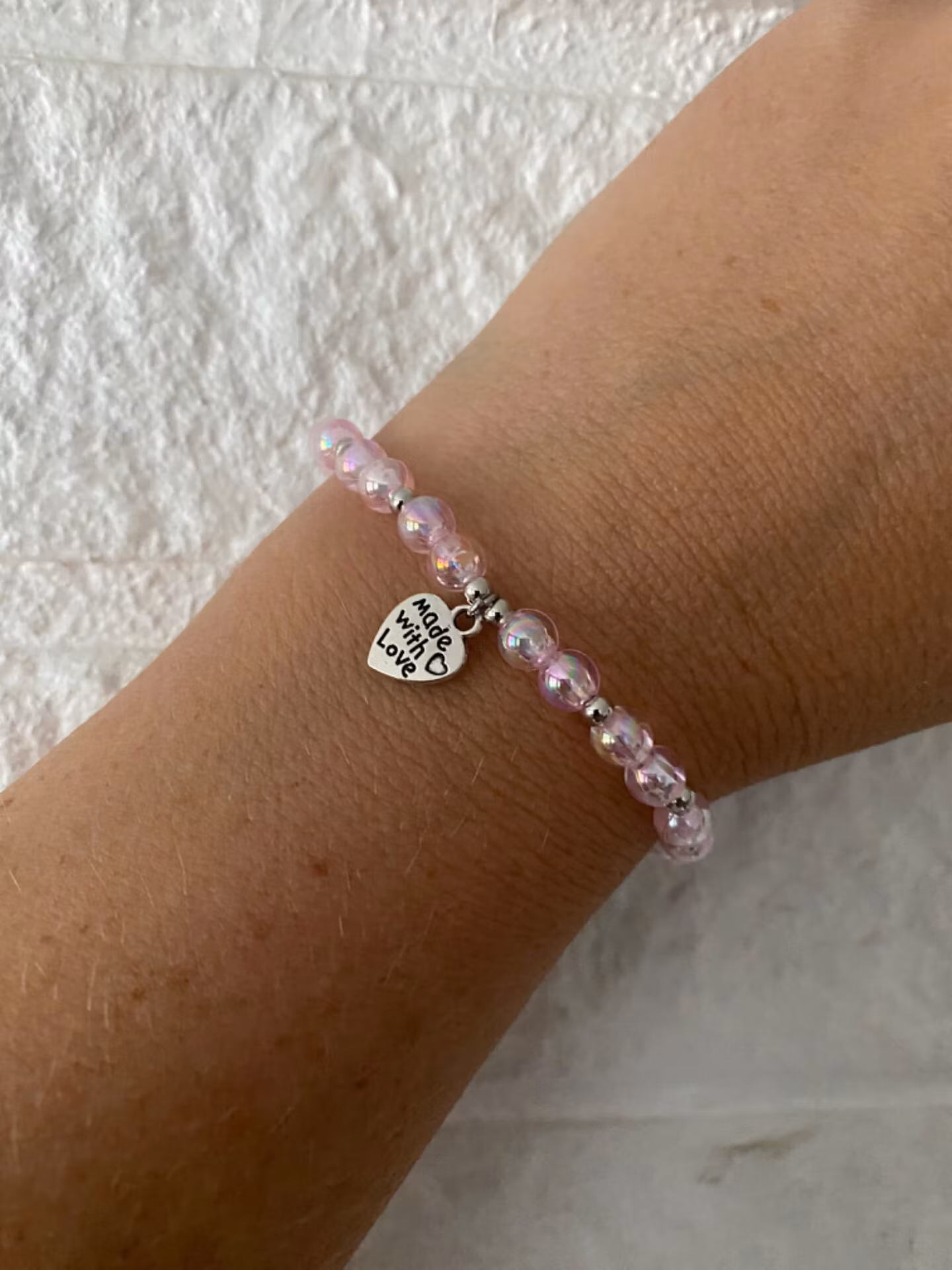 Tjusigt armband i mindre pärlor i rosa hologramiska pärlor varvat med silverfärgade små pärlor, berlock i blickfånget.