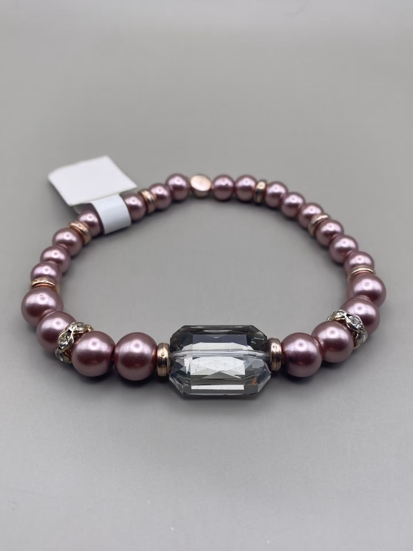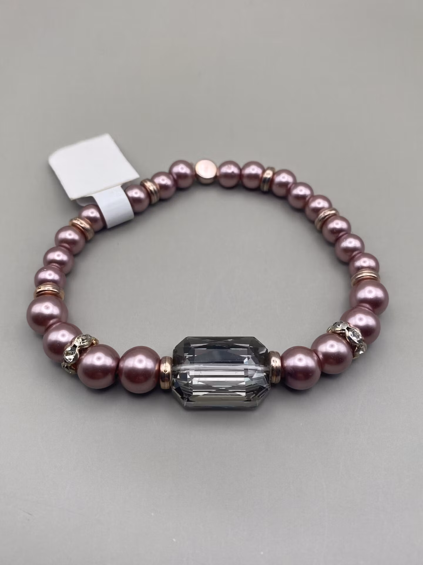 Pärlarmband i dovt lila vaxade glaspärlor, strassdetaljer och en stor fyrkantig ljusgrå glaspärla i blickfånget