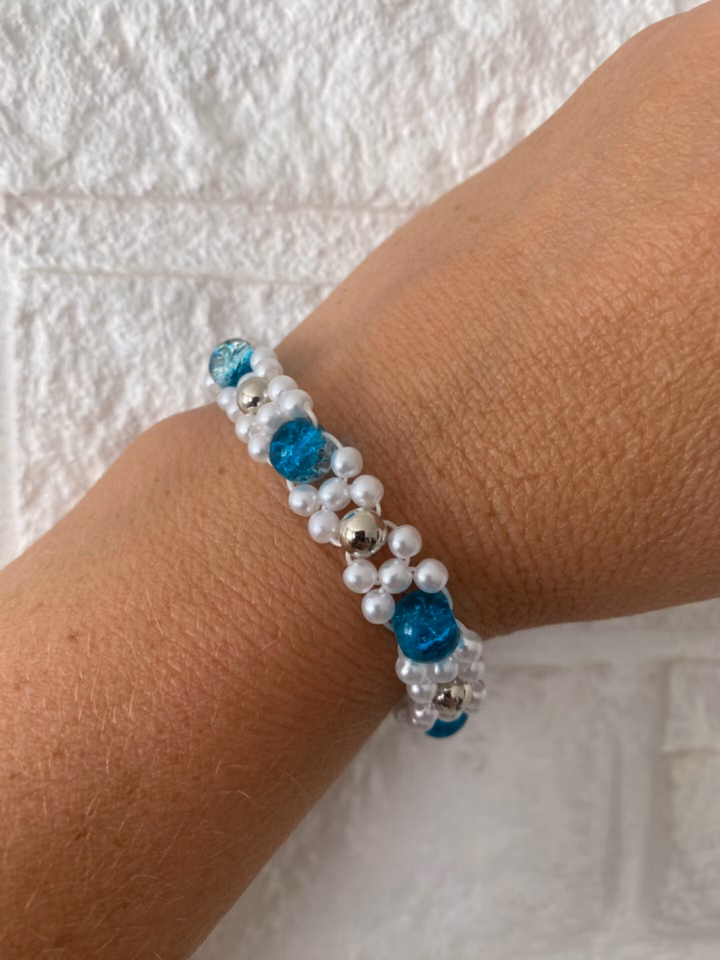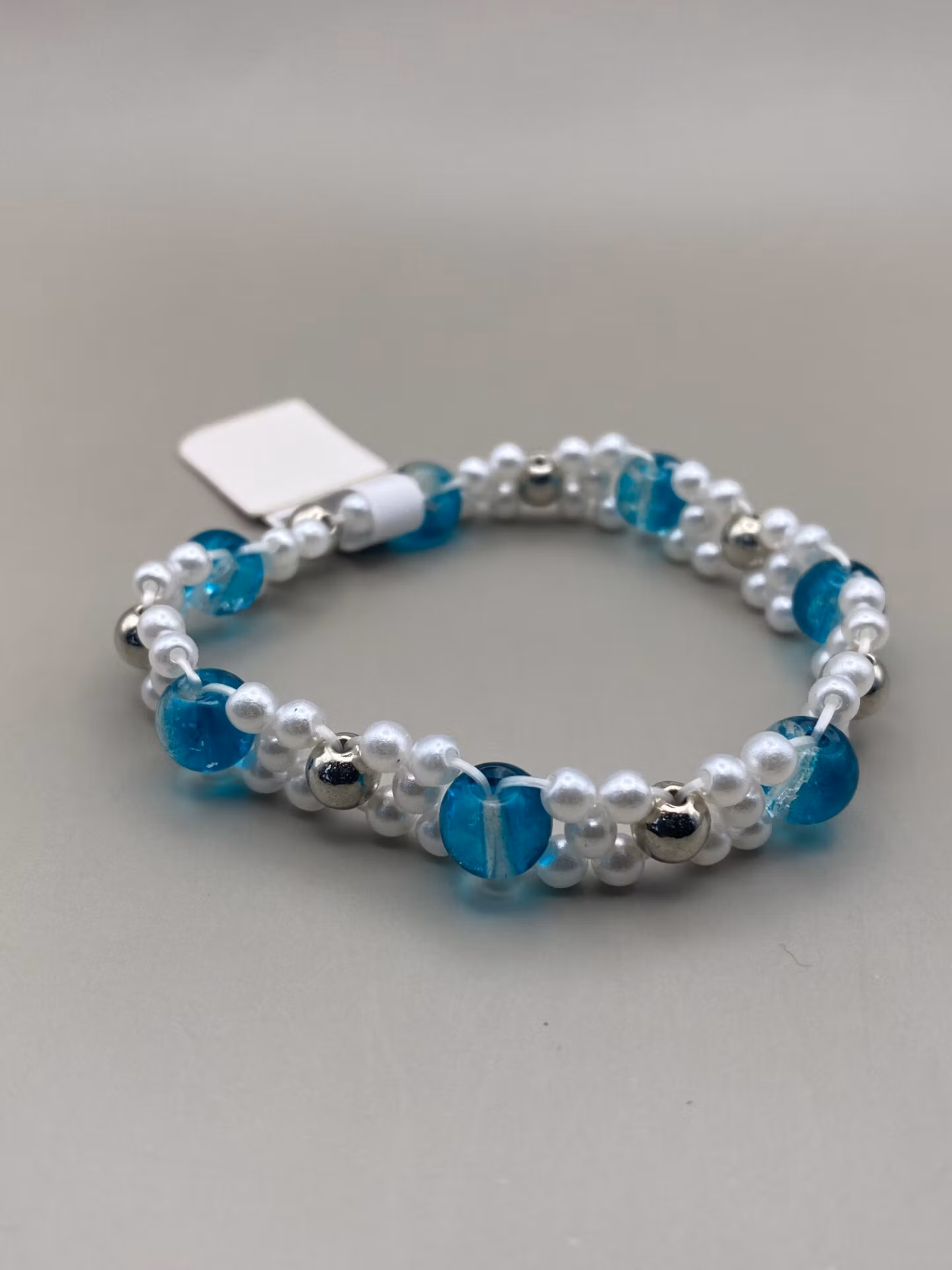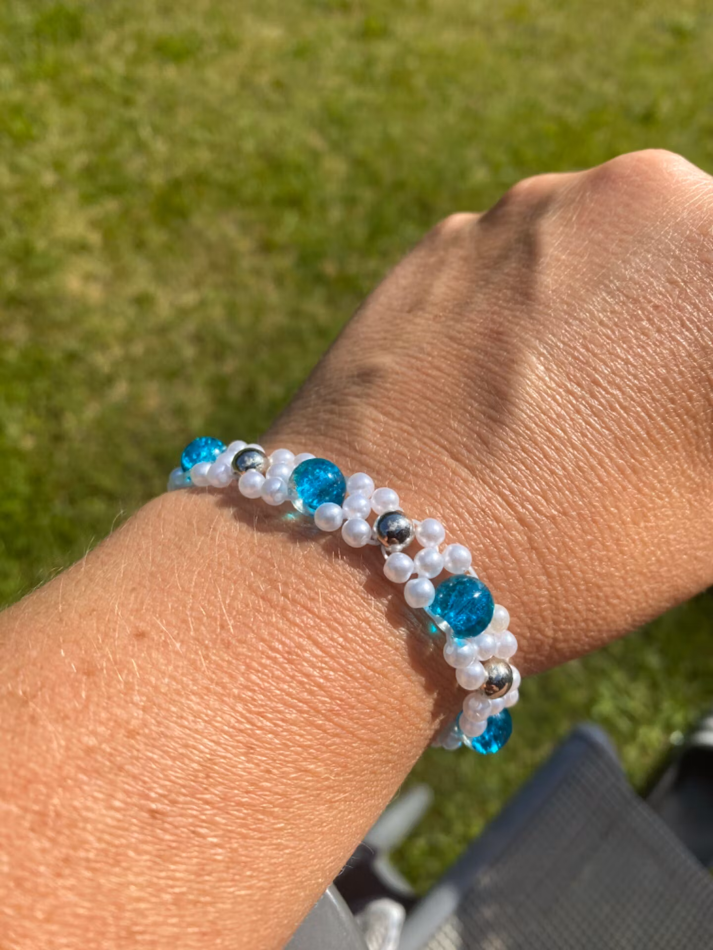 Fint flerradigt armband i små pärlor i vitt och turkosa färger.
