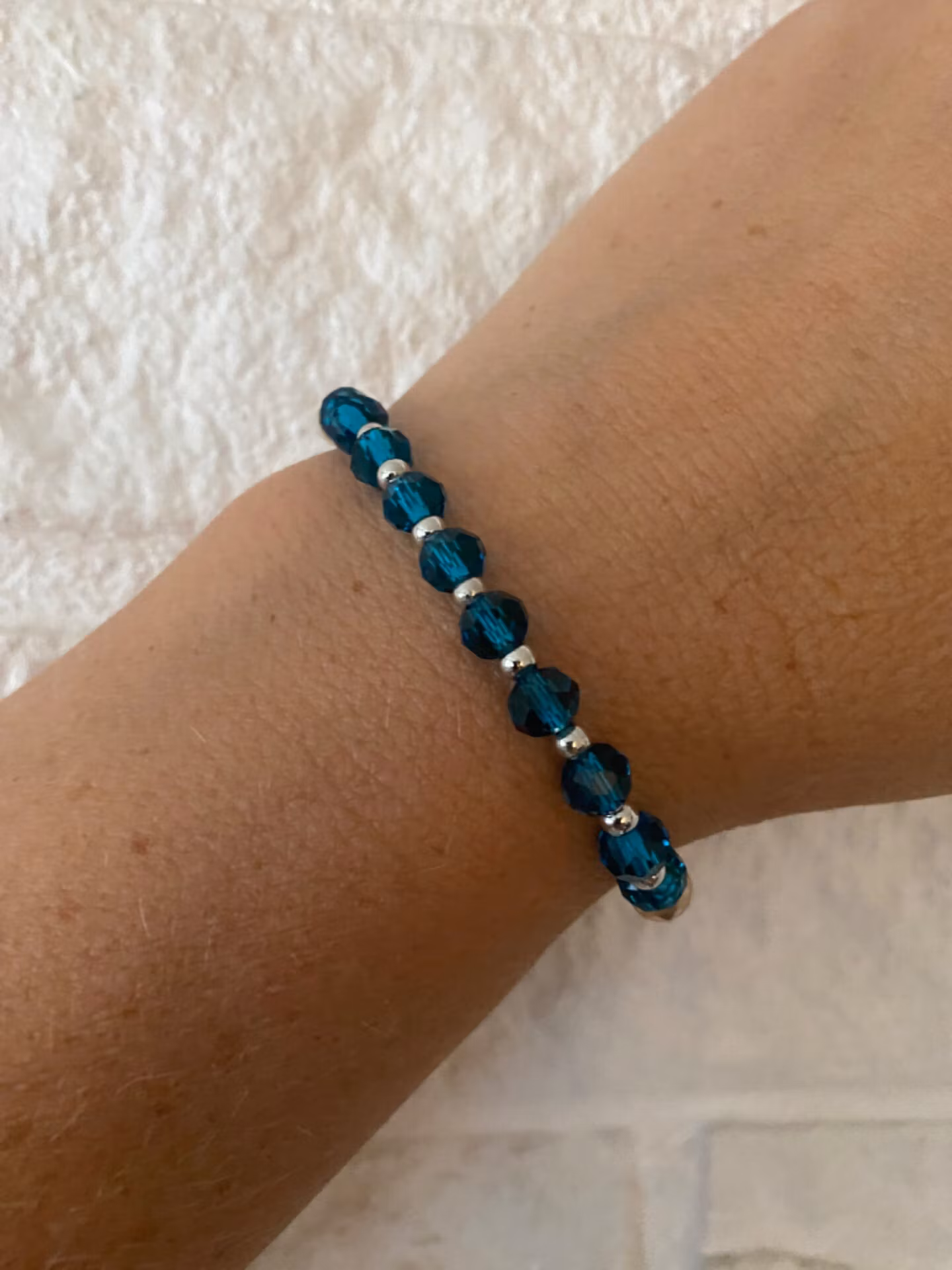 Fint armband i petrolfärgade glaspärlor varvat med små silverfärgade pärlor i blickfånget. Benvita pärlor varvat med små silverfärgade pärlor baktill, avskiljt