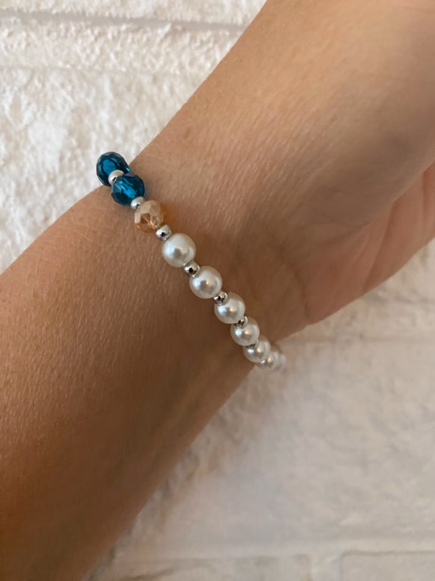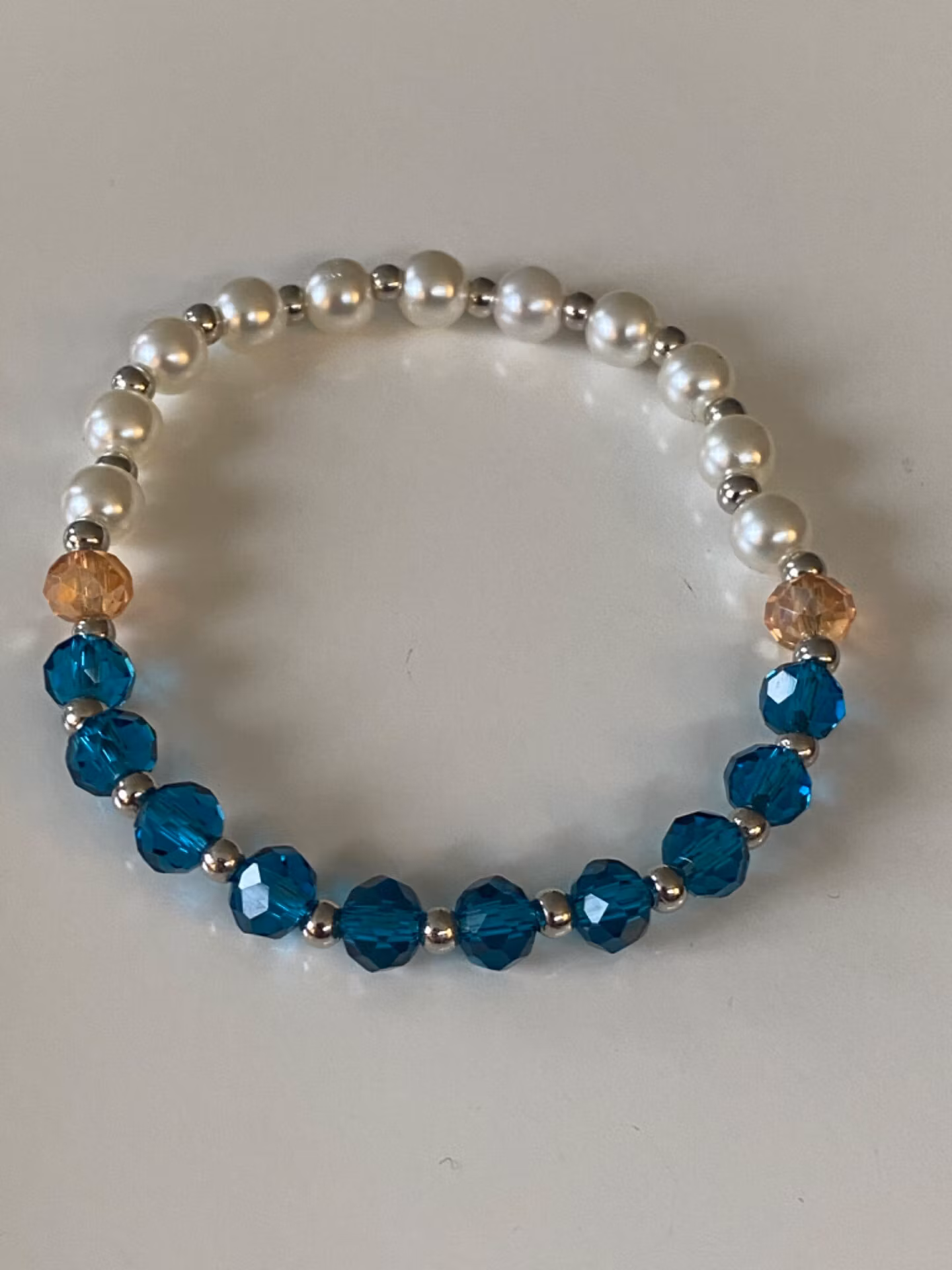 Fint armband i petrolfärgade glaspärlor varvat med små silverfärgade pärlor i blickfånget. Benvita pärlor varvat med små silverfärgade pärlor baktill, avskiljt med beige glaspärla från petrol-färgade pärlorna.