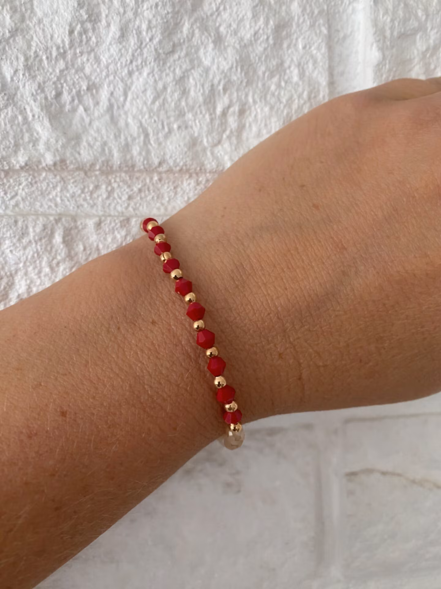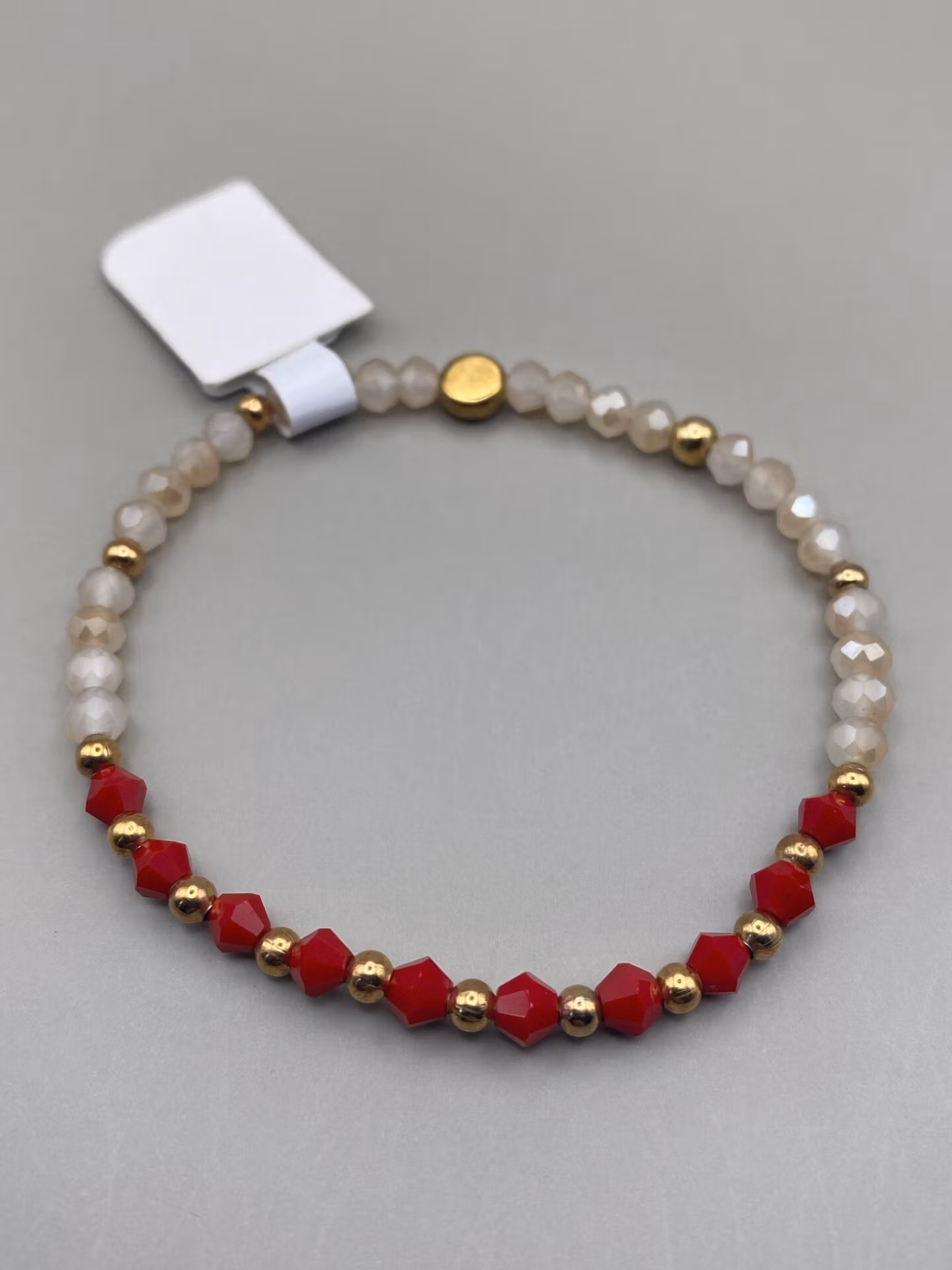 Stiligt armband i små knallröda glaspärlor varvat med guldfärgade små pärlor i blickfånget. Aprikosa/beige mellerade glaspärlor runt om varvat med guldfärgade små pärlor.