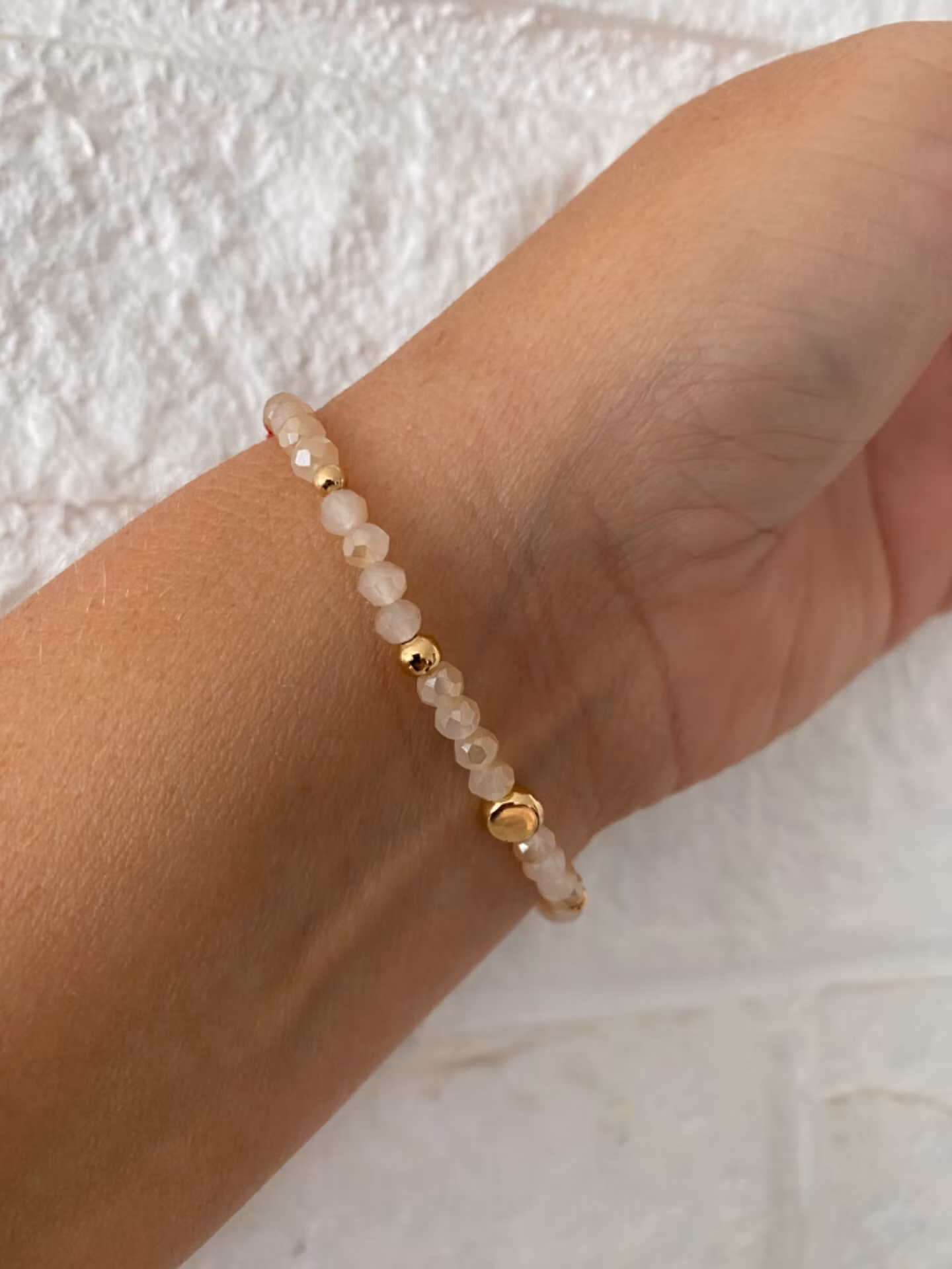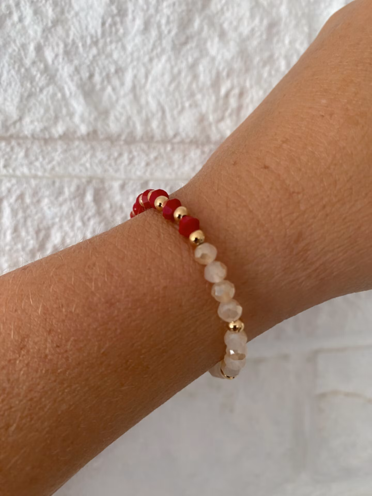 Stiligt armband i små knallröda glaspärlor varvat med guldfärgade små pärlor i blickfånget. Aprikosa/beige mellerade glaspärlor runt om varvat med guldfärgade s