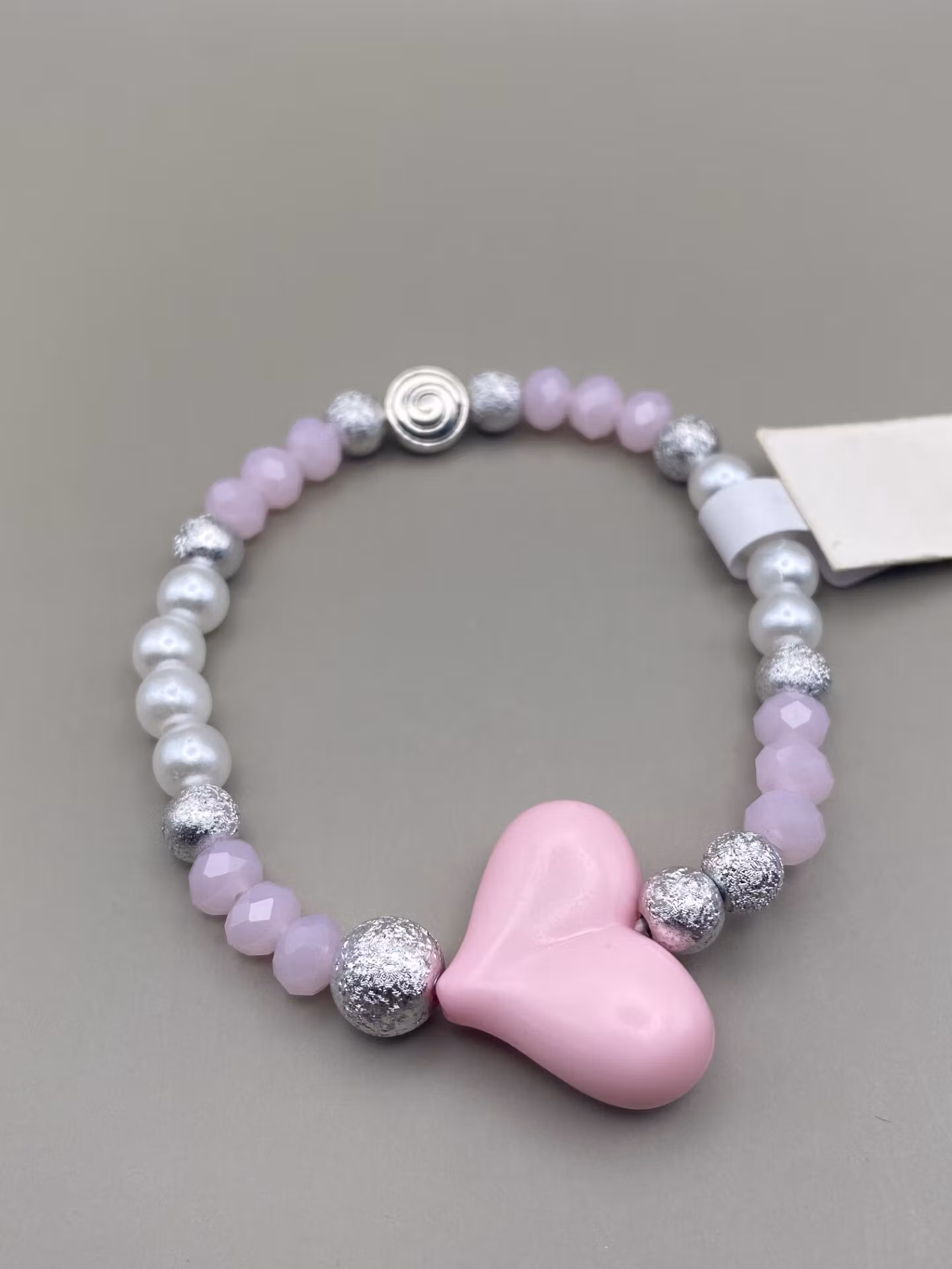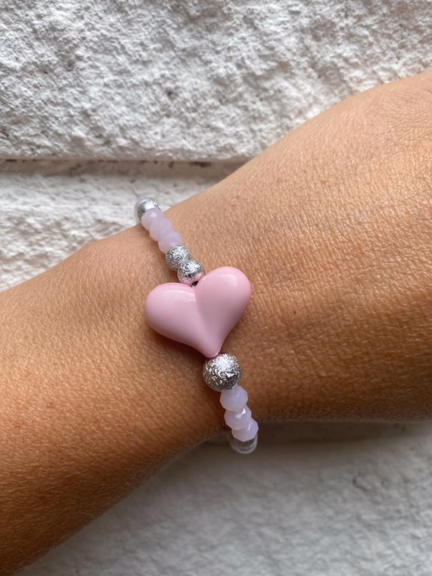 Fint armband i varvat ljusrosa frostade glaspärlor, vita pärlor och borstat silverfärgade pärlor. Stort pastellrosa hjärta i blickfånget.