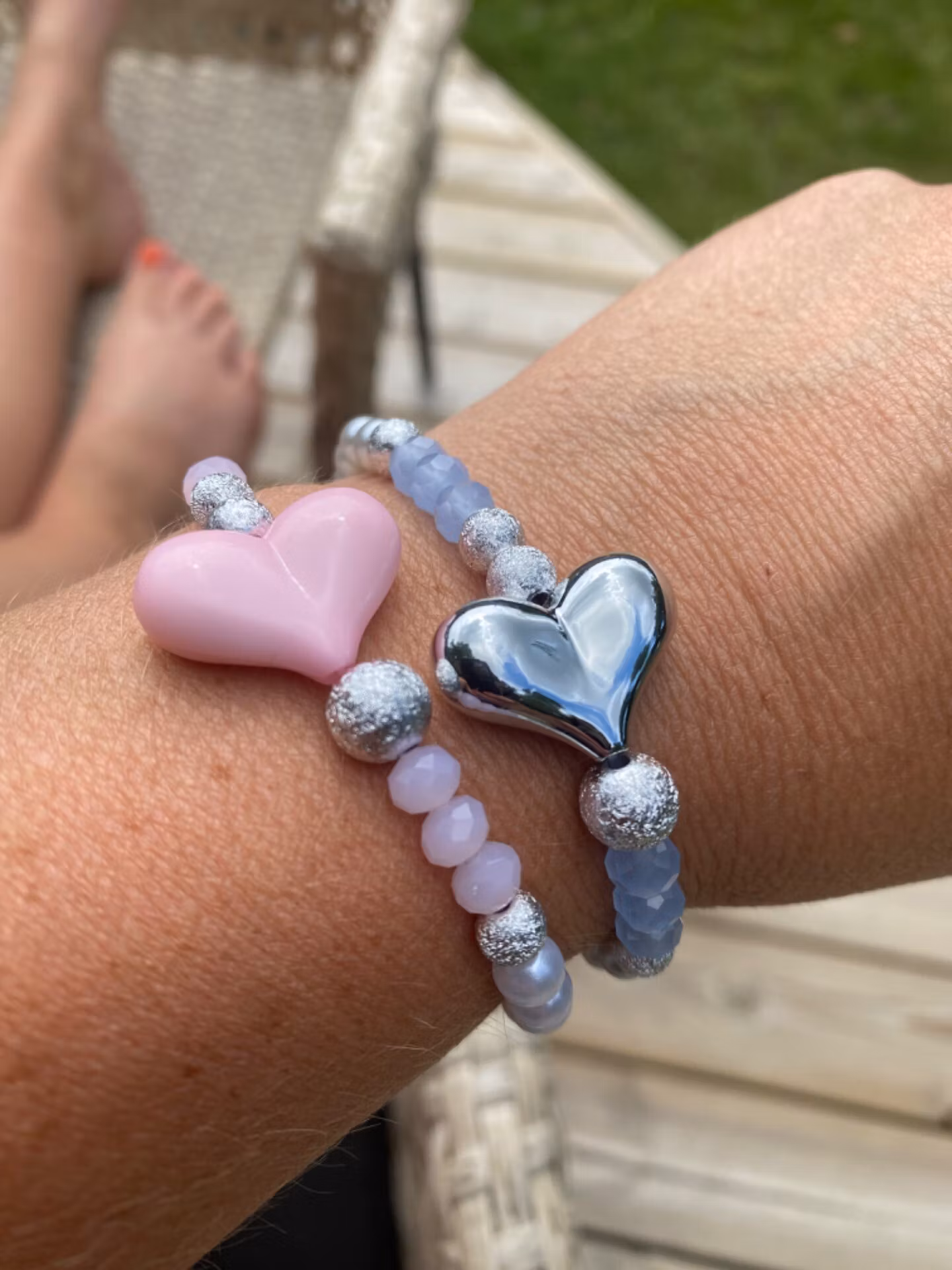 Fint armband i varvat ljusrosa frostade glaspärlor, vita pärlor och borstat silverfärgade pärlor. Stort pastellrosa hjärta i blickfånget.Pärlor 6mmVisas produkt