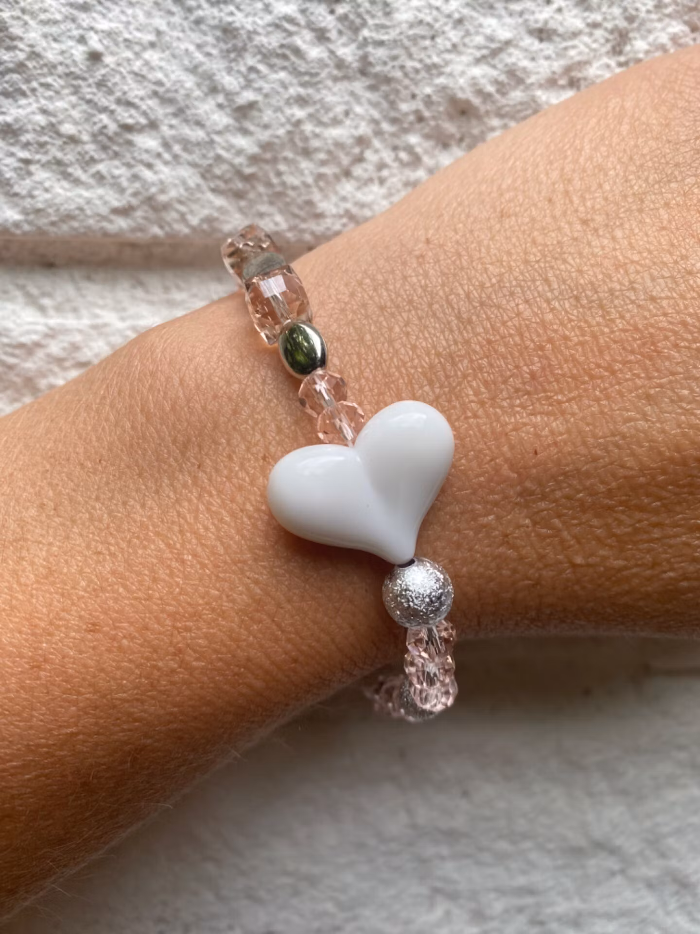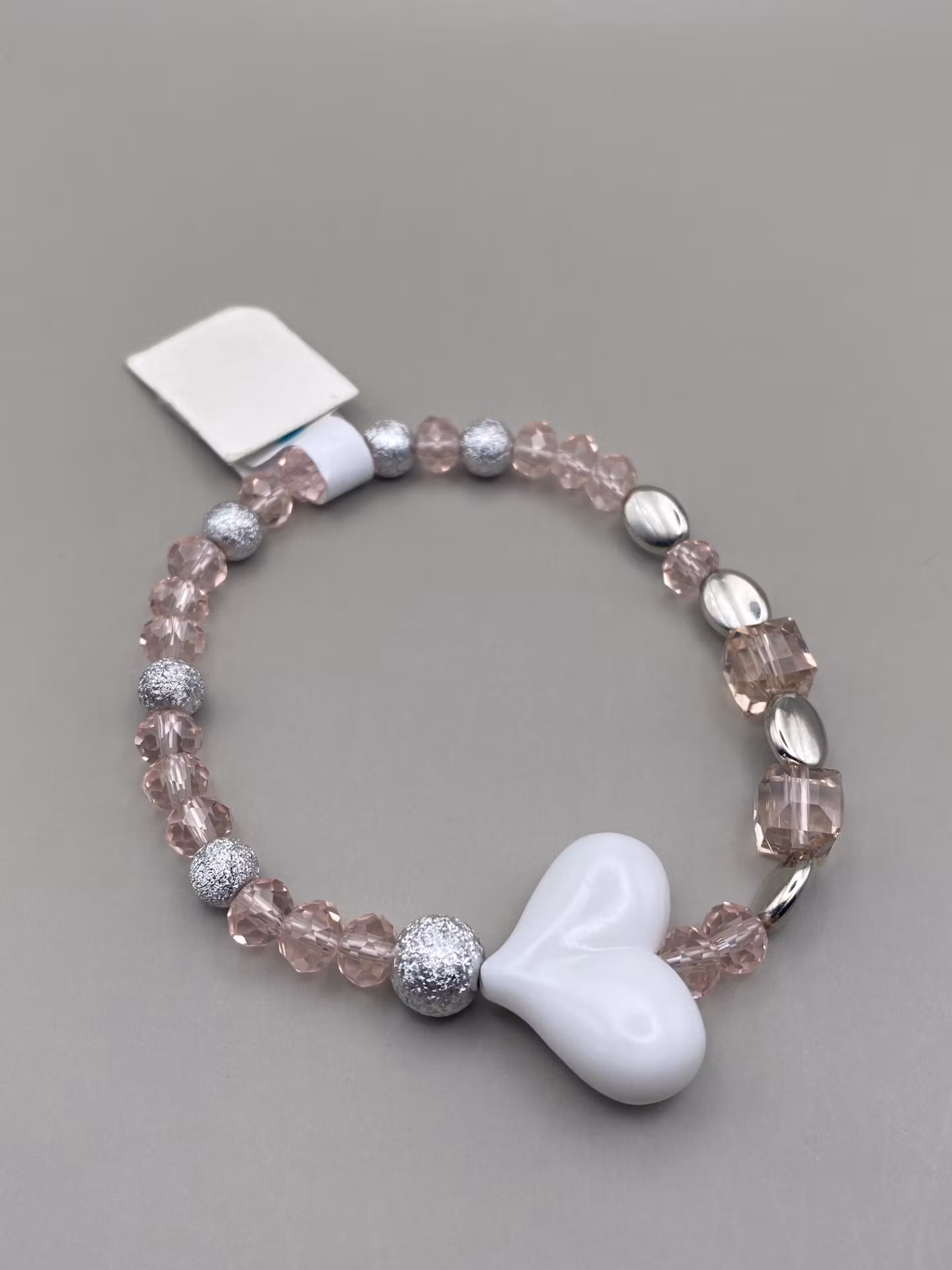 Fint armband i varvat ljusrosa glaspärlor, ljusrosa fyrkantiga glaspärlor, borstat silverfärgade pärlor samt silverfärgade platta avlånga pärlor. Stort vitt hjärta i blickfånget.