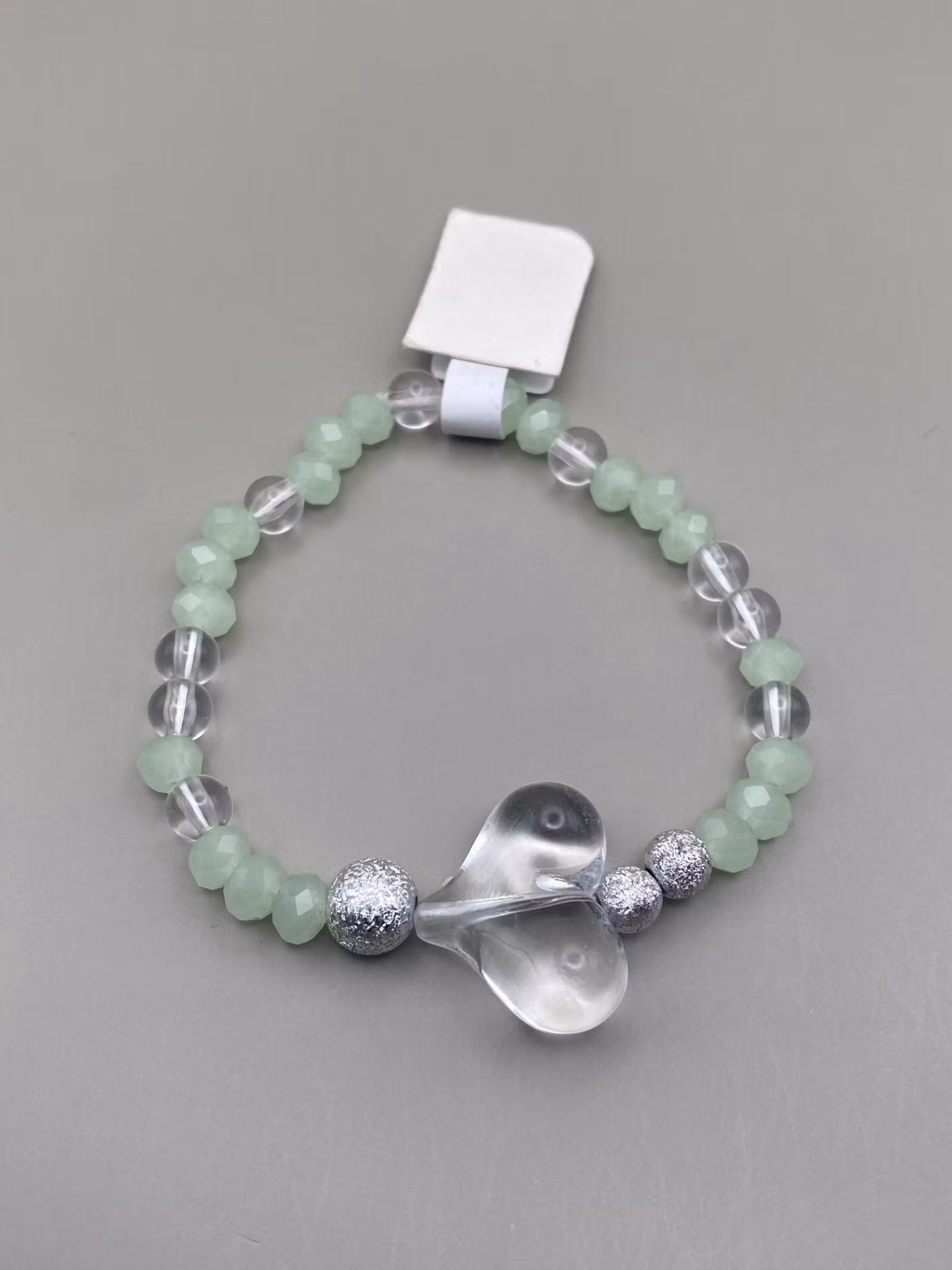 Fint armband i varvat ljusgröna glaspärlor och genomskinliga pärlor samt borstat silverfärgade pärlor. Stort genomskinligt hjärta i blickfånget.