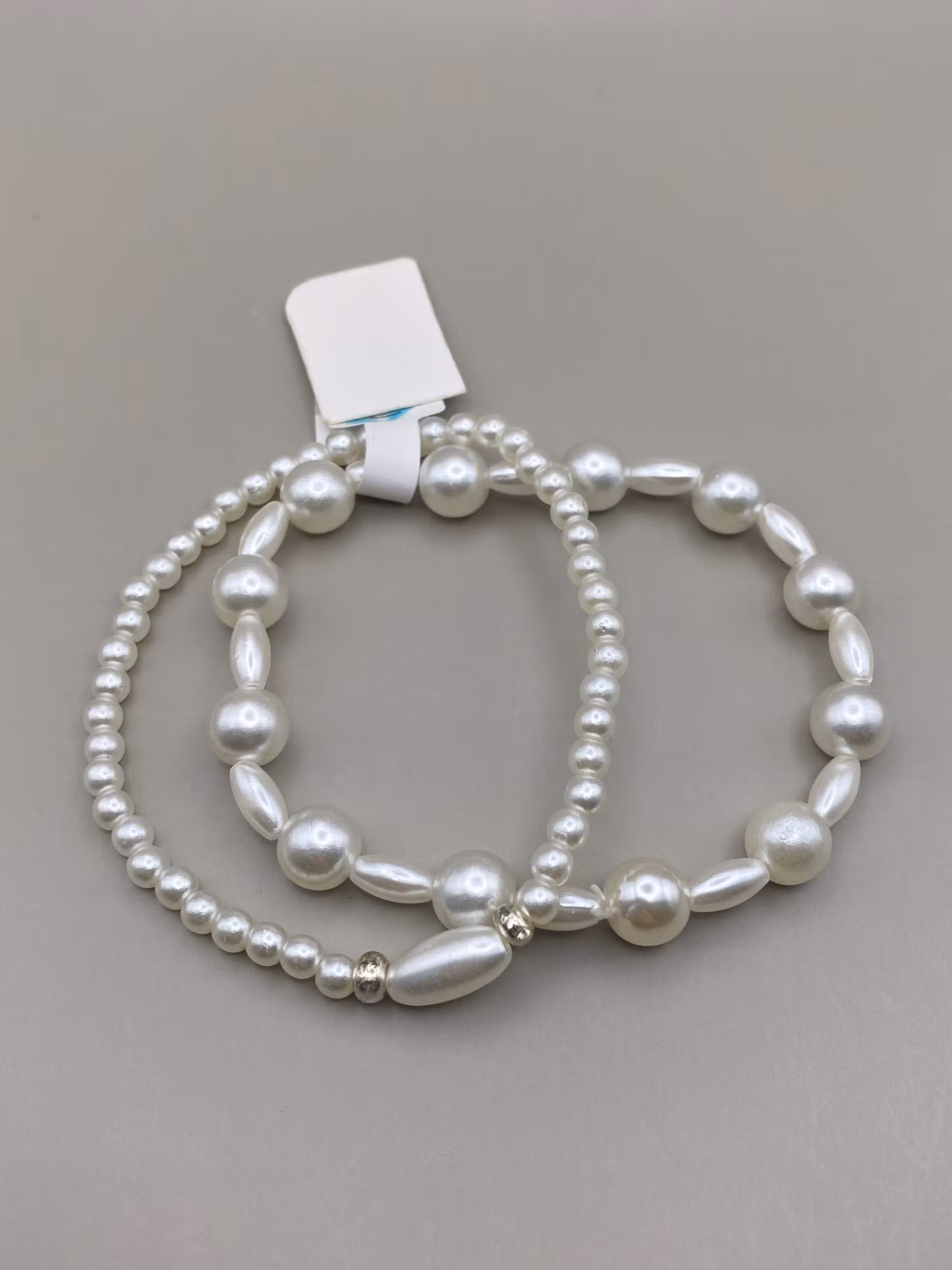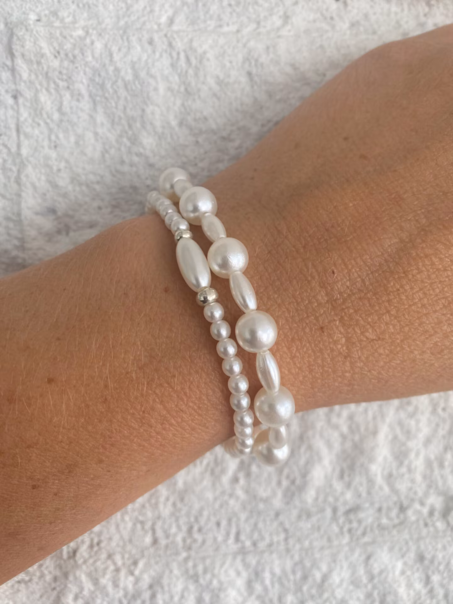 2-pack stilrena armband i fin kombo. Armband 1. stora benvita pärlor, varvat med avlånga benvita pärlor. Armband 2, bengrå små pärlor, större avlång benvit pärla och två silverfärgade pärlor i blickfånget.