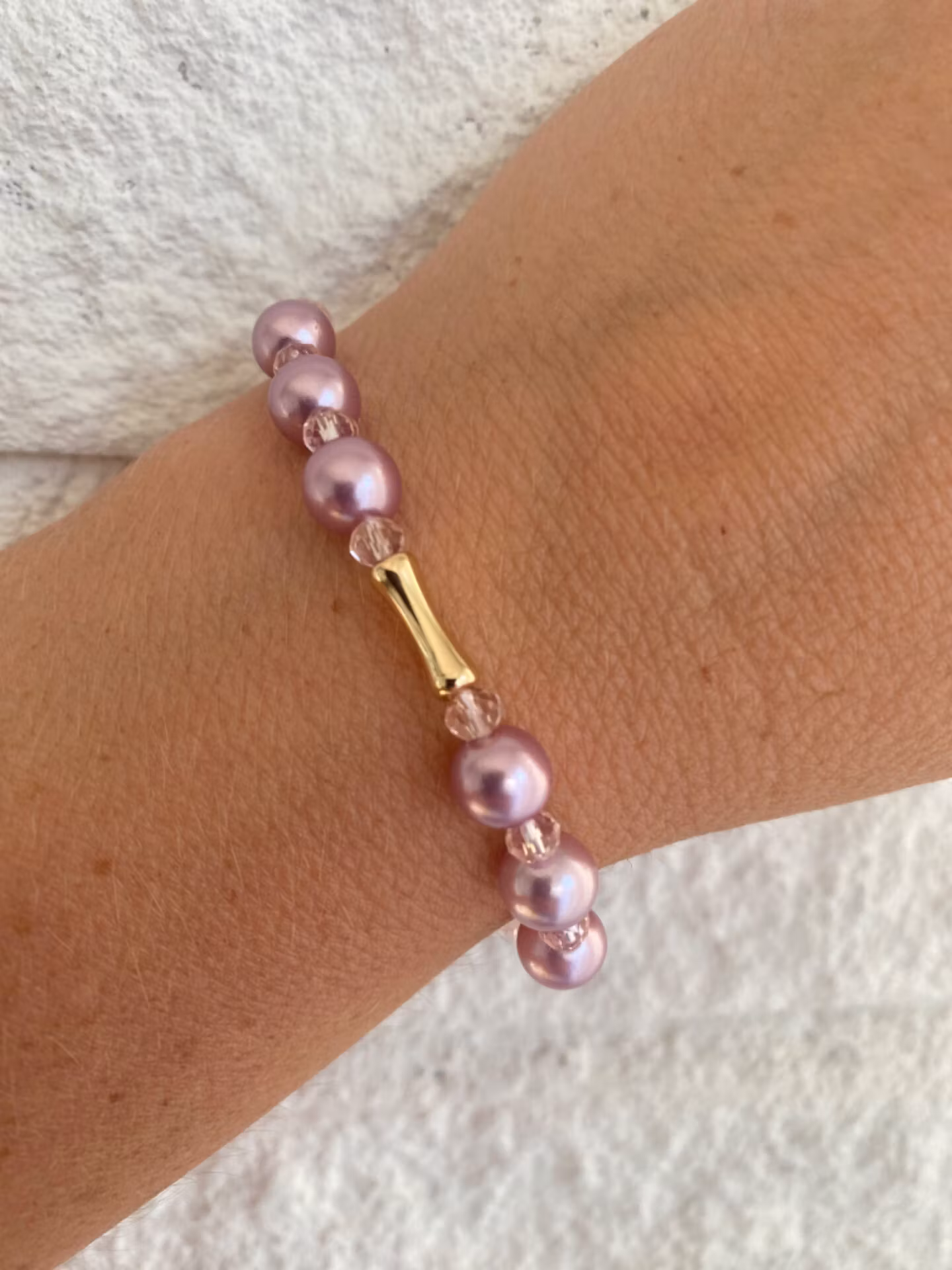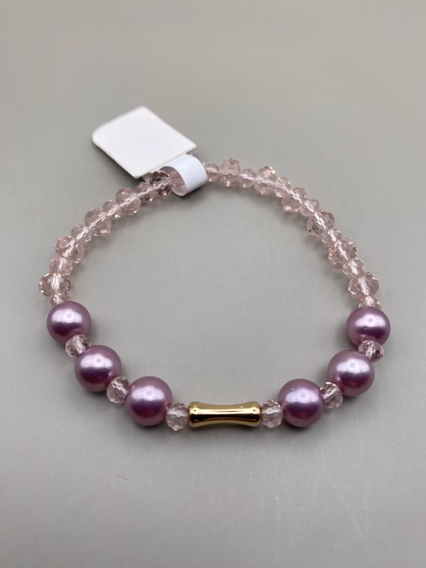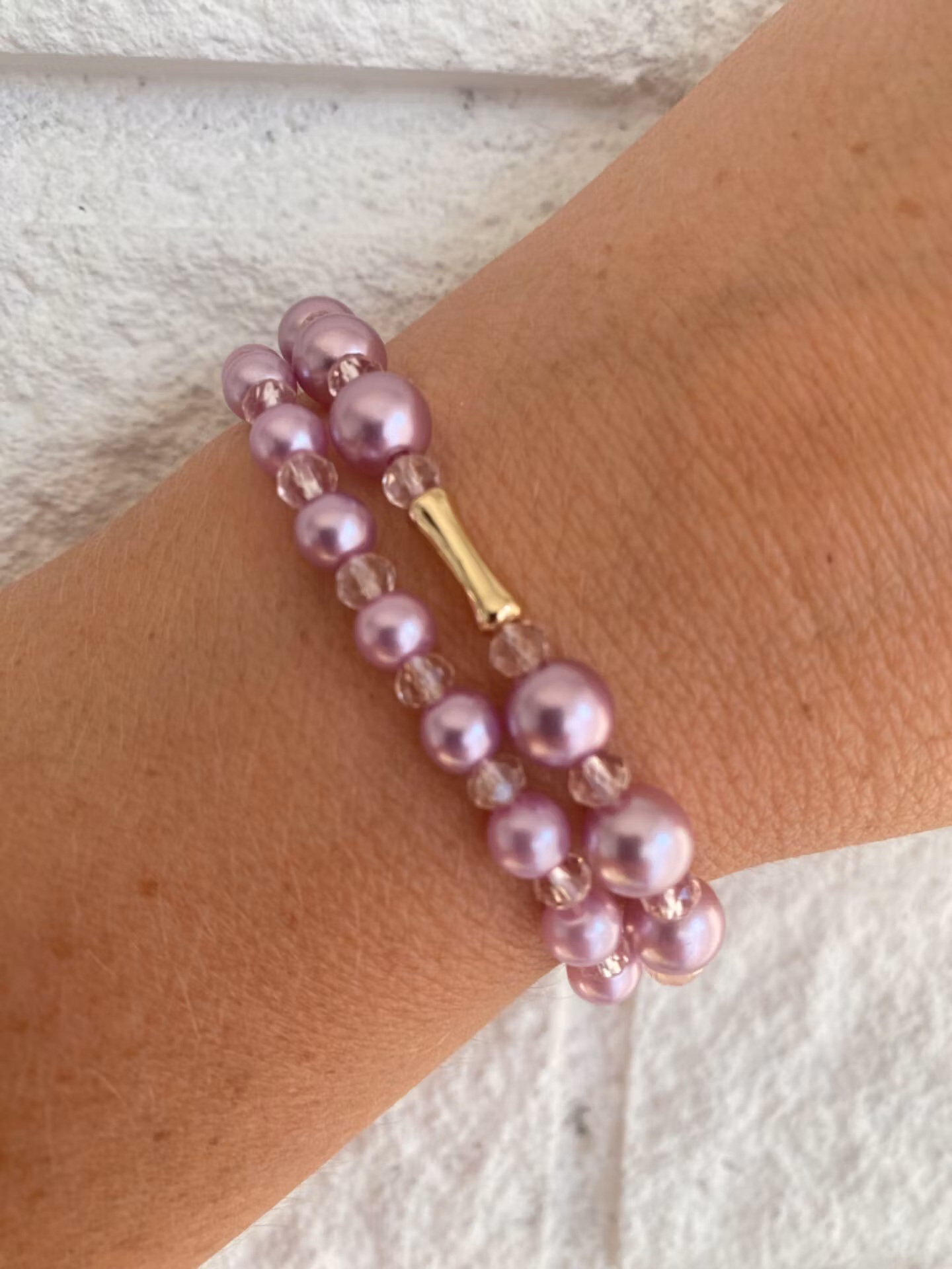 Elegant armband i lila större pärlor varvat med rosa glaspärlor och guldfärgad avlång pärla i blickfånget. Små rosa glaspärlor runt om.