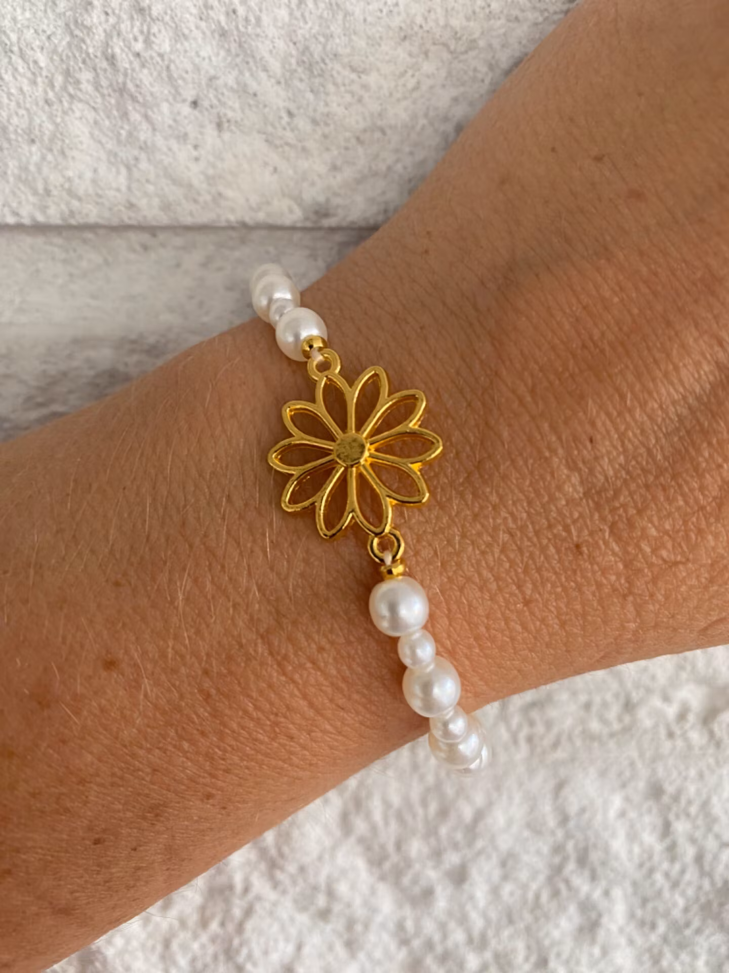 Fint armband i varvat mindre och små benvita pärlor, guldfärgad berlock i form av blomma i blickfånget.