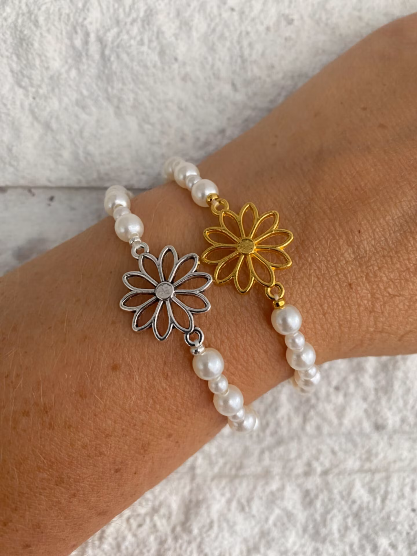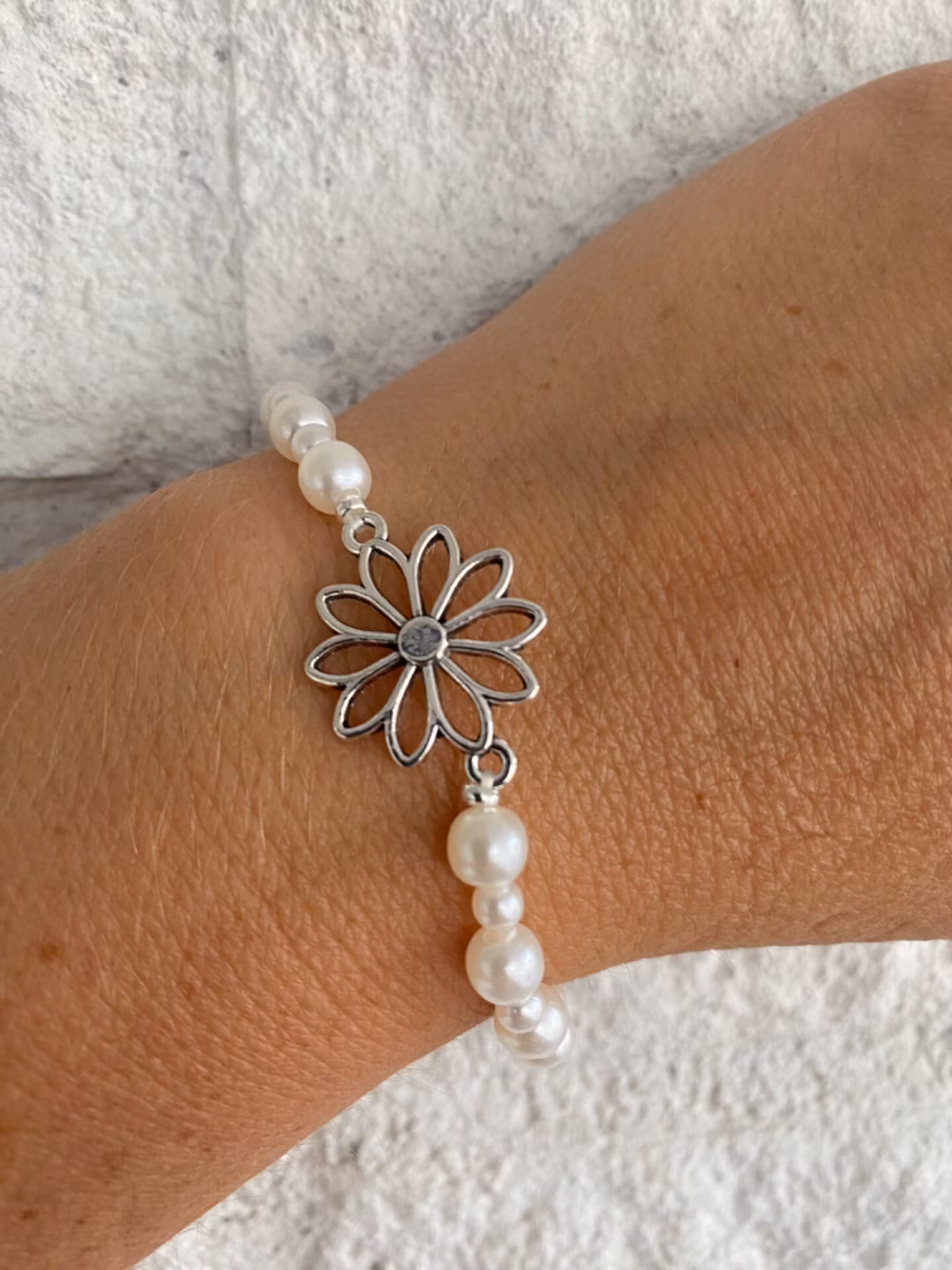 Fint armband i varvat mindre och små benvita pärlor, silverfärgad berlock i form av blomma i blickfånget.