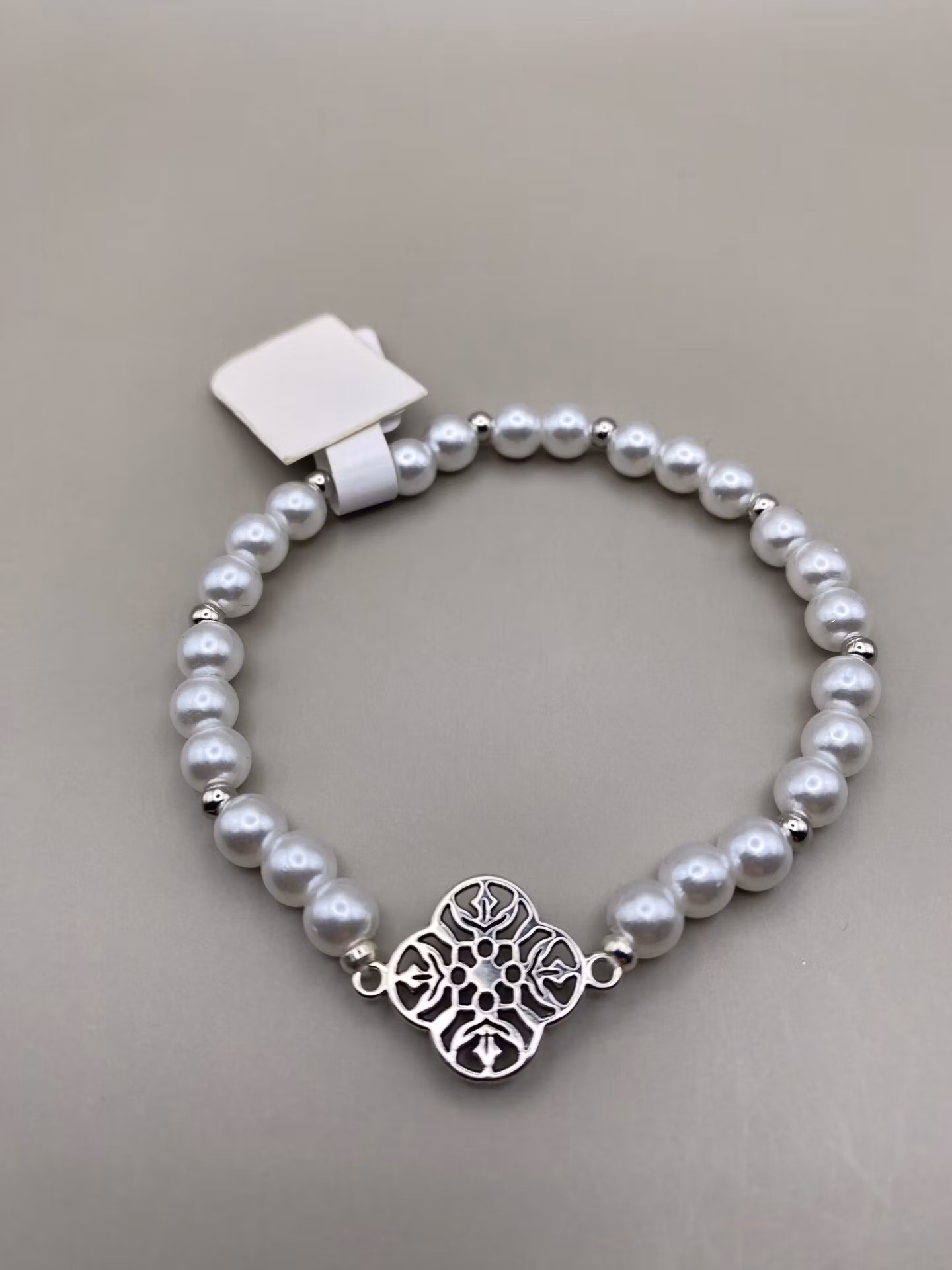 Fint armband i mellansmå kritvita pärlor varvat med silverfärgade små pärlor, silverfärgad berlock i form av blomma, fyrklöver i blickfångetPärlor 6mmVisas prod
