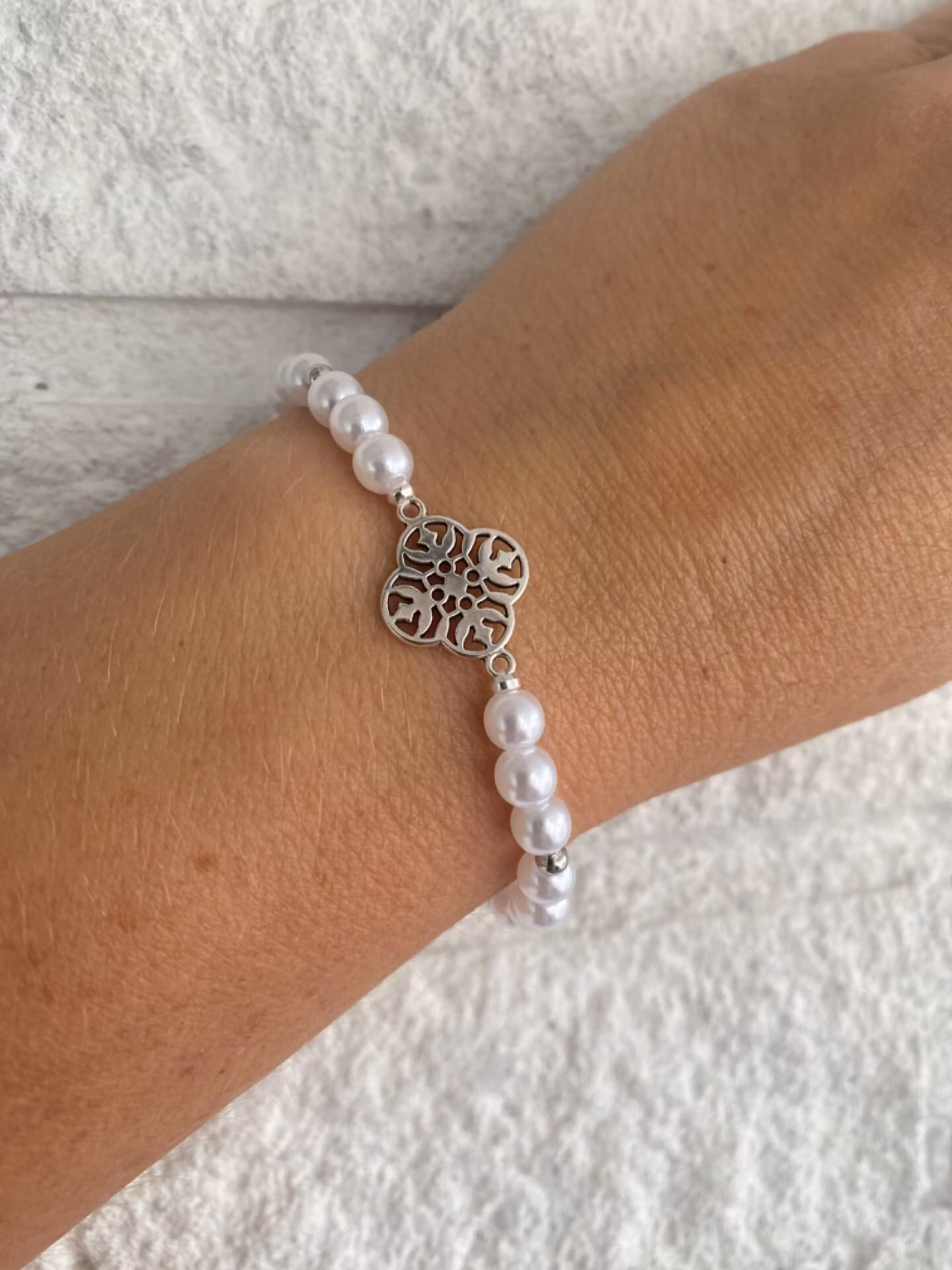 Fint armband i mellansmå kritvita pärlor varvat med silverfärgade små pärlor, silverfärgad berlock i form av blomma, fyrklöver i blickfånget