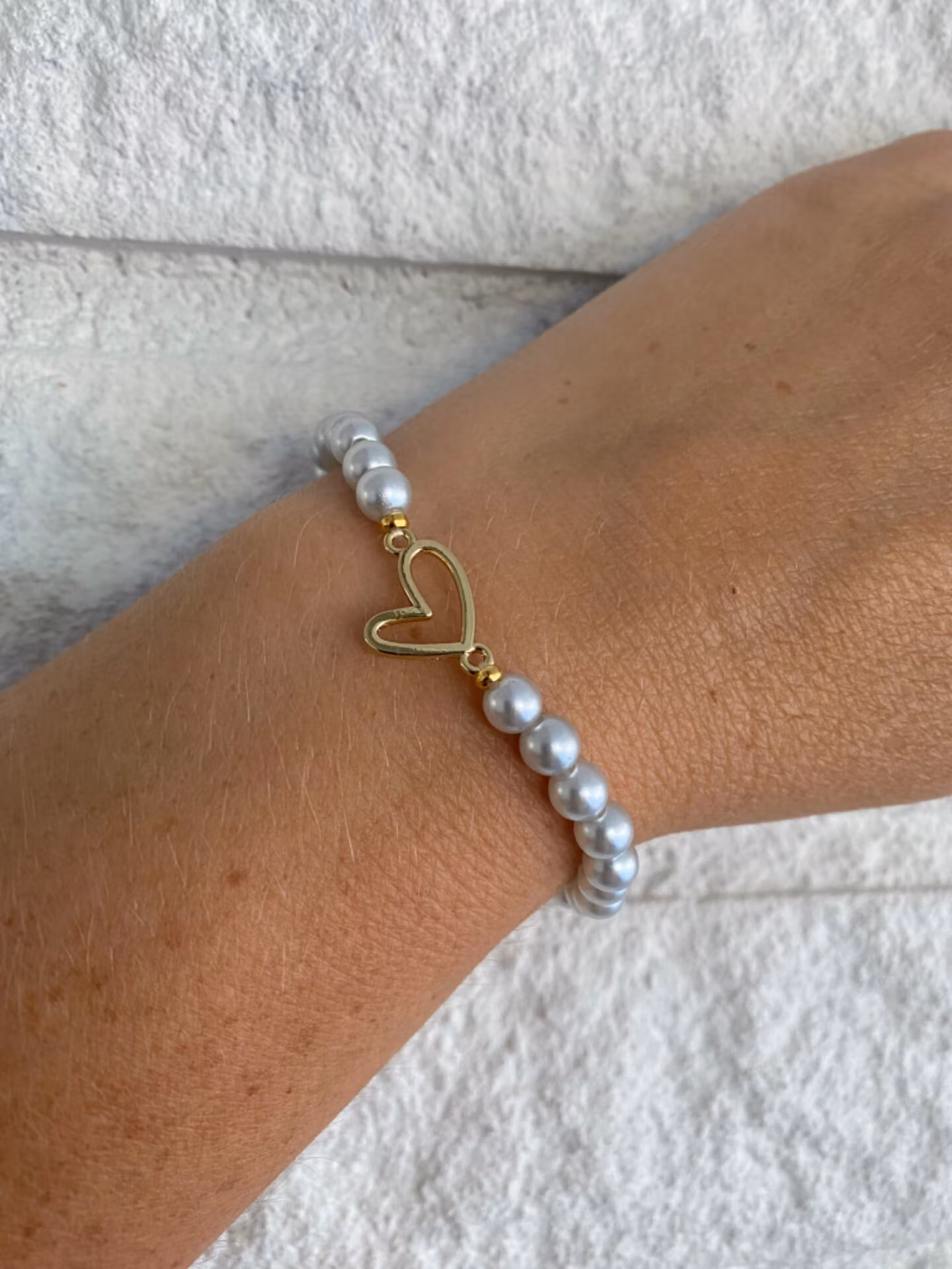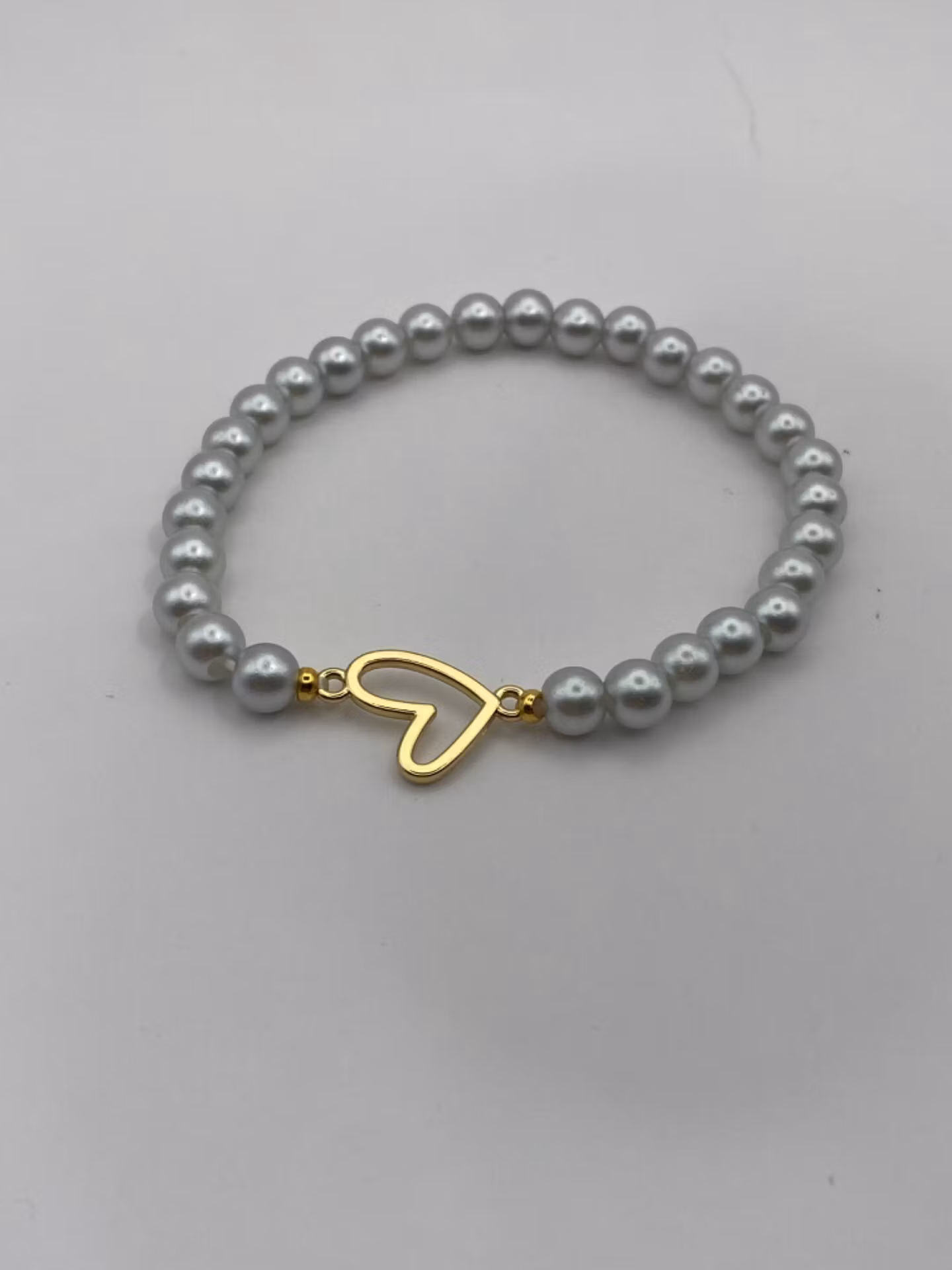 Fint armband i silvergrå mindre pärlor, berlock i form av guldfärgat hjärta i blickfånget.