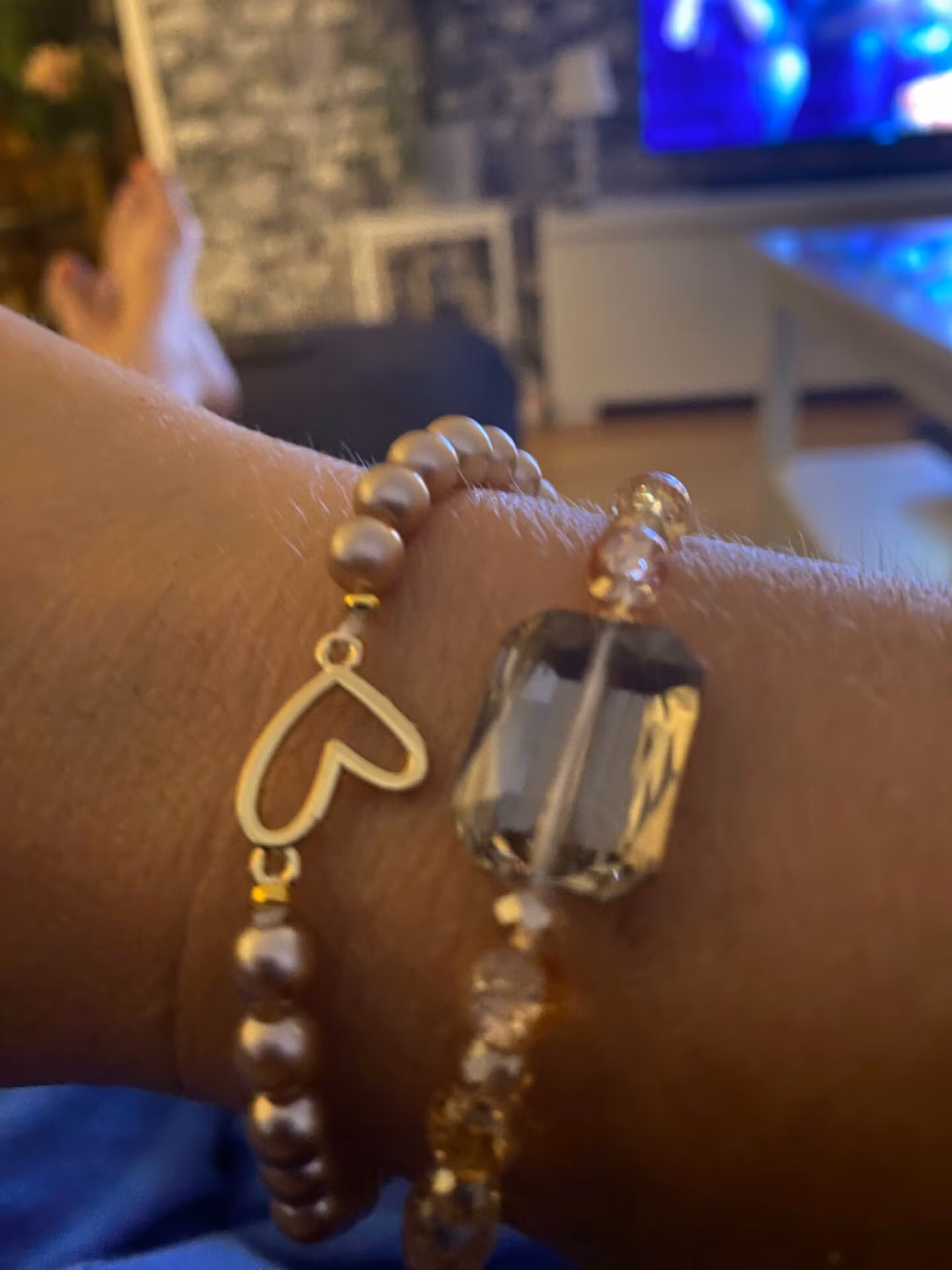 Fint armband i champagnefärgade mindre pärlor, berlock i form av guldfärgat hjärta i blickfånget.Pärlor 6mmVisas produkten "Tillfälligt slut" efter att du lagt