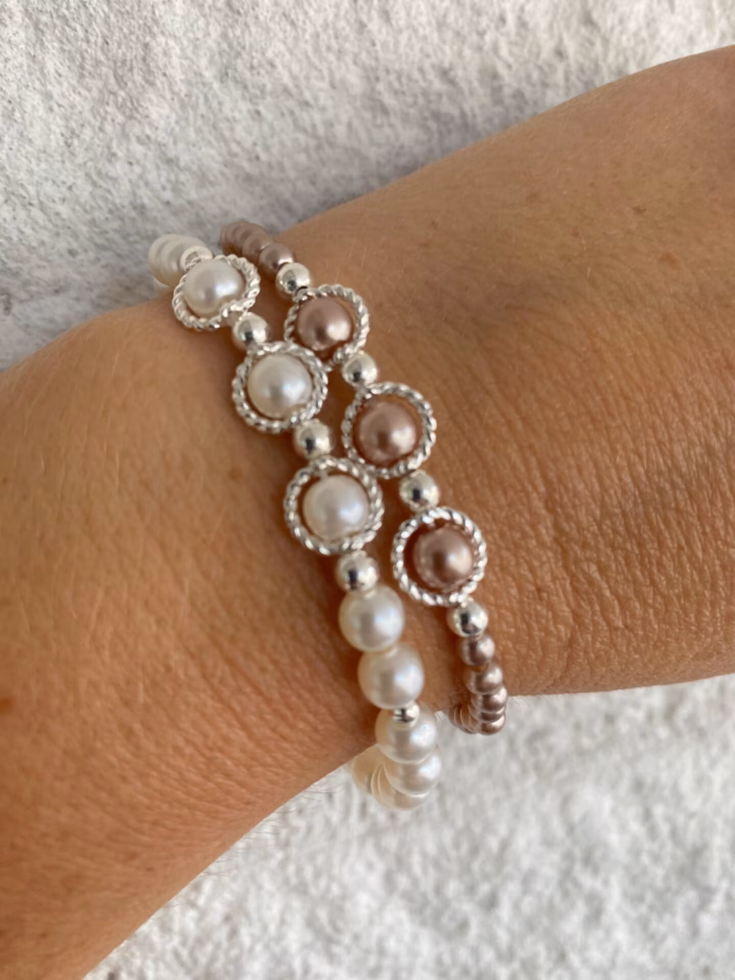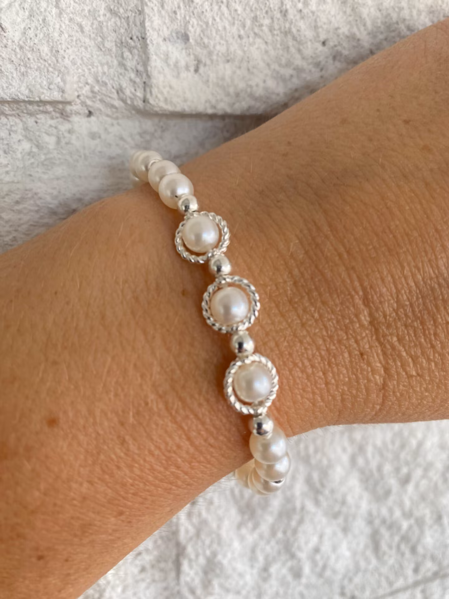 Stilrent armband i benvita blanka pärlor varvat i fint mönster av silverfärgade små pärlor, tre benvita pärlor med ramar i blickfånget.