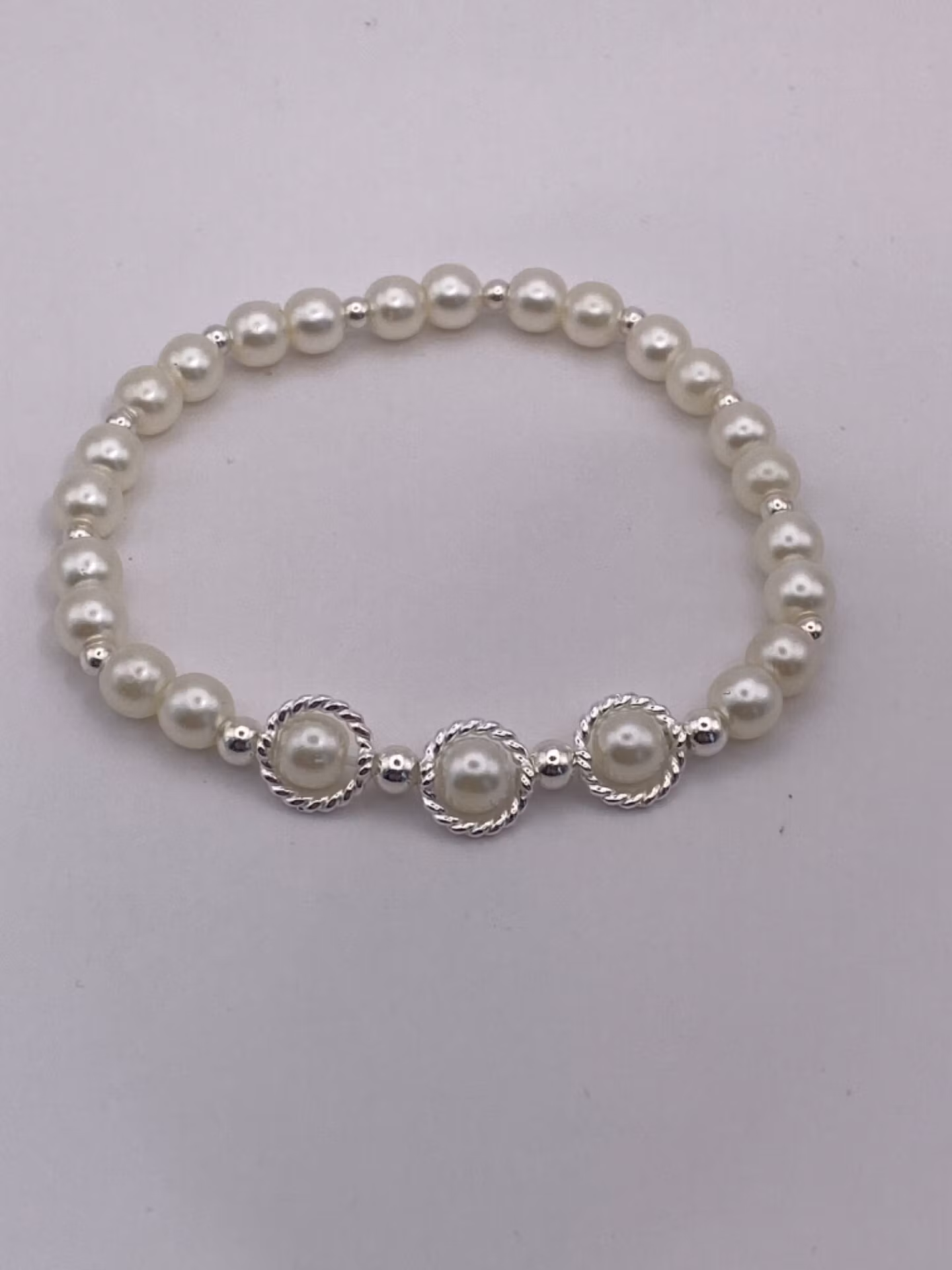 Stilrent armband i benvita blanka pärlor varvat i fint mönster av silverfärgade små pärlor, tre benvita pärlor med ramar i blickfånget.Pärlor 6mm*Visas produkte