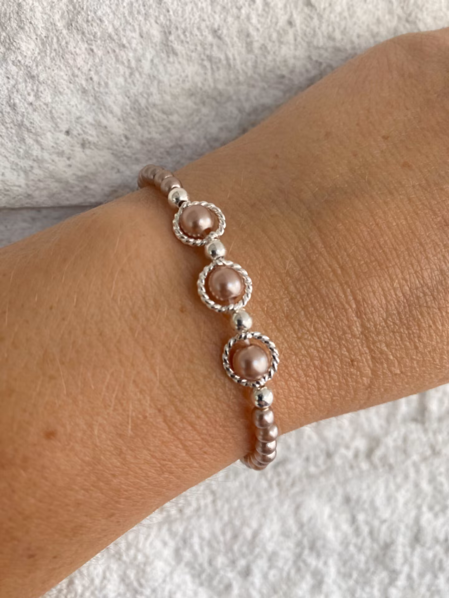 Stilrent armband i champagnefärgade små pärlor varvat med silverfärgade små pärlor, tre större champagnefärgade pärlor med ramar i blickfånget.Pärlor 4mm, 6mmVi