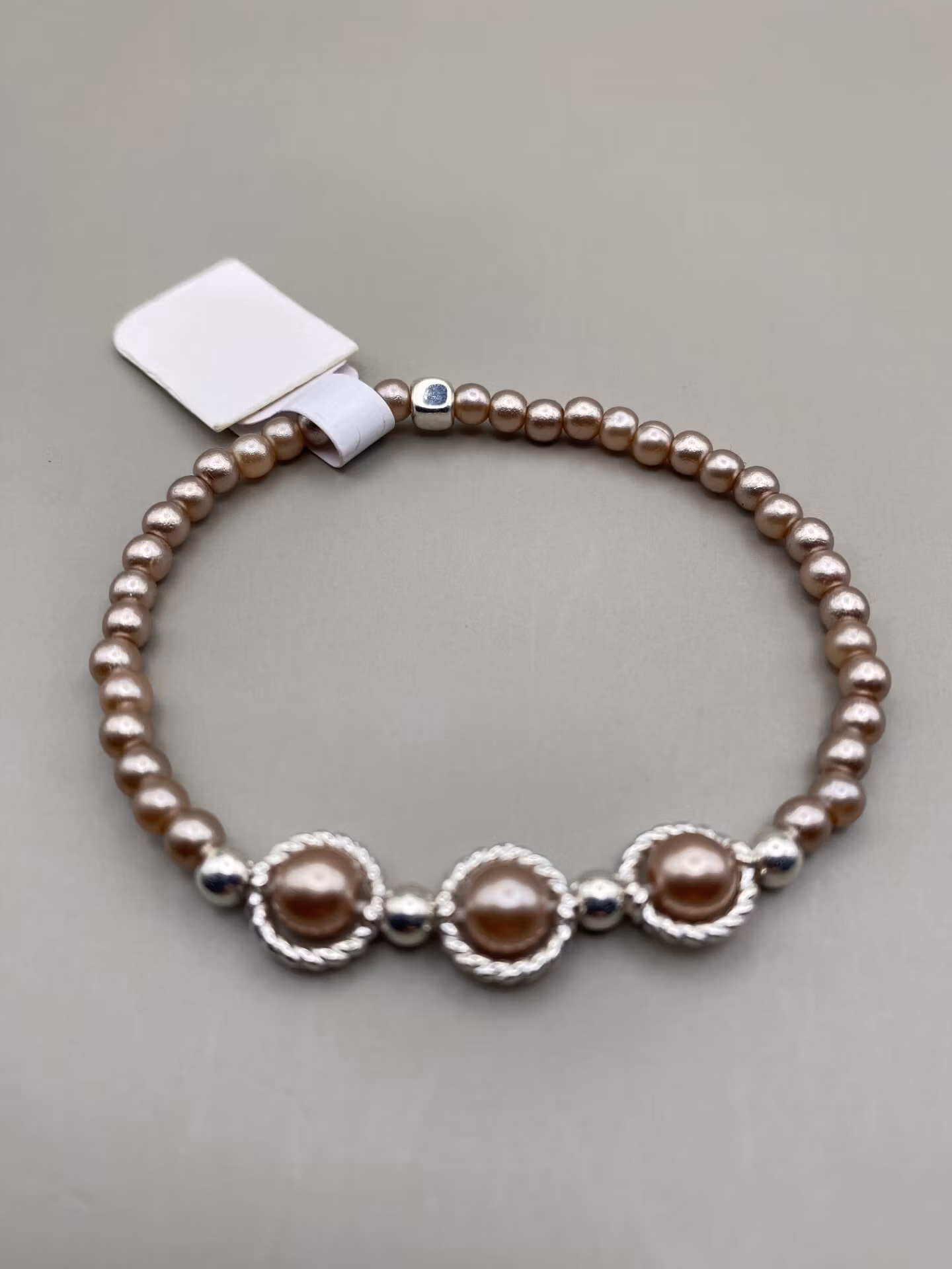 Stilrent armband i champagnefärgade små pärlor varvat med silverfärgade små pärlor, tre större champagnefärgade pärlor med ramar i blickfånget.