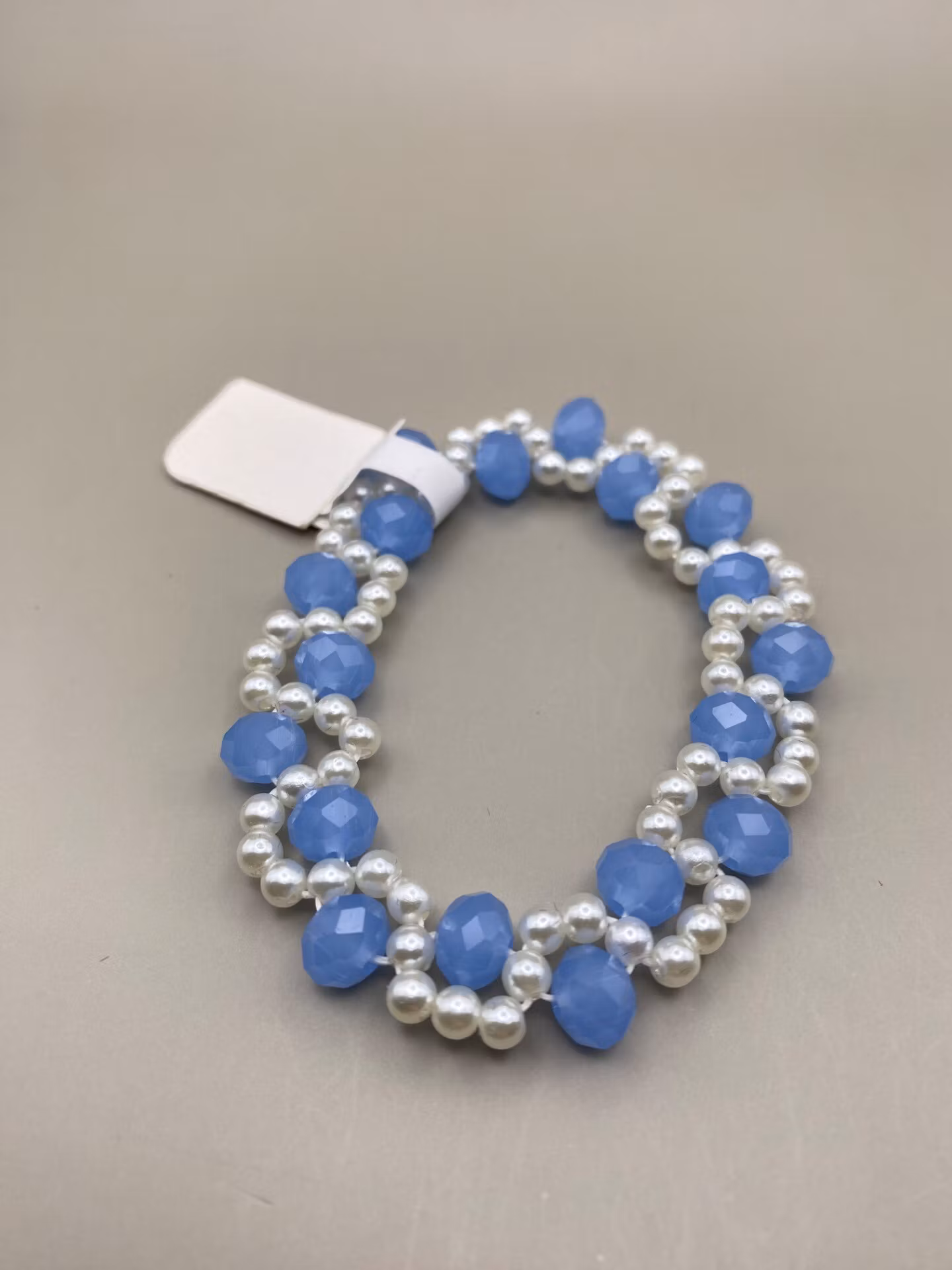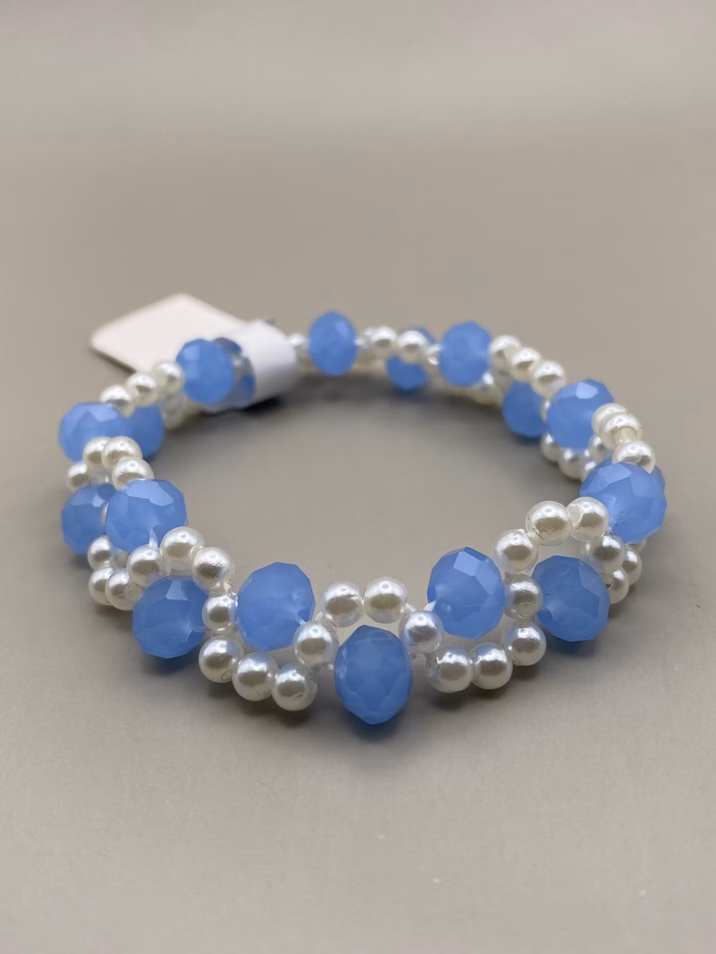 Tjusigt armband i fint mönster av mellanblå skimrande fasettglaspärlor och små kritvita pärlor.
