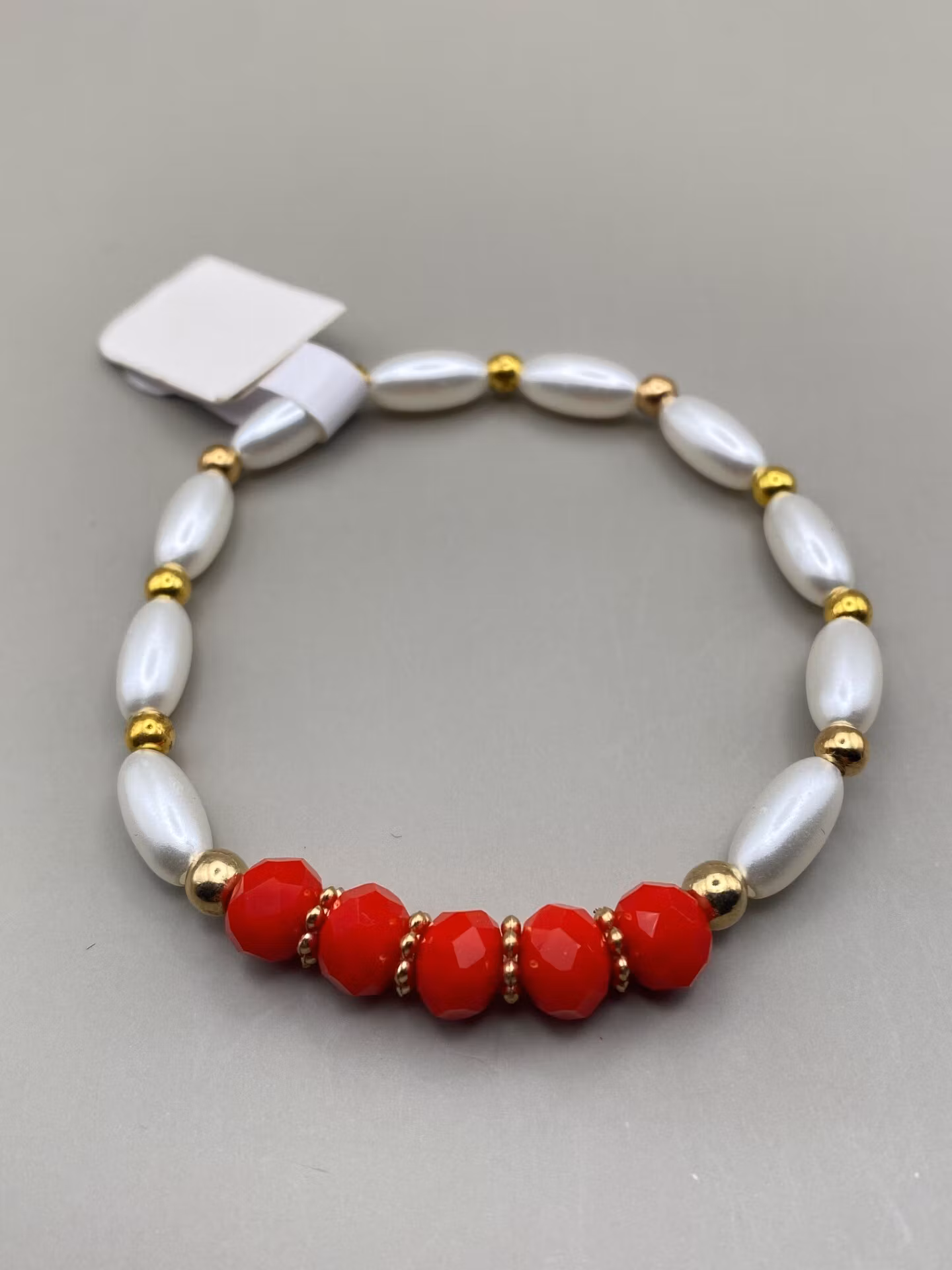 Tjusigt armband i varvat mönste av benvita avlånga pärlor och små guldfärgade pärlor, klarröda stora fasett glaspärlor varvat med guldfärgade detaljer i blickfå
