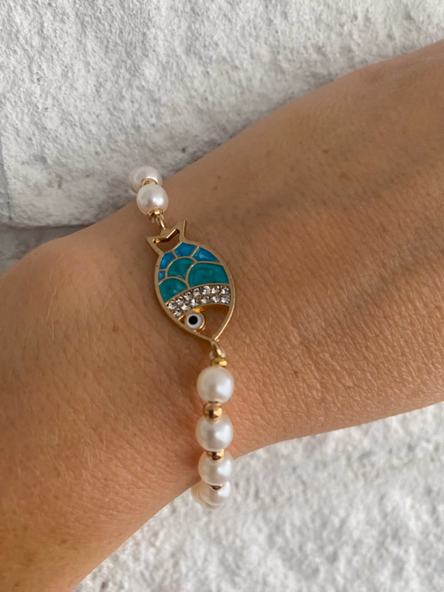 Tjusigt armband i varvat mönste av benvita pärlor och små guldfärgade pärlor, stor berlock i form av en fisk i turkosa toner och lite strass i blickfångetPärlor