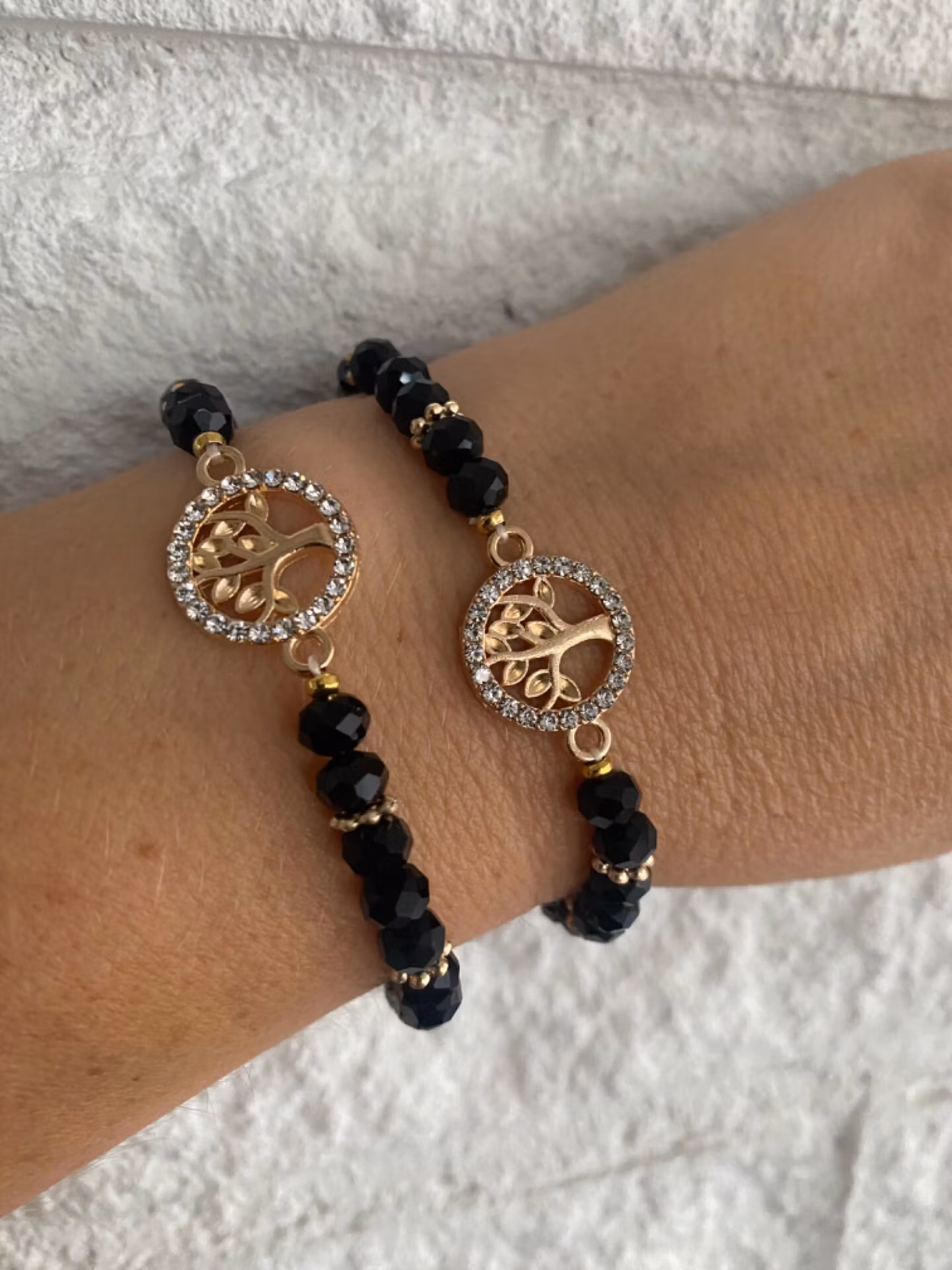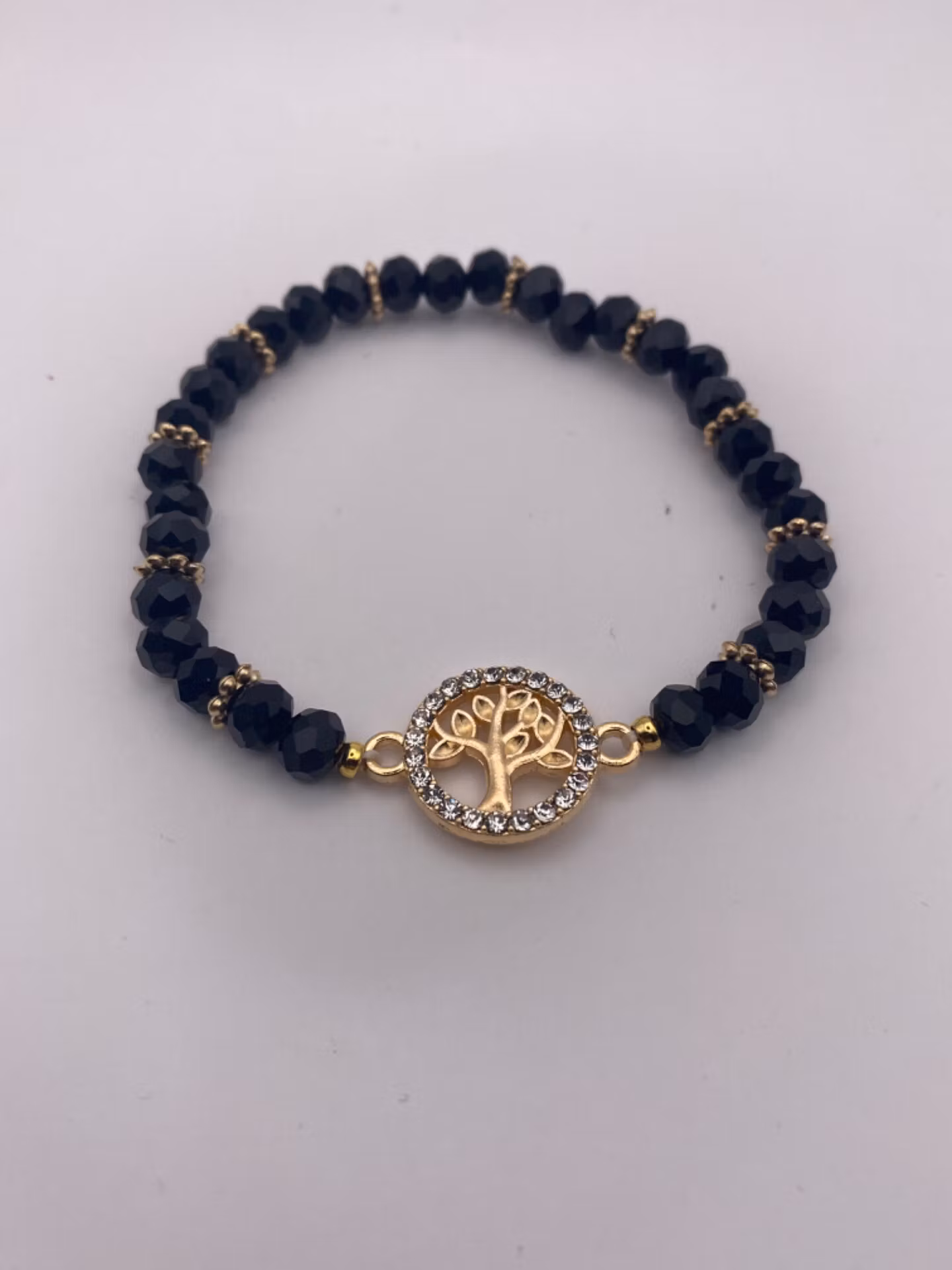 Tjusigt armband i varvat mönster av svarta blanka glaspärlor och guldfärgade distanser, stor berlock i form av livets träd med strass i blickfångetPärlor 6mmVis
