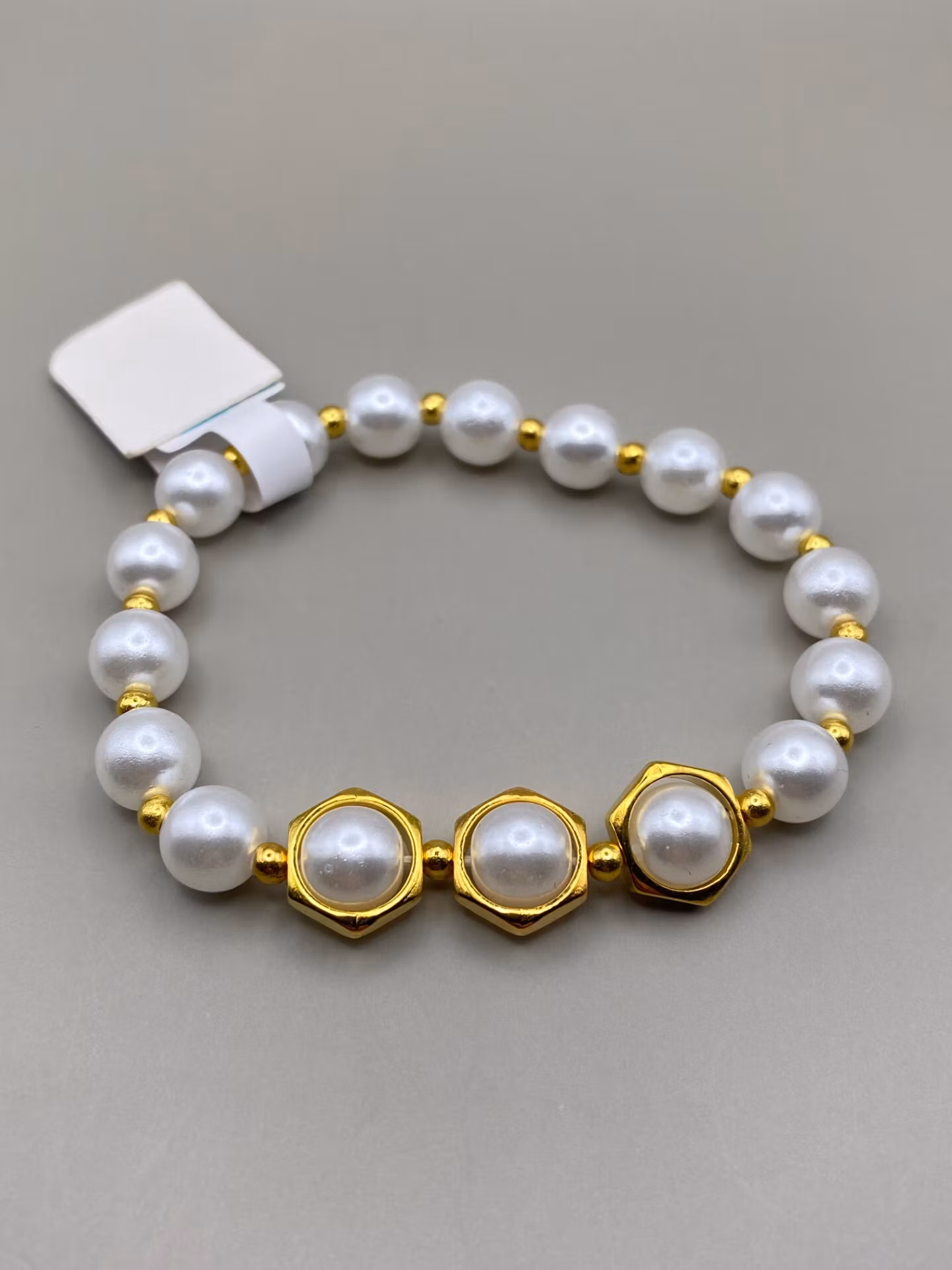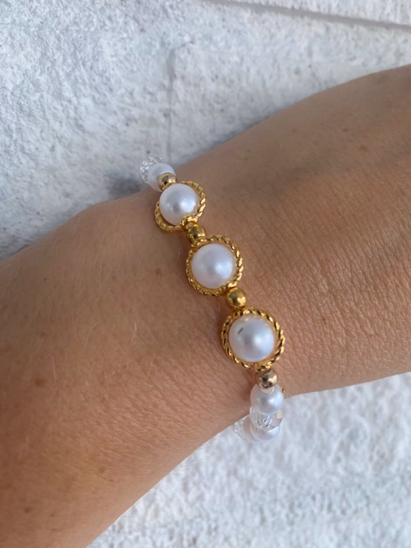 Tjusigt armband i varvat mönster av kritvita blanka pärlor och genomskinliga glaspärlor, tre guldfärgade höljen kring tre större kritvita pärlor i blickfånget,