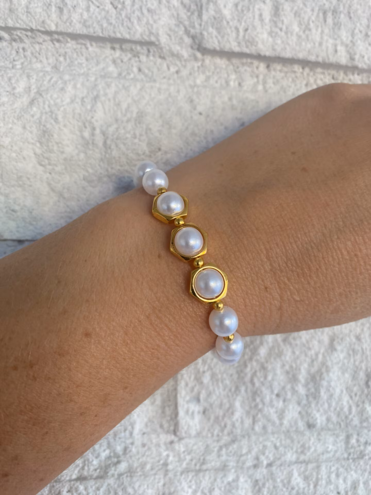 Elegant armband i kritvita glansiga pärlor, varvat med guldfärgade små distanspärlor, tre guldfärgade höljen kring tre kritvita pärlor i blickfångetPärlor 8mmVi