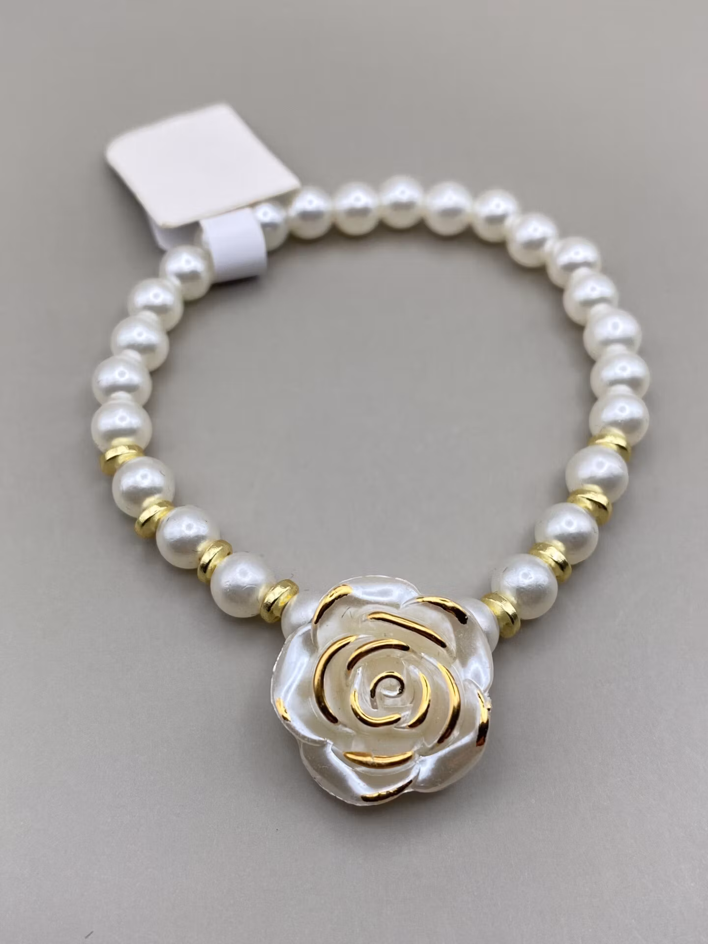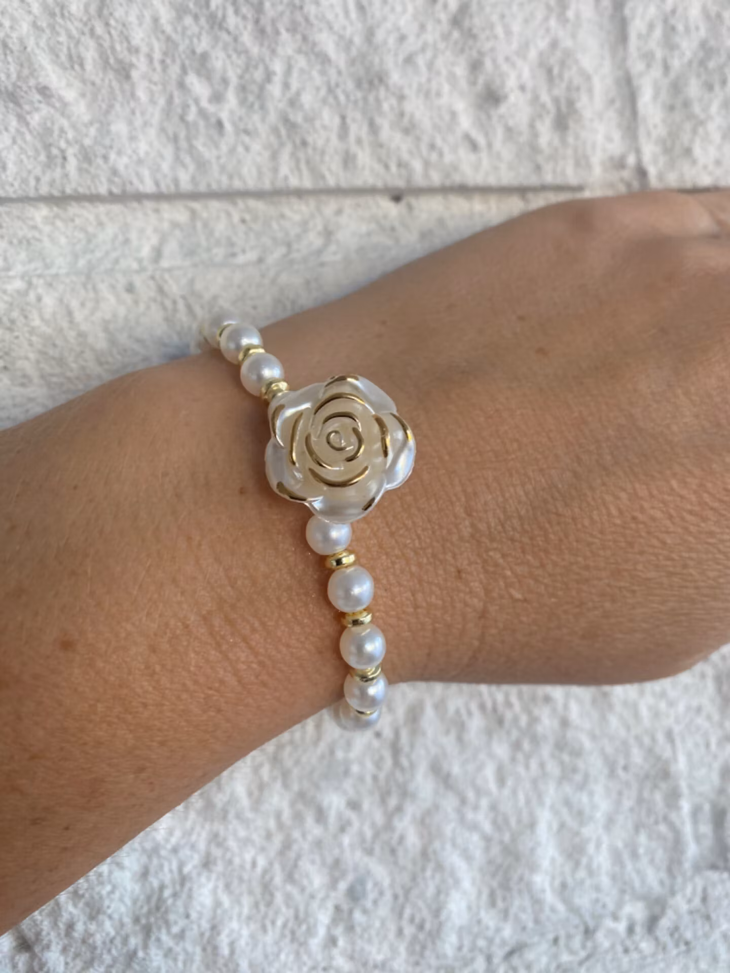 Elegant armband i varvat benvita mindre pärlor och guldfärgade distanser. Fin benvit ros med guldfärgade kanter i blickfånget. Rosen hänger vackert ner mot handen på handleden.