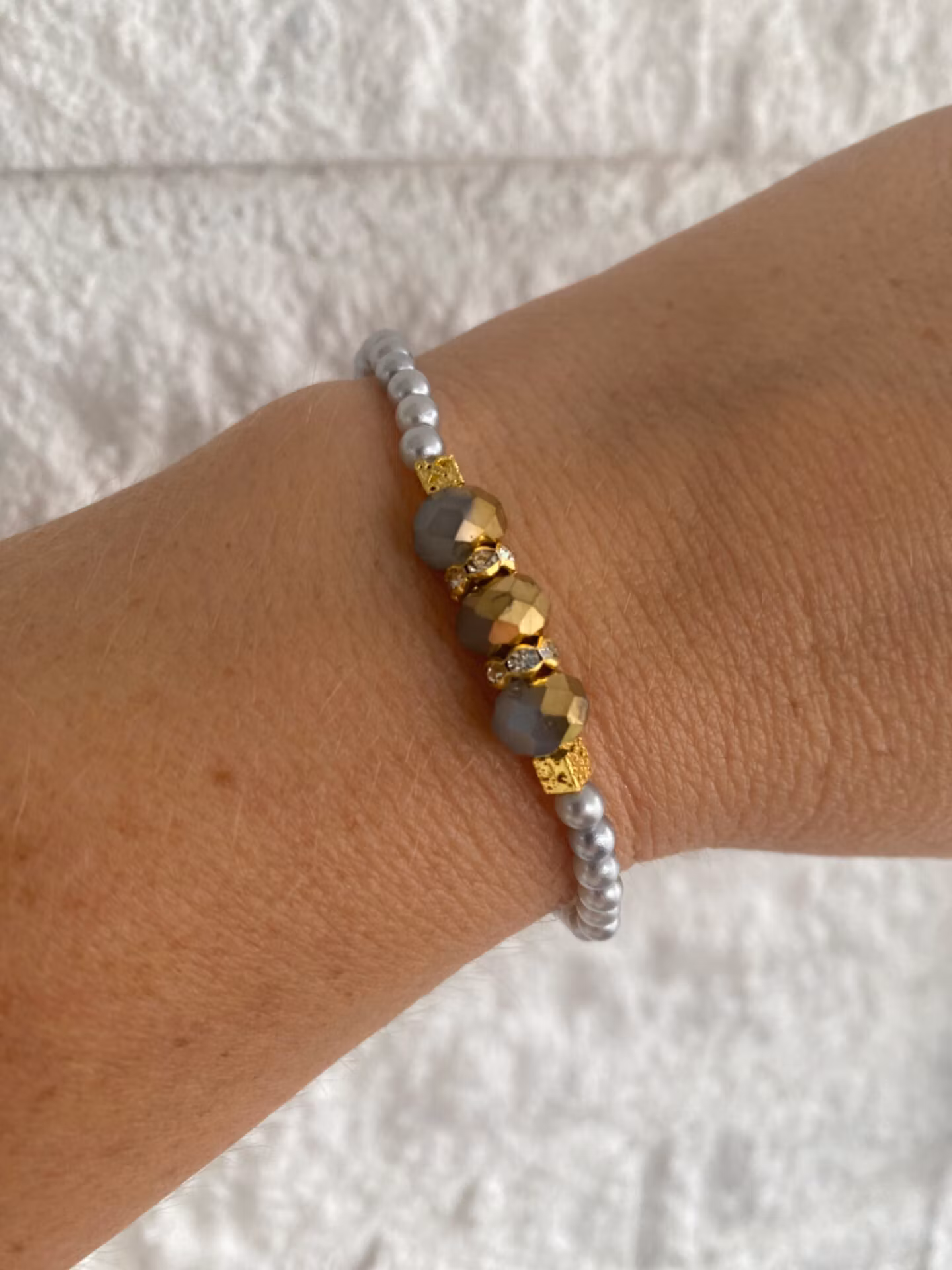 Elegant armband i små ljust silvergrå pärlor, stora grå och guldmellerade glas pärlor, strass och kvadratiska pärlor i blickfånget. Stor dekorativ avlång guldfärgad avslutspärla.