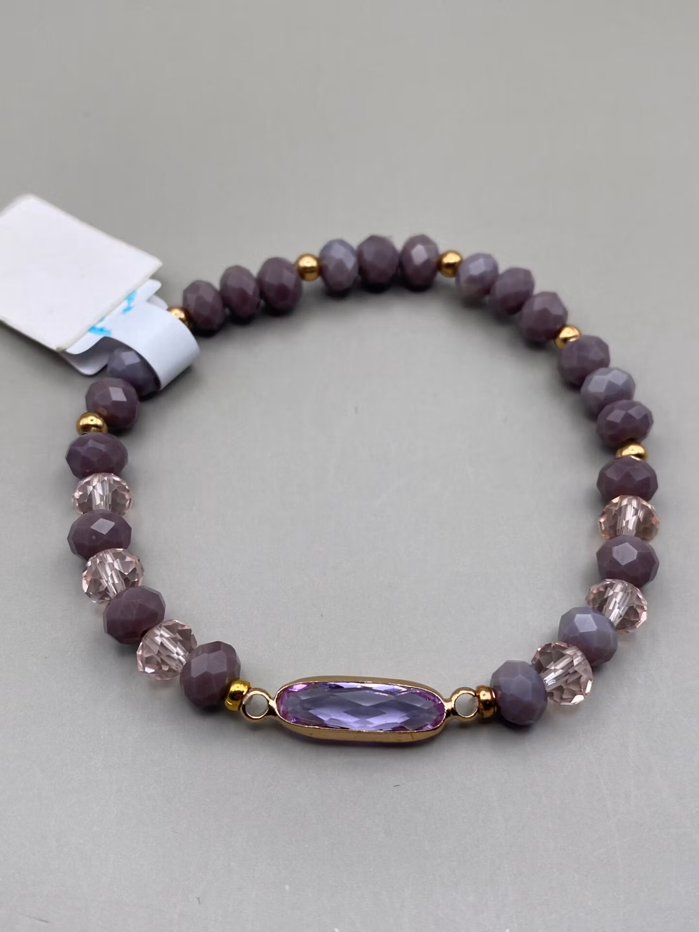 Elegant armband i varvat ljunglila pärlor och ljusrosa glaspärlor, guldfärgade små distanspärlor och fin guldfärgad berlock med svagt lila glaspärla/sten i blic