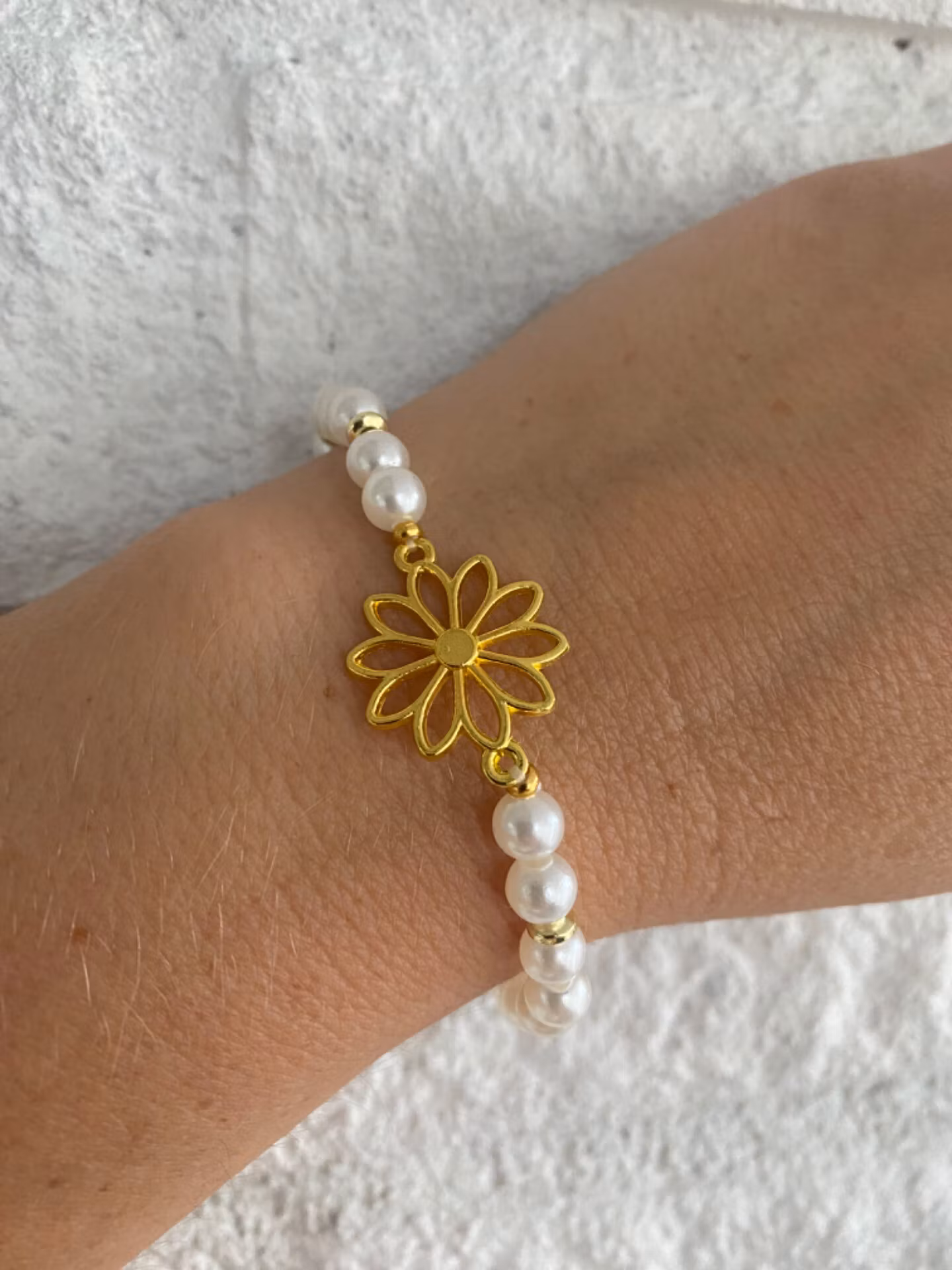 Elegant armband i benvita glansiga pärlor varvat med guldfärgade distans brickor och fin guldfärgad berlock i form av en blomma i blickfånget.Vita pärlor 6mmVis