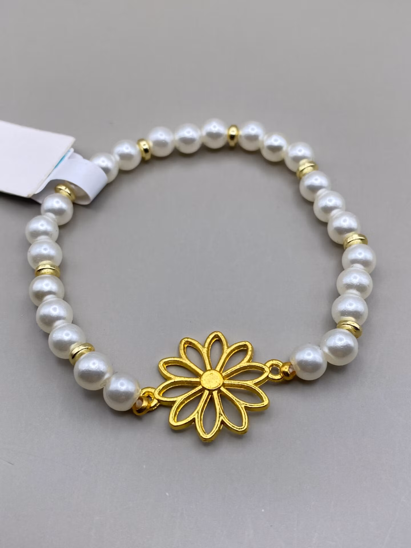 Elegant armband i benvita glansiga pärlor varvat med guldfärgade distans brickor och fin guldfärgad berlock i form av en blomma i blickfånget.