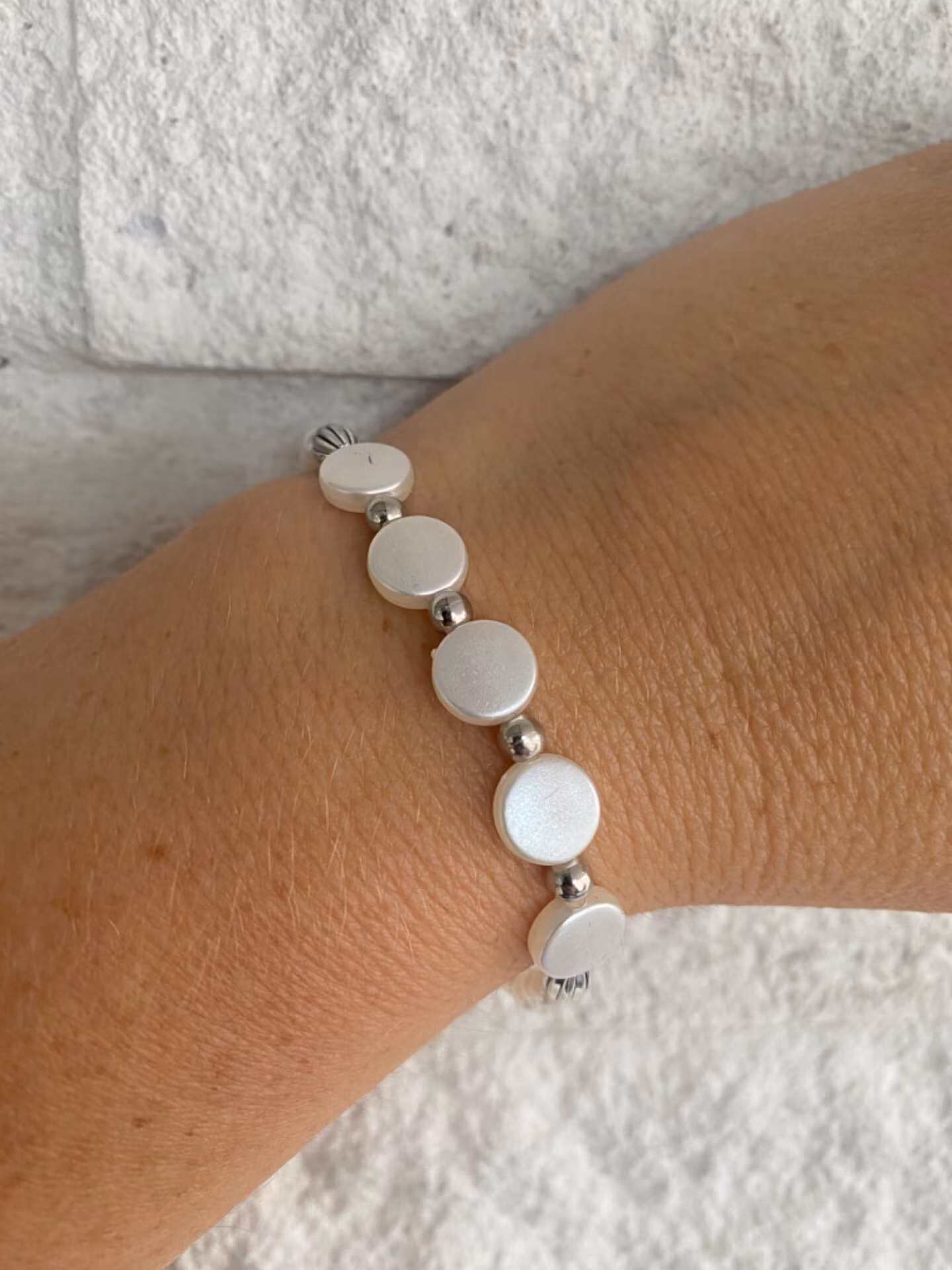 Elegant armband i benvita glansiga små pärlor varvat platta benvita runda pärlor och silverfärgade pärlor och distanser i blickfånget