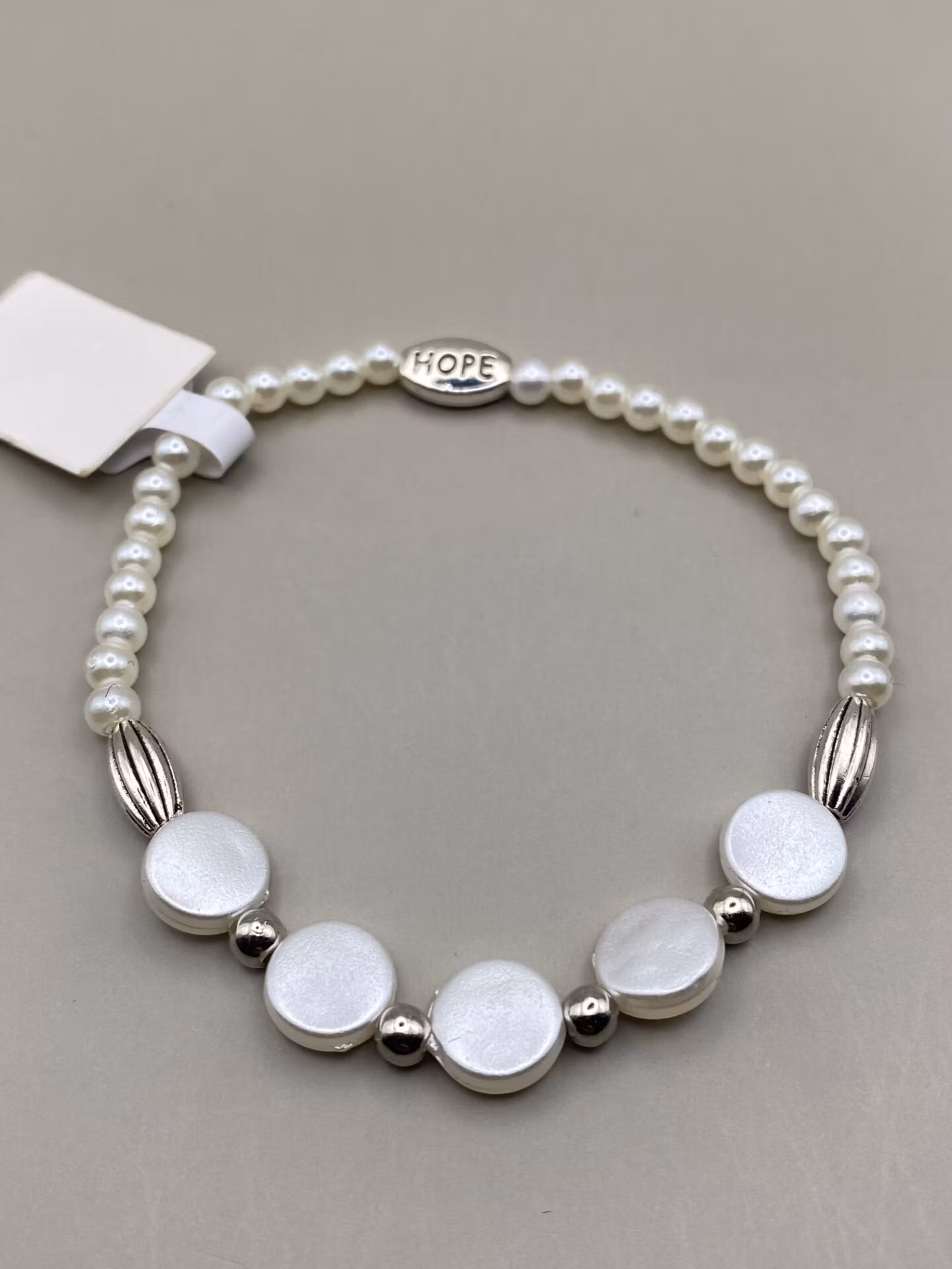 Elegant armband i benvita glansiga små pärlor varvat platta benvita runda pärlor och silverfärgade pärlor och distanser i blickfånget Visas produkten "Tillfälli