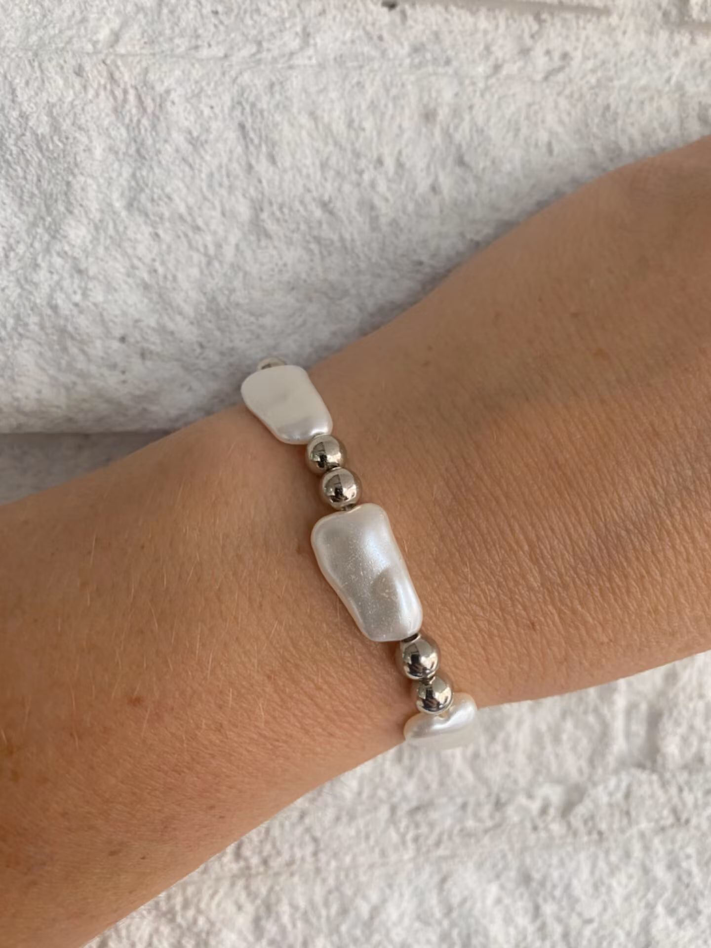 Elegant armband i varvat oregelbundna benvita pärlor och silverfärgade pärlor. Stiligt.