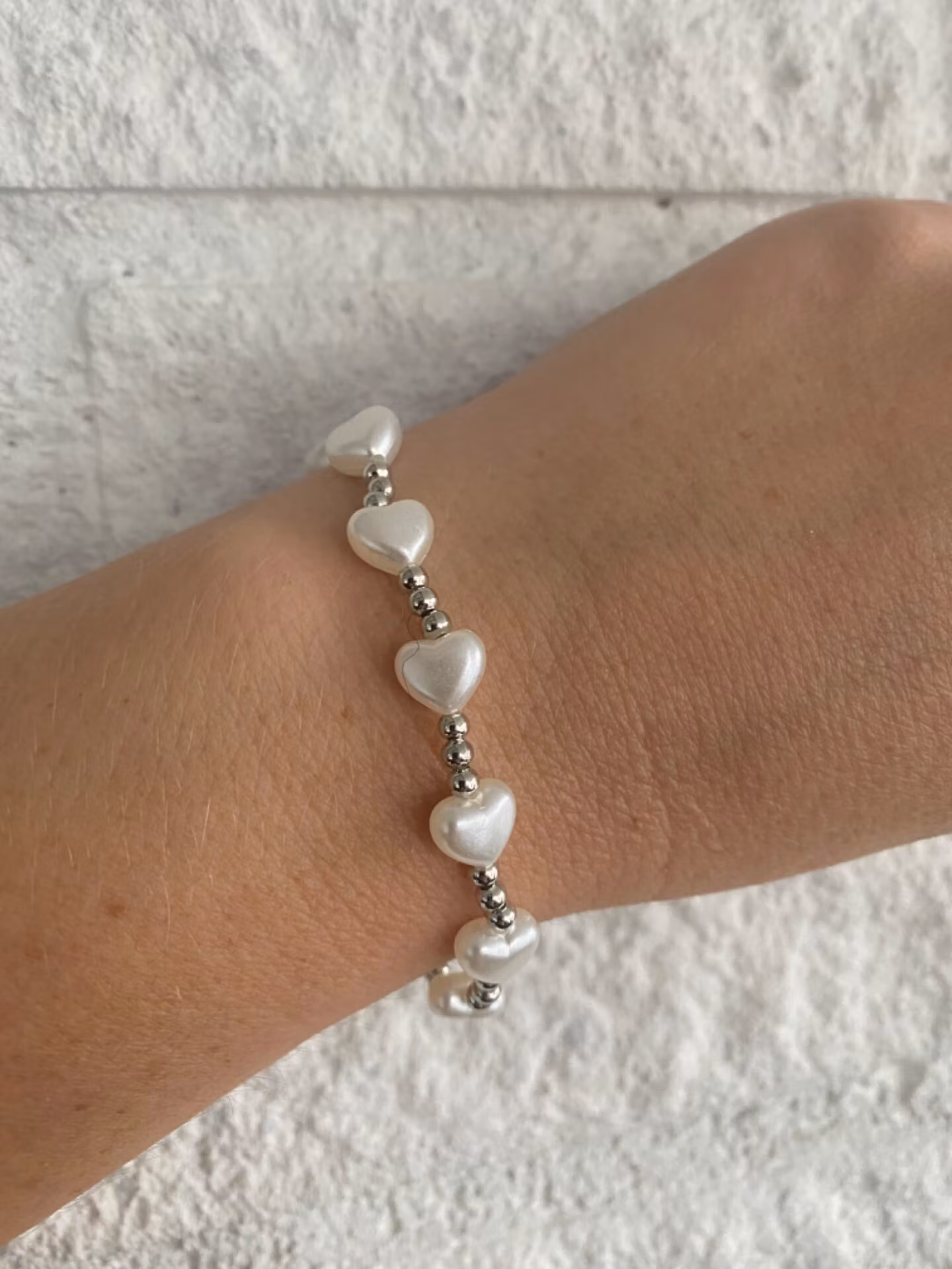 Elegant armband i varvat små silverfärgade pärlor och små vita hjärtan