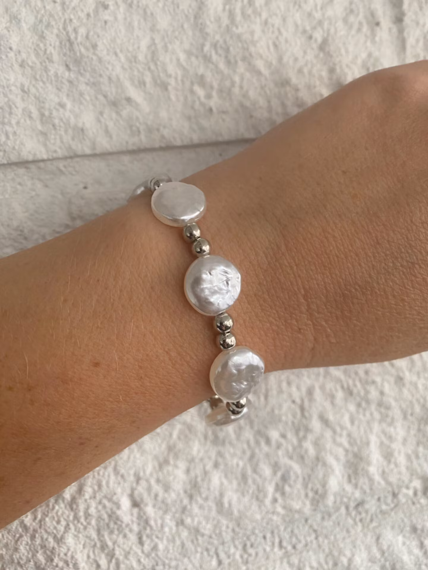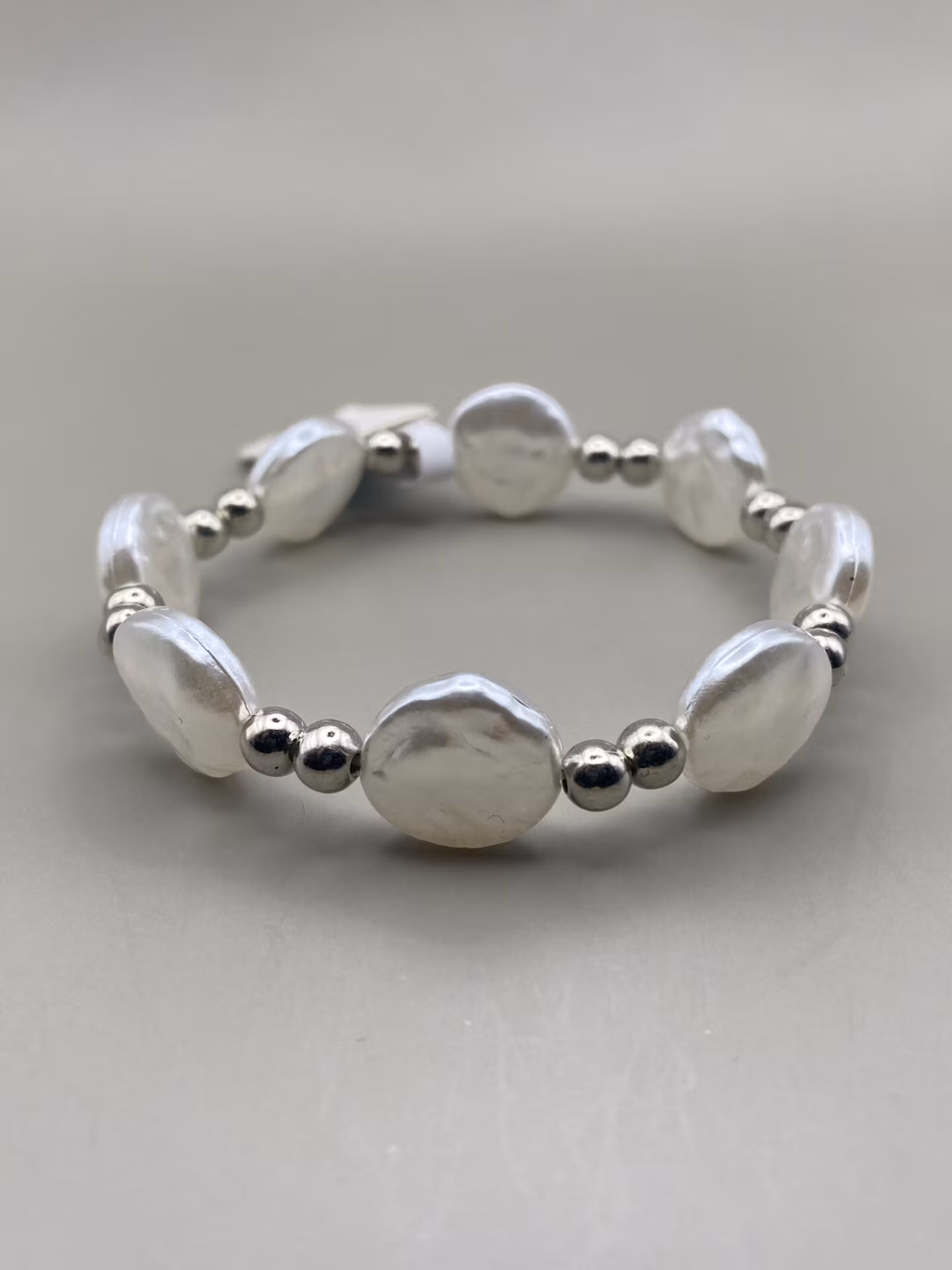 Elegant armband i varvat silverfärgade större distanspärlor och vita barockliknande platta pärlor med struktur. Väldigt vacker.Visas produkten "Tillfälligt slut