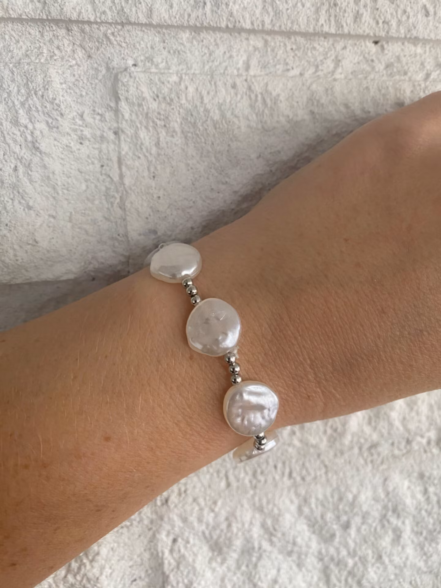 Elegant armband i varvat silverfärgade små distanspärlor och vita barockliknande platta pärlor med struktur. Väldigt vackert och stilrent armbandVisas produkten