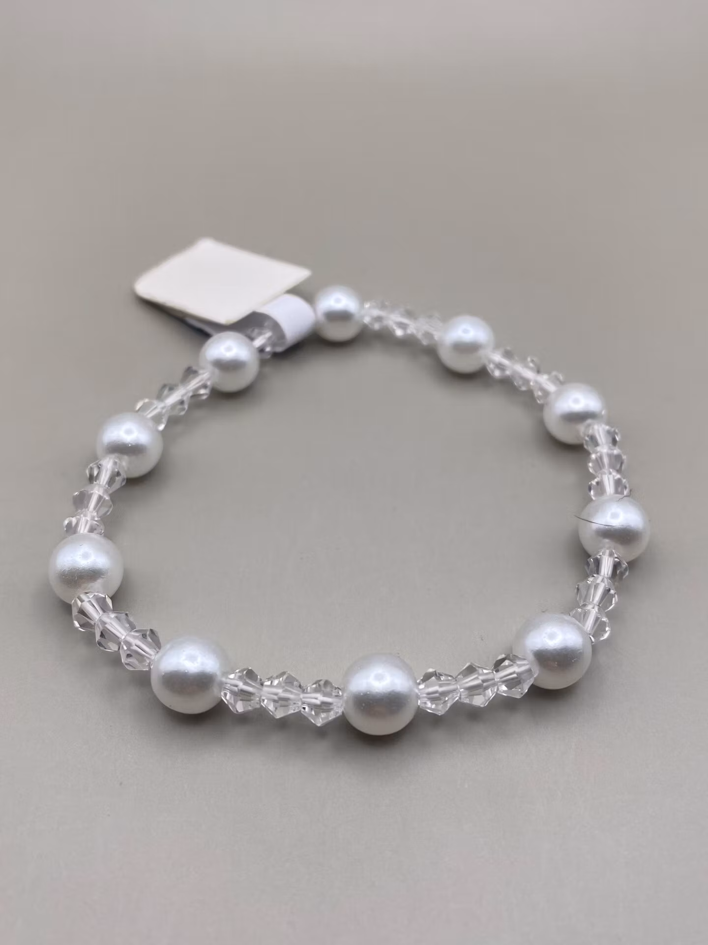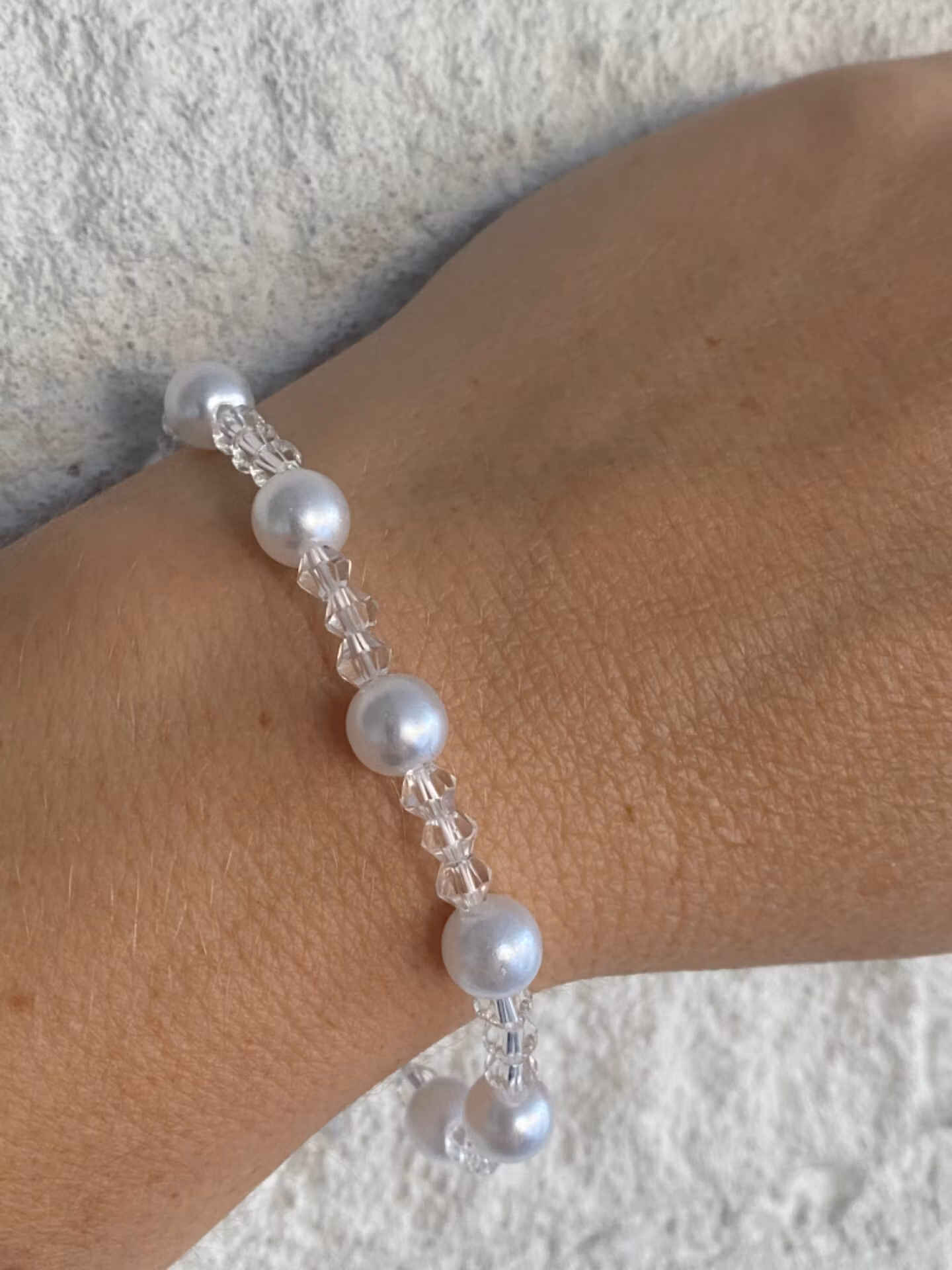 Elegant armband i varvat mönster av genomskinliga glas pärlor och kritvita blanka pärlor