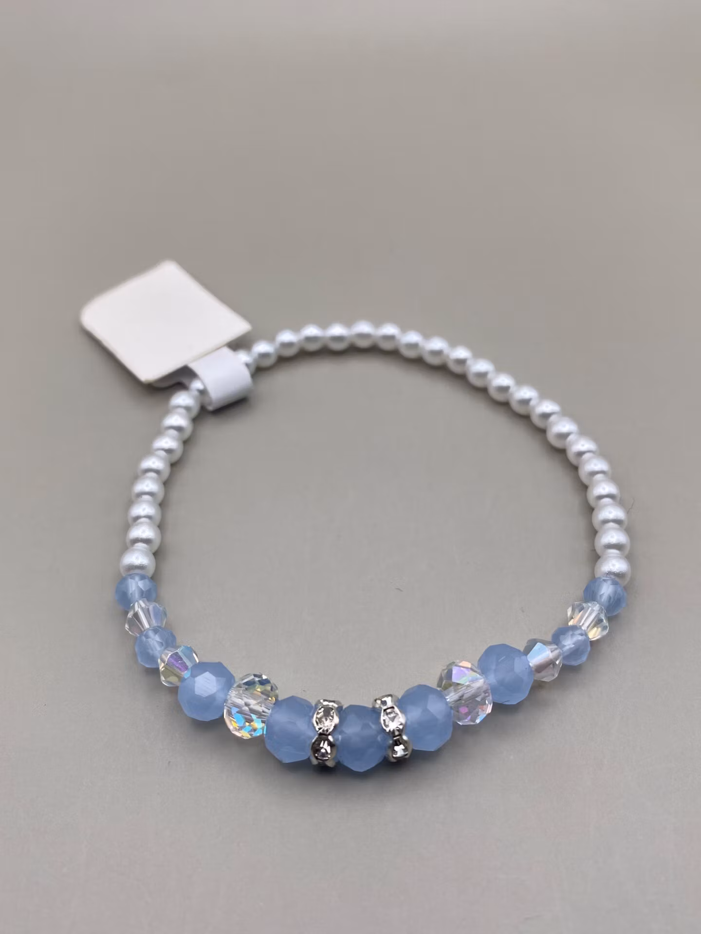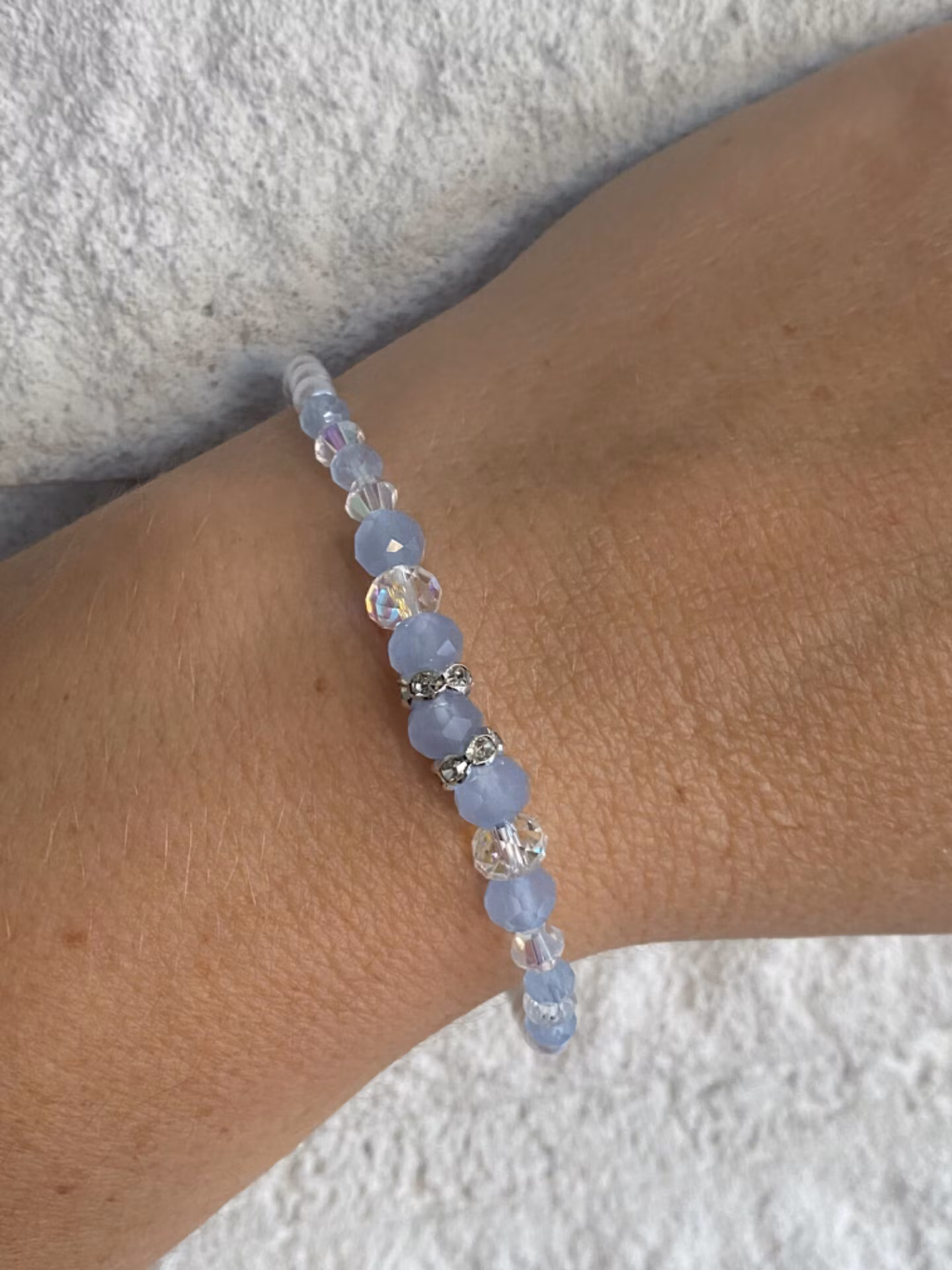 Elegant armband i mönster av små kritivita blanka pärlor runt om, ljusblå frostade glaspärlor varvat med silverfärgad strass och genomskinliga glaspärlor i blickfånget.