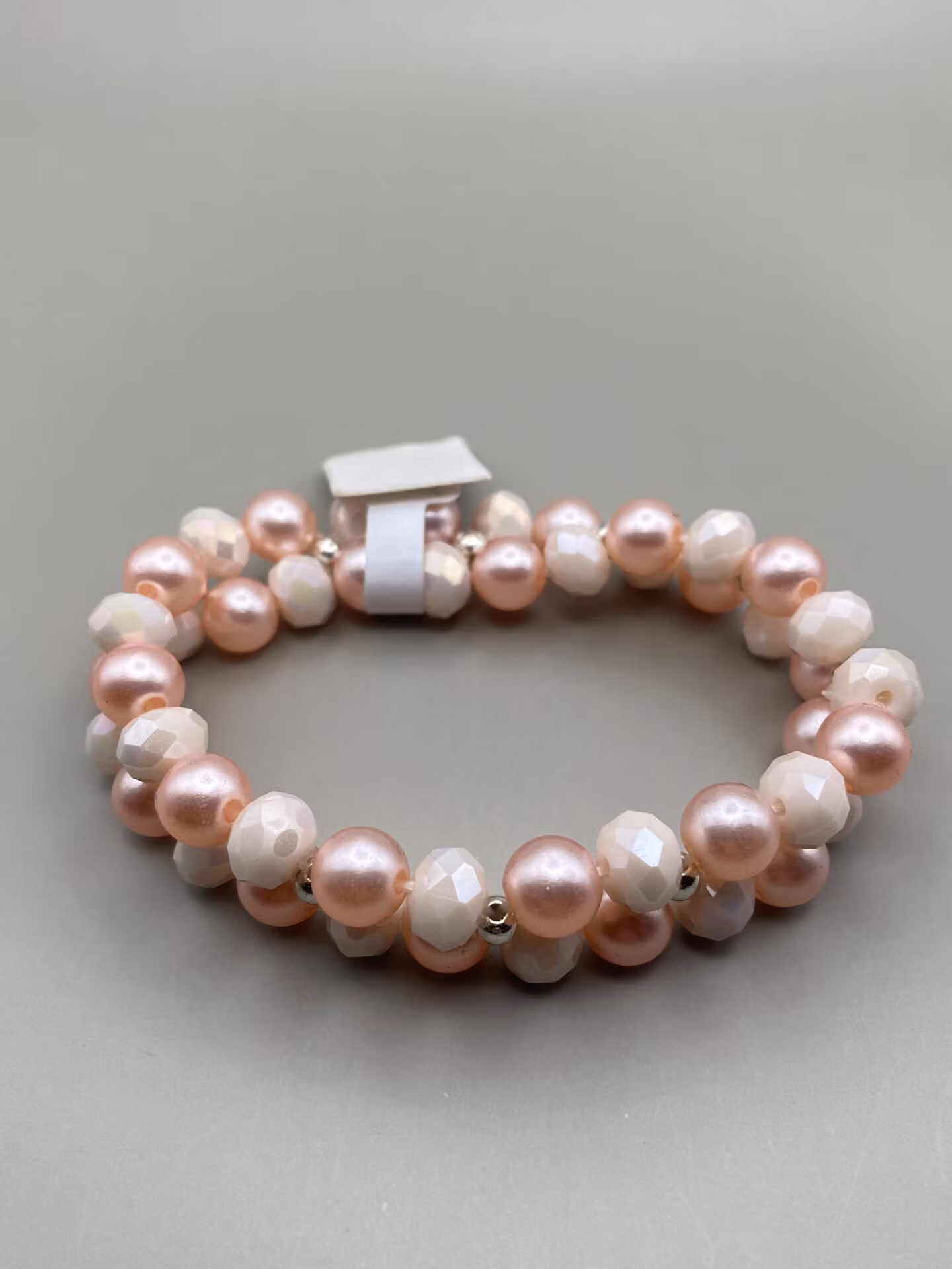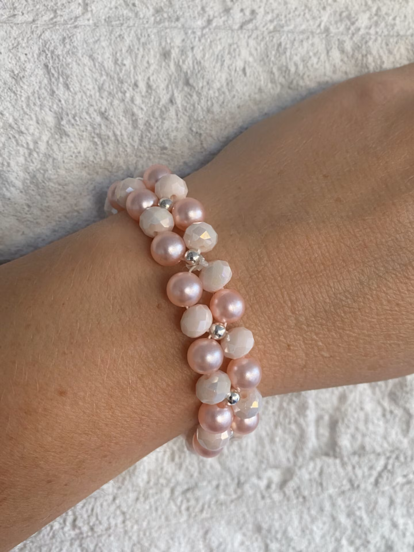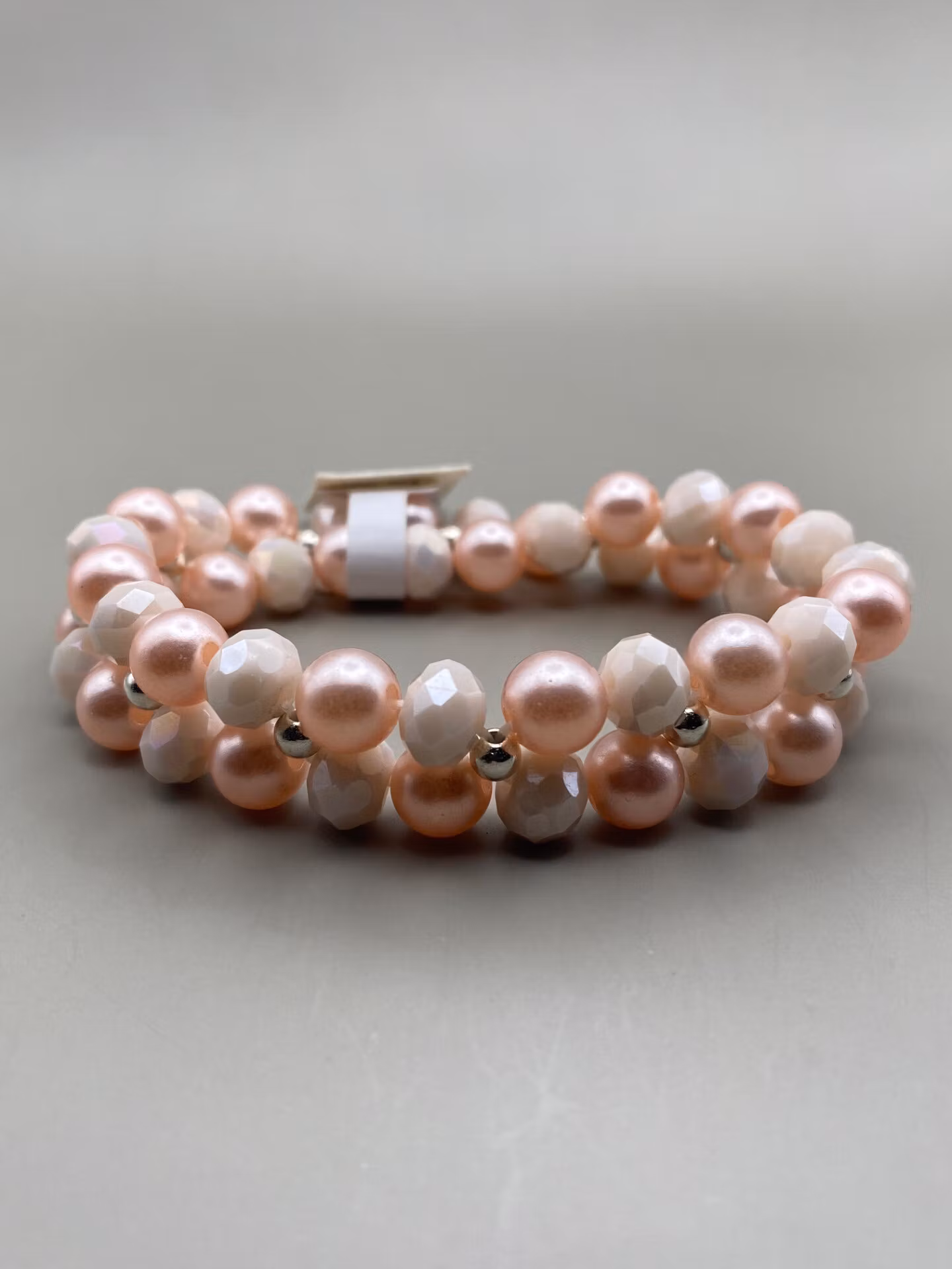 Fint brett armband i mönster av aprikosa blanka pärlor och svagt aprikosa glaspärlor och små silverfärgade pärlor