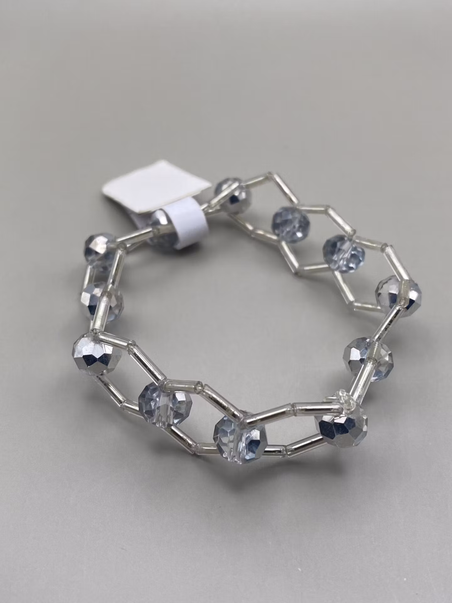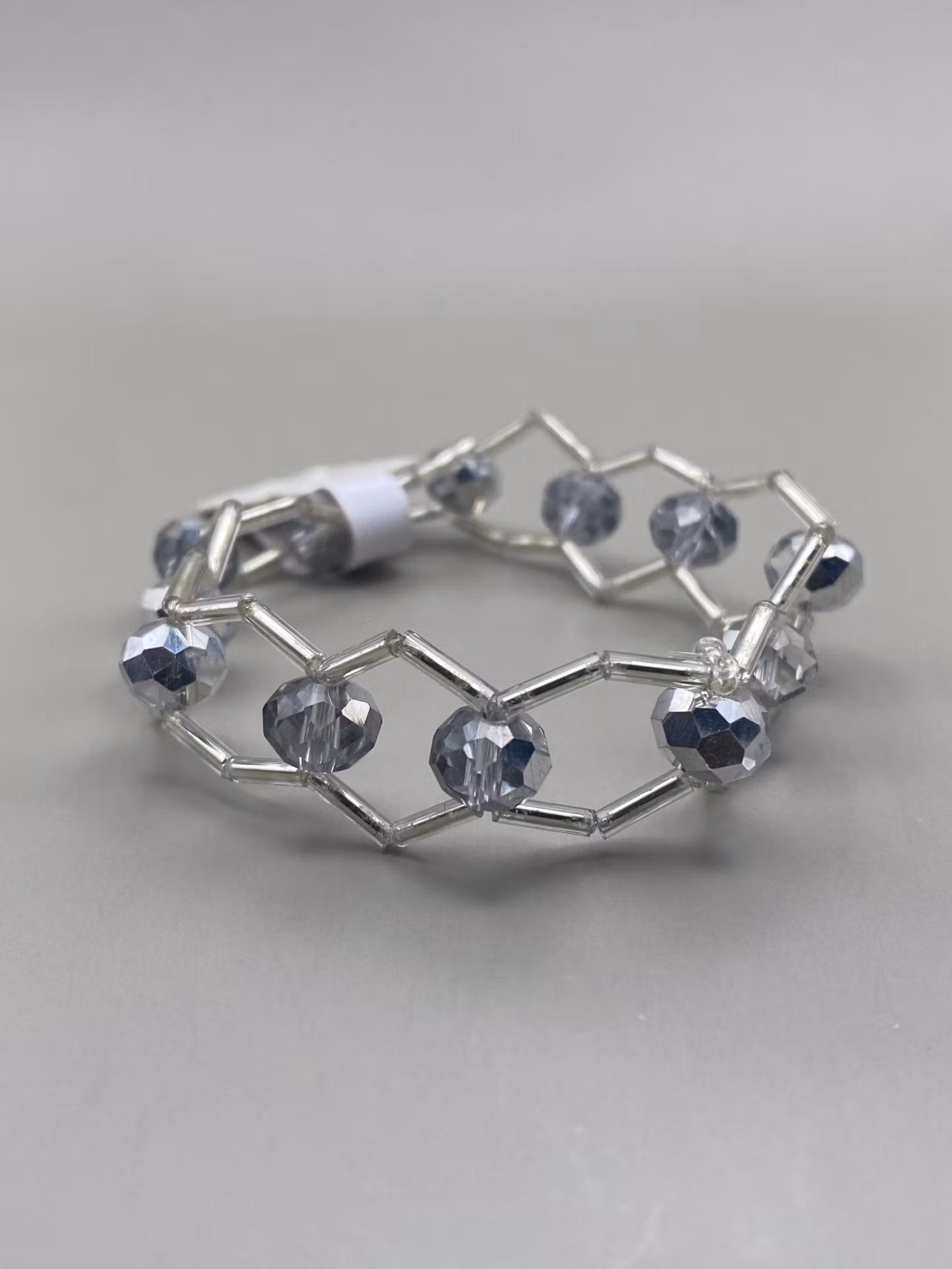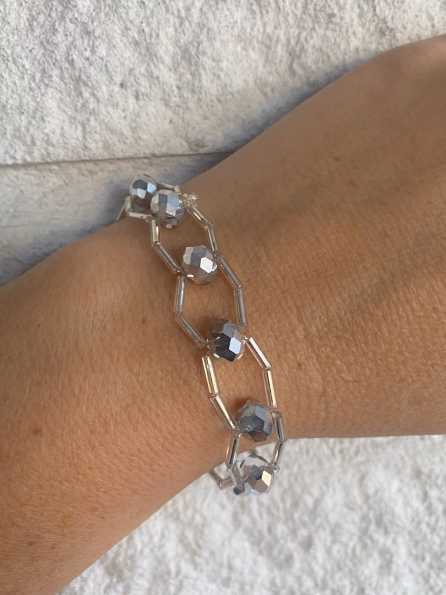 Tufft armband i brett mönster av avlånga silverfärgade glaspärlor varvat med stora ljust silvergrå glaspärlor.