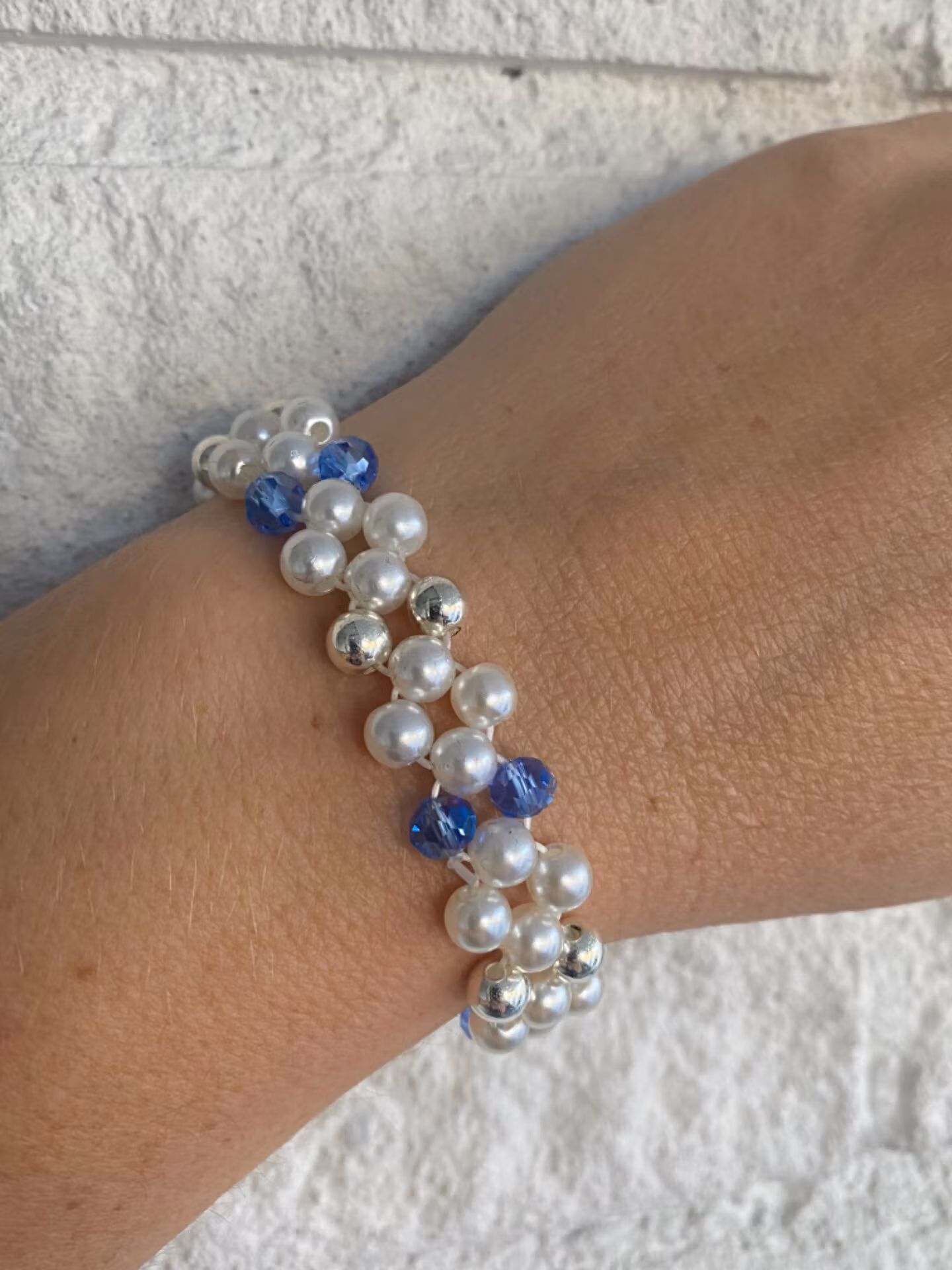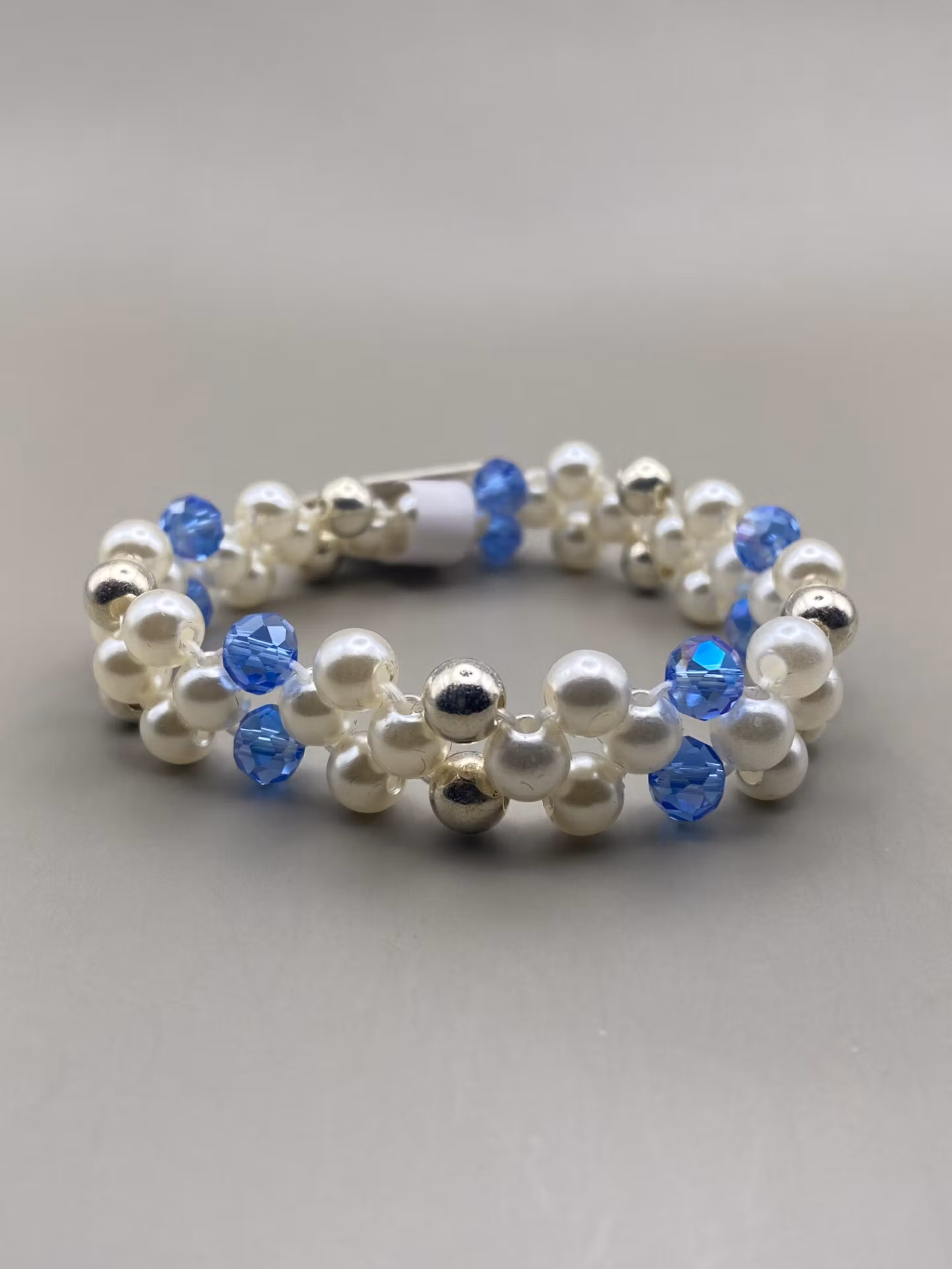 Vackert armband i brett mönster av kritvita glansiga pärlor, silverfärgade pärlor och mellanblå glaspärlor.